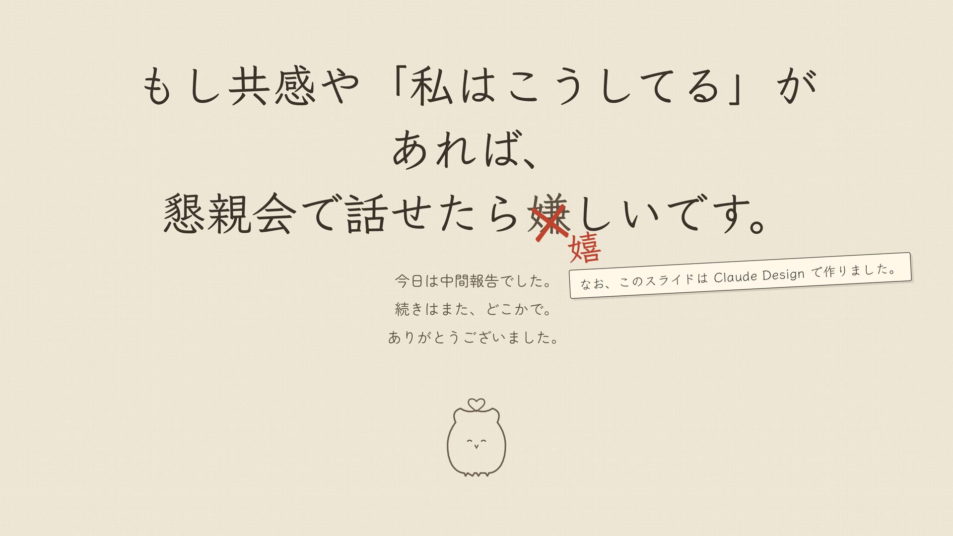 嬉 嬉 なお、このスライドは Claude Design で作りました。