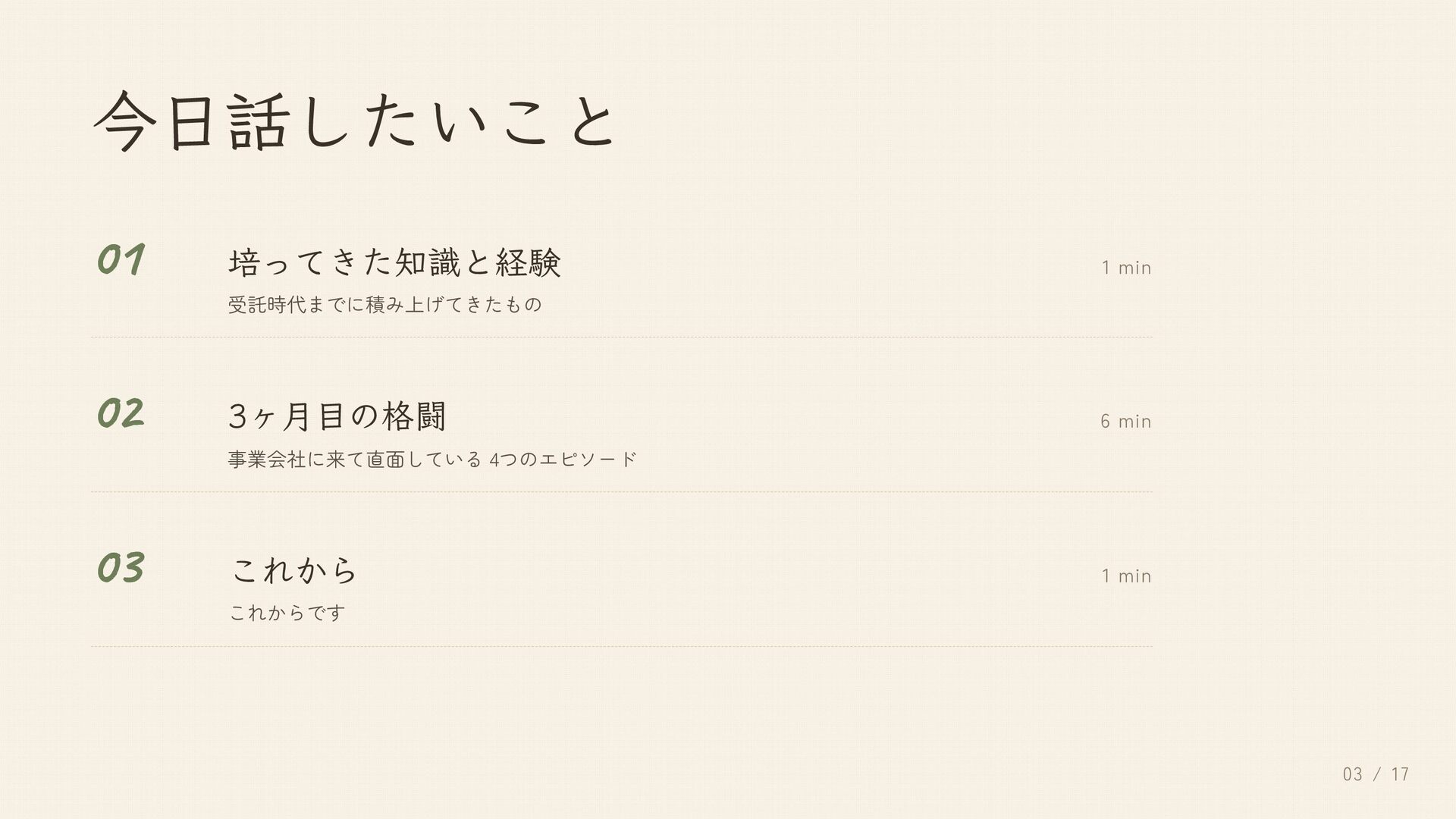 今日話したいこと 01 培ってきた知識と経験 受託時代までに積み上げてきたもの 1 min 02 3ヶ月目の格闘 事業会社に来て直面している 4つのエピソード
