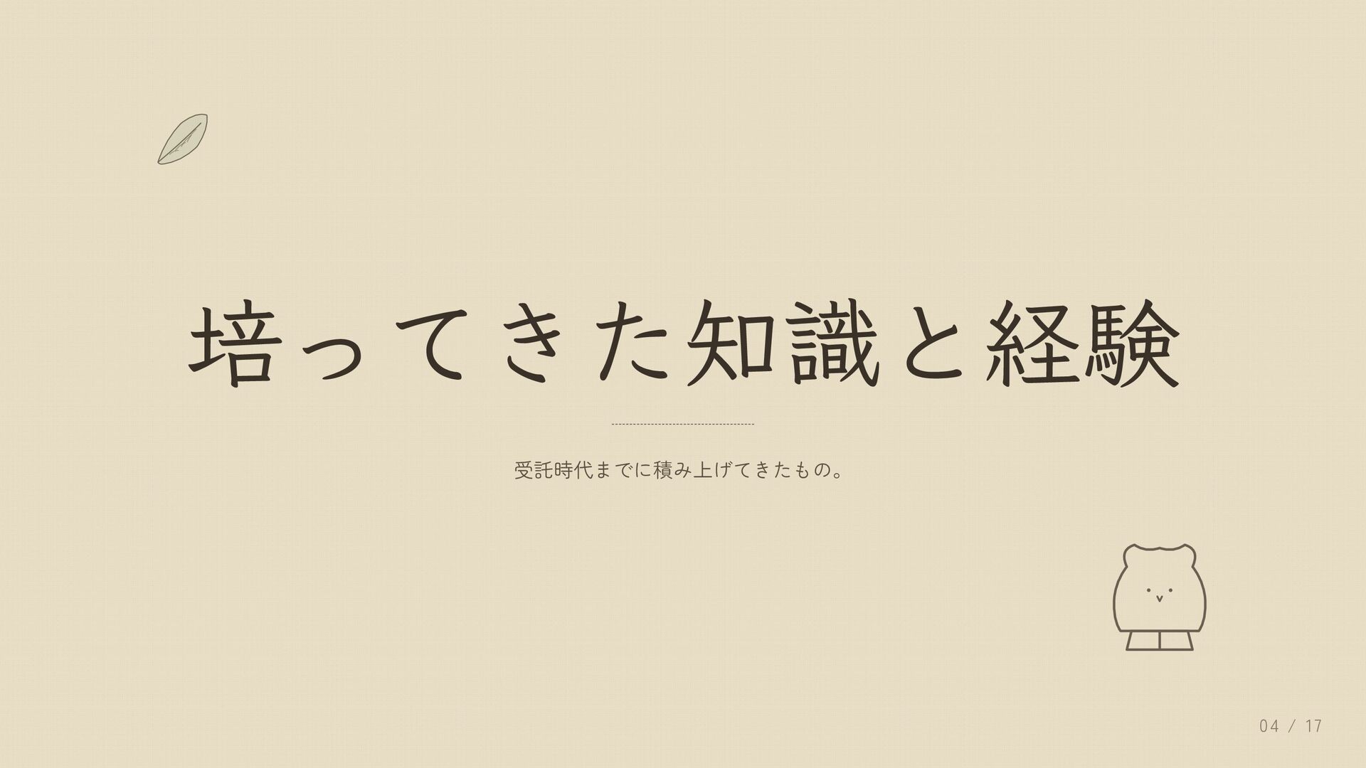 培ってきた知識と経験 受託時代までに積み上げてきたもの。 04 / 17