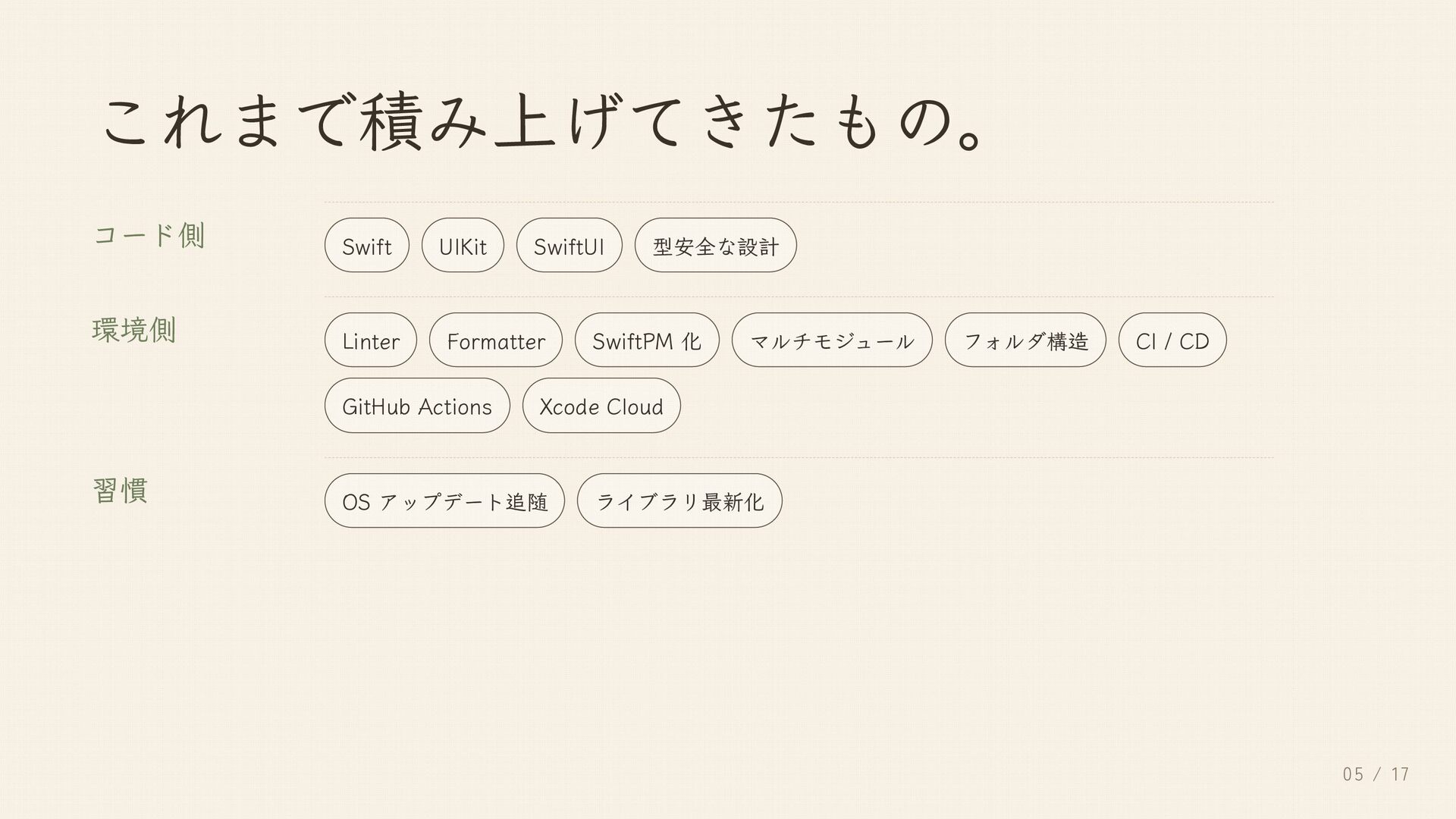 化 マルチモジュール フォルダ構造 CI / CD GitHub Actions Xcode Cloud 習慣 OS アップデート追随 ライブラリ最新化 05 / 17