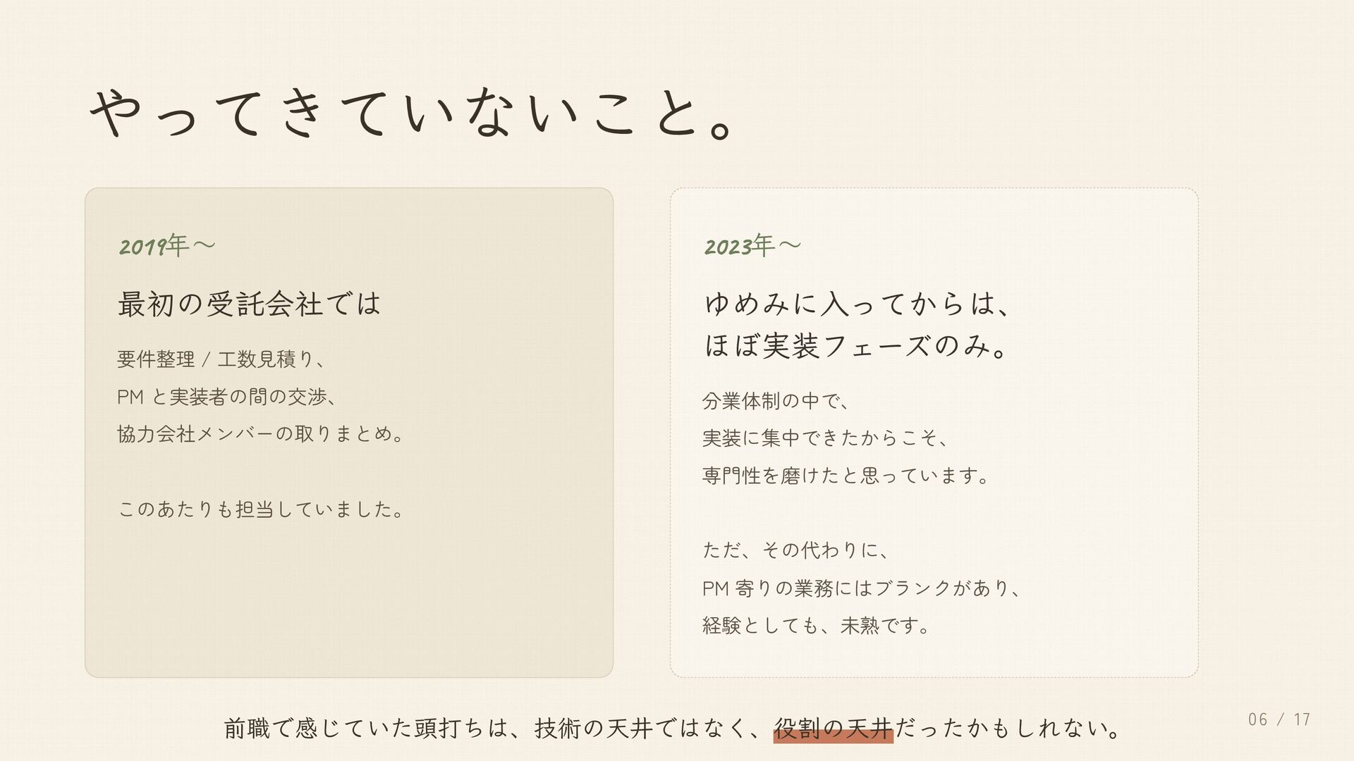 2023年〜 ゆめみに入ってからは、 ほぼ実装フェーズのみ。 分業体制の中で、 実装に集中できたからこそ、 専門性を磨けたと思っています。 ただ、その代わりに、 PM 寄りの業務にはブランクがあり、 経験としても、未熟です。 前職で感じていた頭打ちは、技術の天井ではなく、役割の天井だったかもしれない。 06 / 17