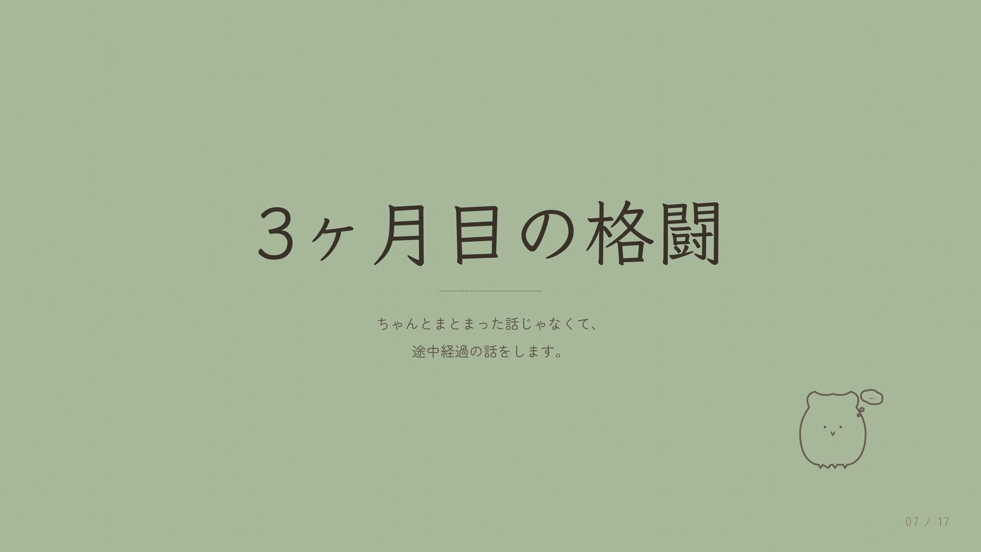 3ヶ月目の格闘 ちゃんとまとまった話じゃなくて、 途中経過の話をします。 ... 07 / 17
