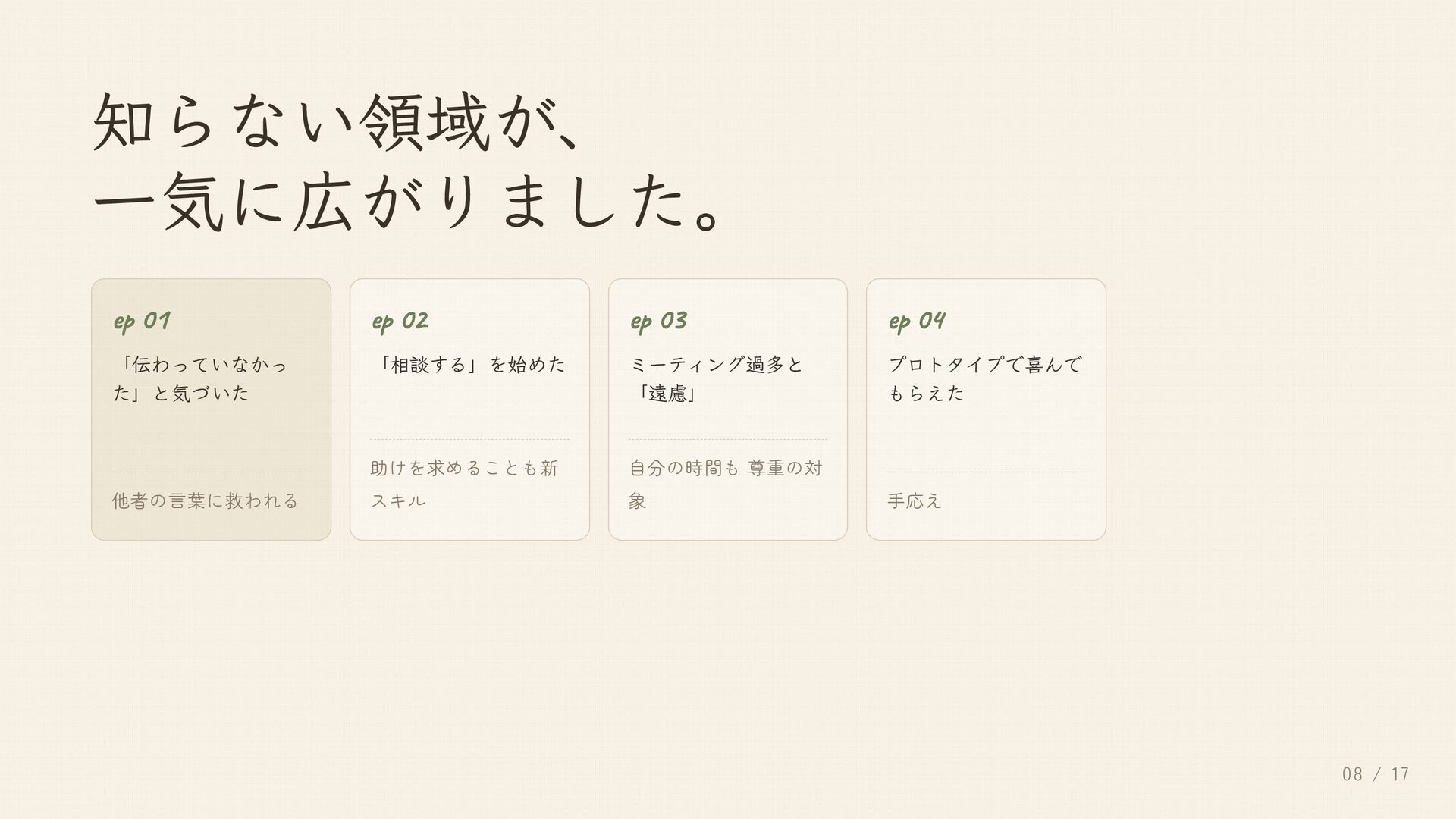 助けを求めることも新 スキル ep 03 ミーティング過多と 「遠慮」 自分の時間も 尊重の対 象 ep 04 プロトタイプで喜んで もらえた 手応え 08 / 17