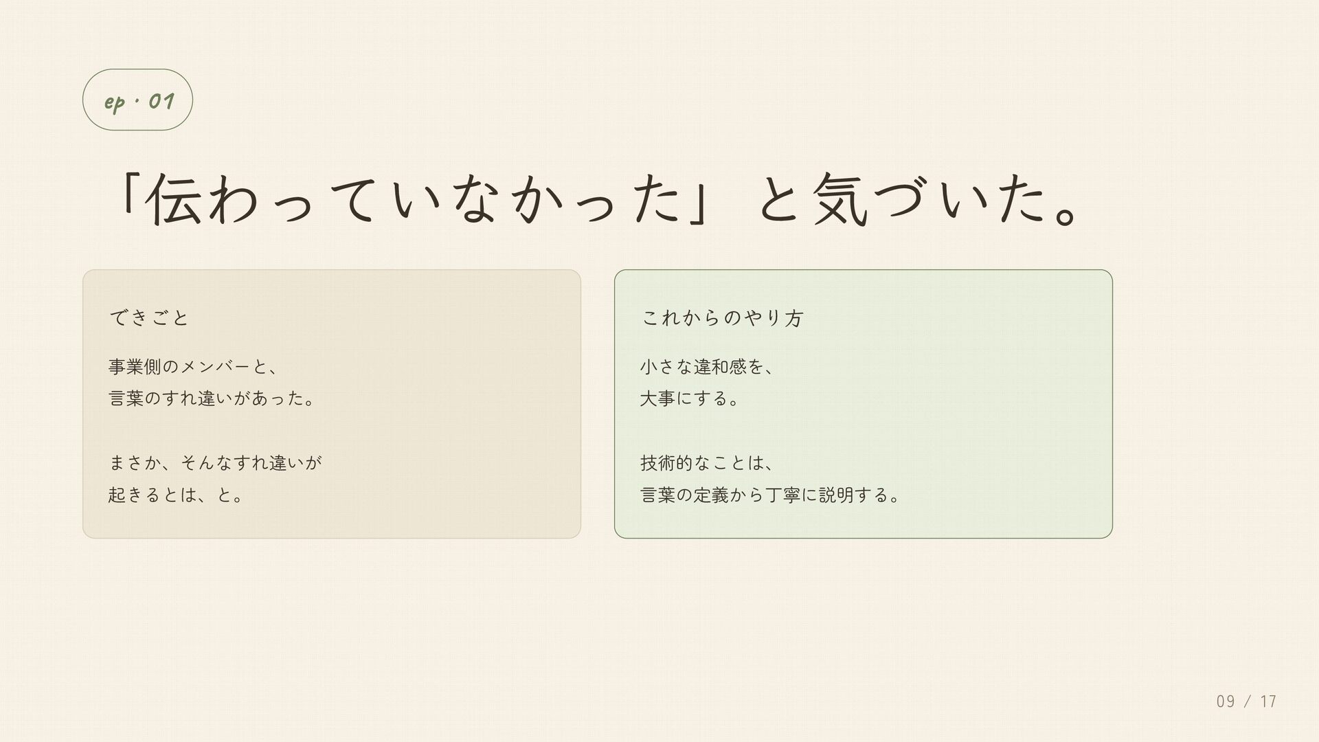 ep · 01 「伝わっていなかった」と気づいた。 できごと 事業側のメンバーと、 言葉のすれ違いがあった。 まさか、そんなすれ違いが 起きるとは、と。 これからのやり方