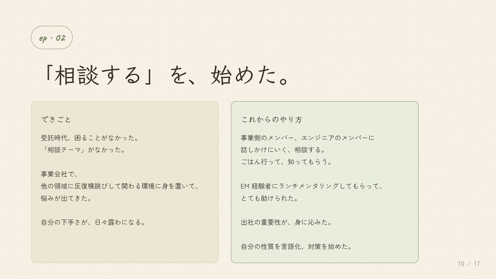ep · 02 「相談する」を、始めた。 できごと 受託時代、困ることがなかった。 「相談テーマ」がなかった。 事業会社で、 他の領域に反復横跳びして関わる環境に身を置いて、 悩みが出てきた。