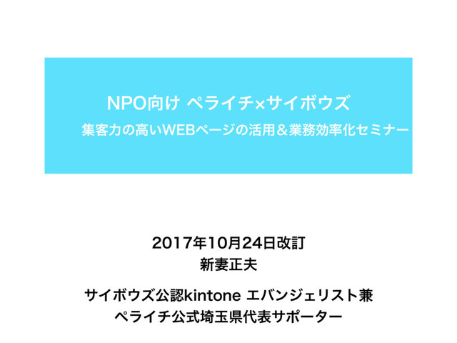 2017年10月2日に行いました「NPO向け ペライチ×サイボウズ 集客力の高いWEBページの活用&業務効率化」セミナー資料を元に当日のデモ内容のスクリーンショット他補足事項を追記したものです