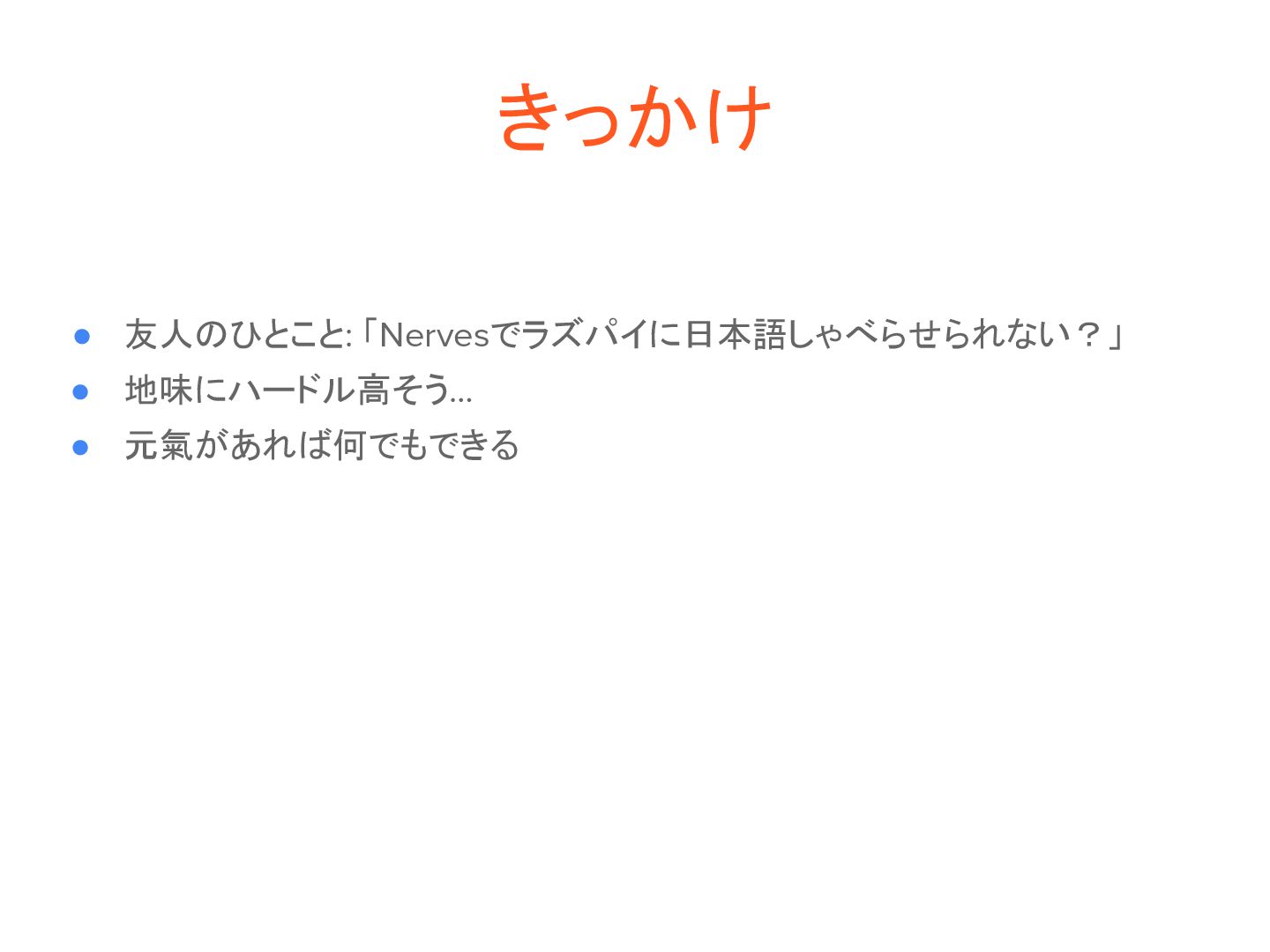 きっかけ • 友人のひとこと: 「Nervesでラズパイに日本語しゃべらせられない?」 • 地味にハードル高そう… • 元氣があれば何でもできる