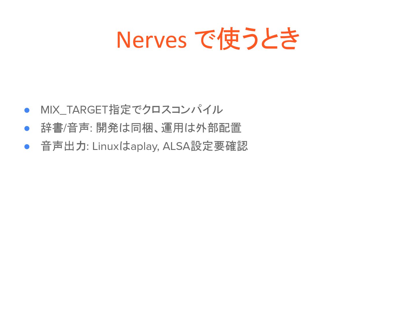 Nerves で使うとき • MIX_TARGET指定でクロスコンパイル • 辞書/音声: 開発は同梱、運用は外部配置 • 音声出力: Linuxはaplay,