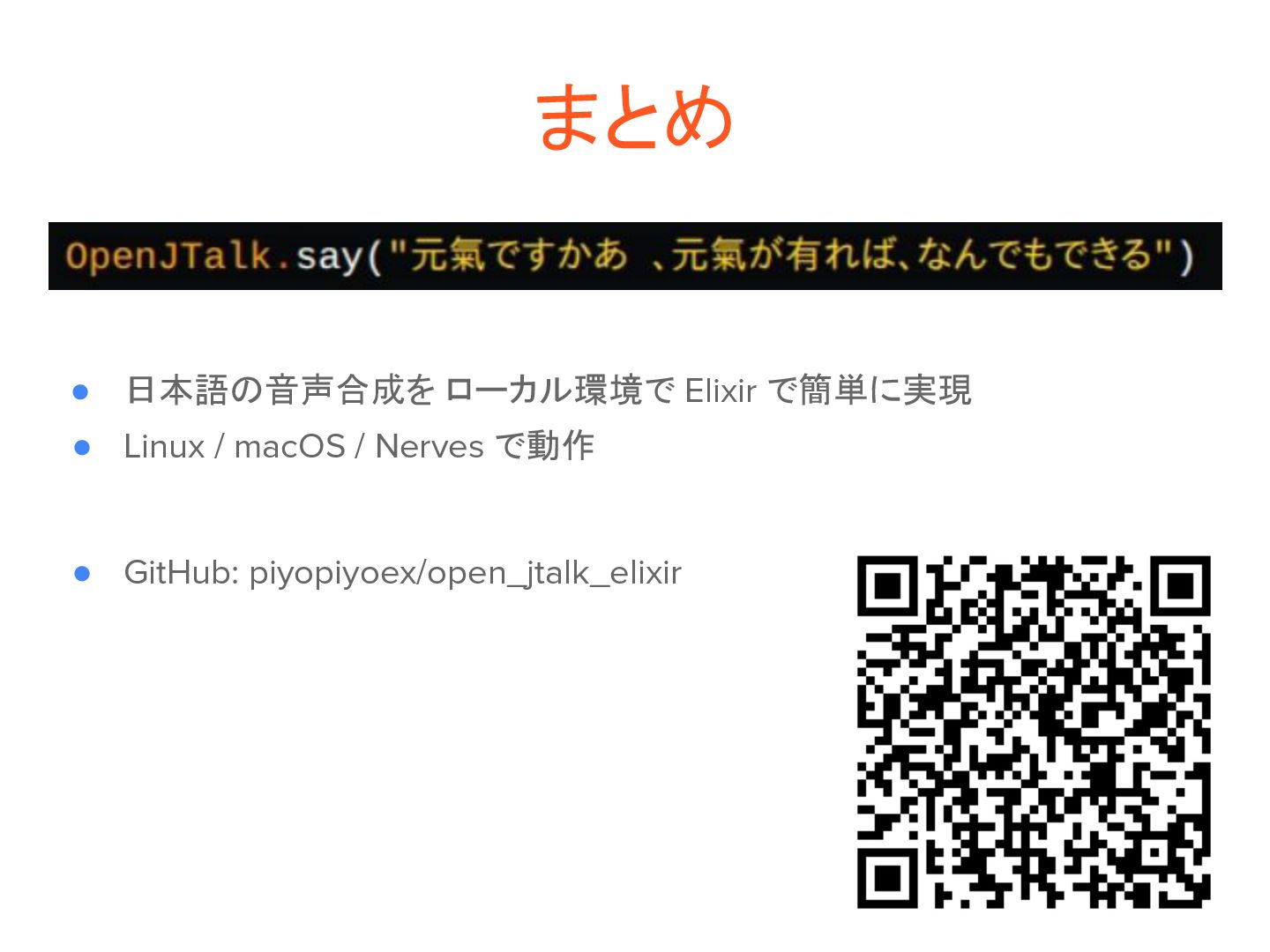 まとめ • 日本語の音声合成を ローカル環境で Elixir で簡単に実現 • Linux / macOS