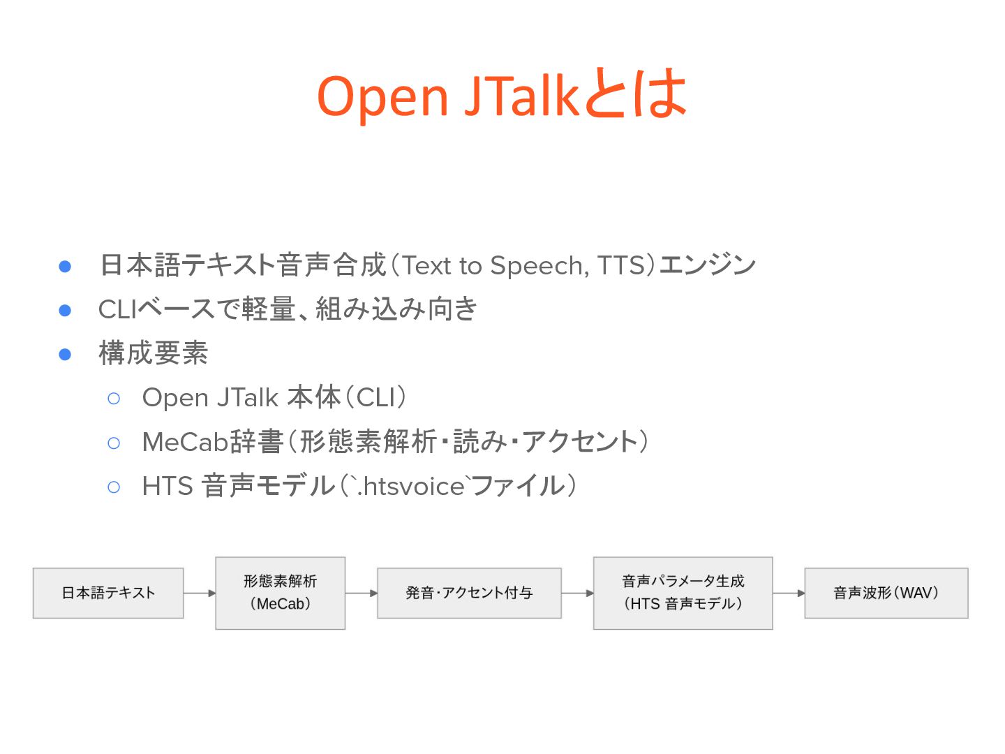 構成要素 ◦ Open JTalk 本体(CLI) ◦ MeCab辞書(形態素解析・読み・アクセント) ◦ HTS 音声モデル(`.htsvoice`ファイル)