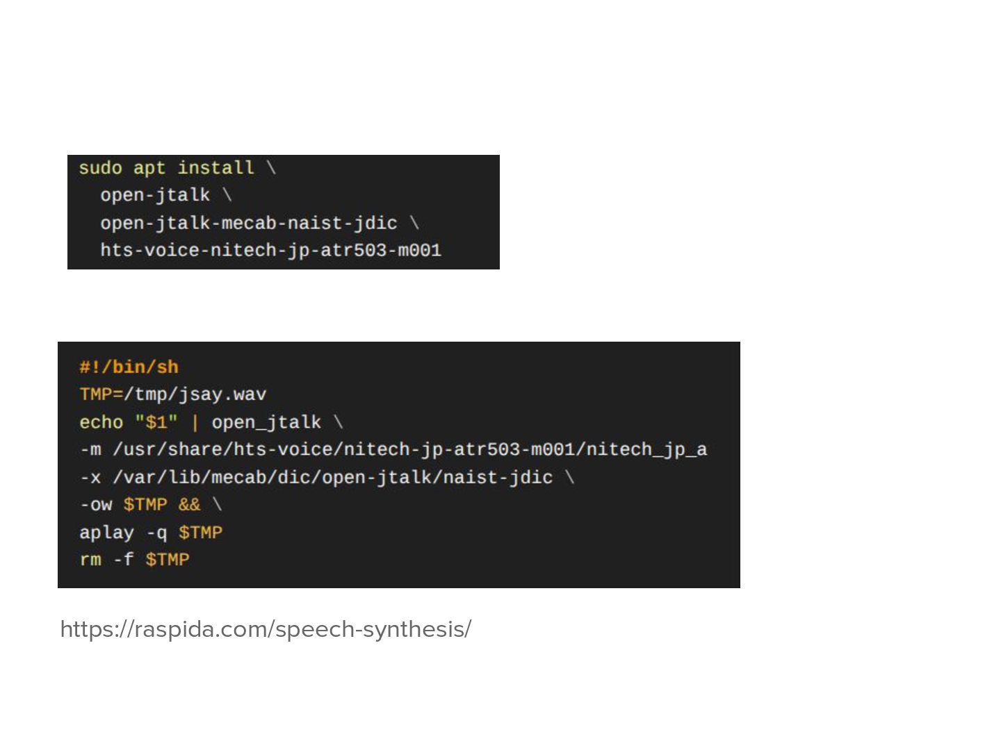 Open JTalkとは • 日本語テキスト音声合成(Text to Speech, TTS)エンジン • CLIベースで軽量、組み込み向き •