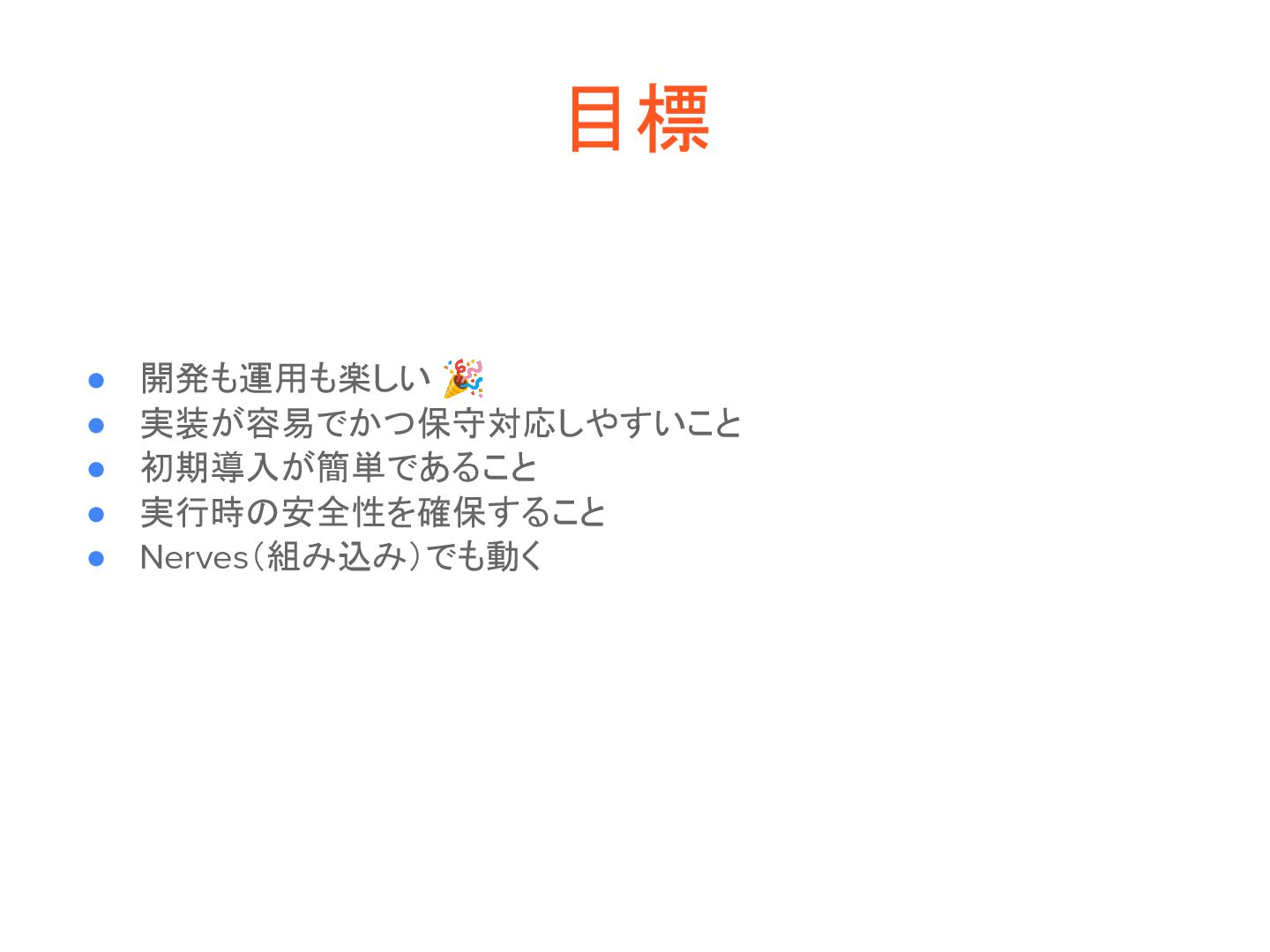 目標 • 開発も運用も楽しい 🎉 • 実装が容易でかつ保守対応しやすいこと • 初期導入が簡単であること • 実行時の安全性を確保すること