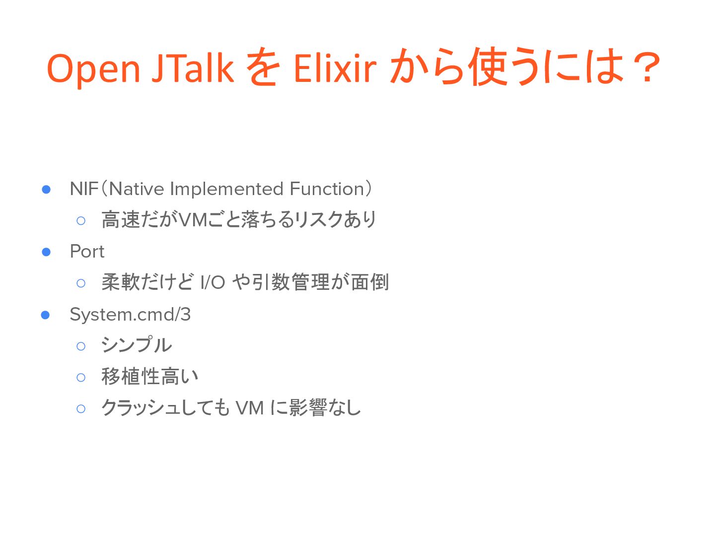 Open JTalk を Elixir から使うには? • NIF(Native Implemented Function) ◦