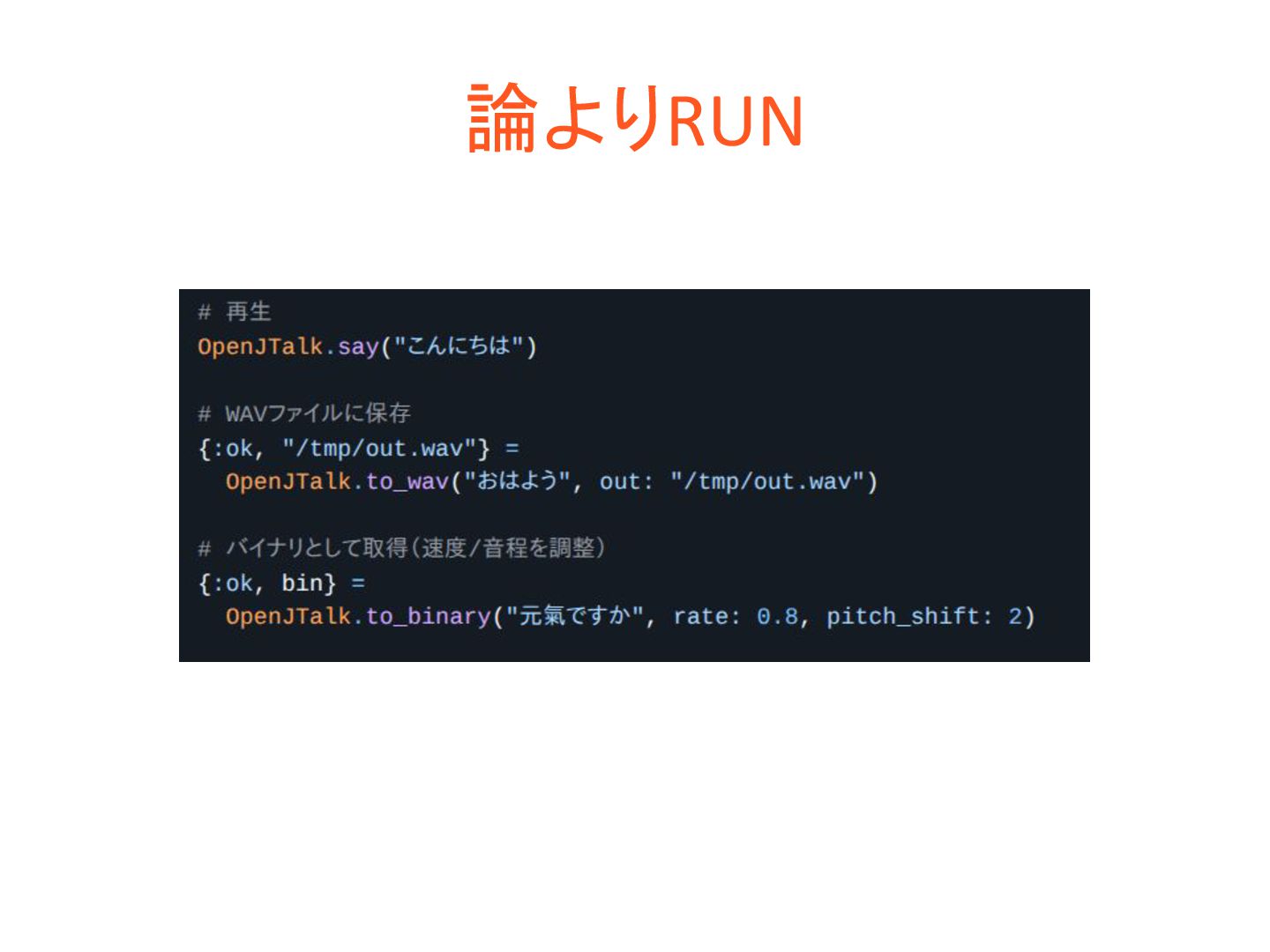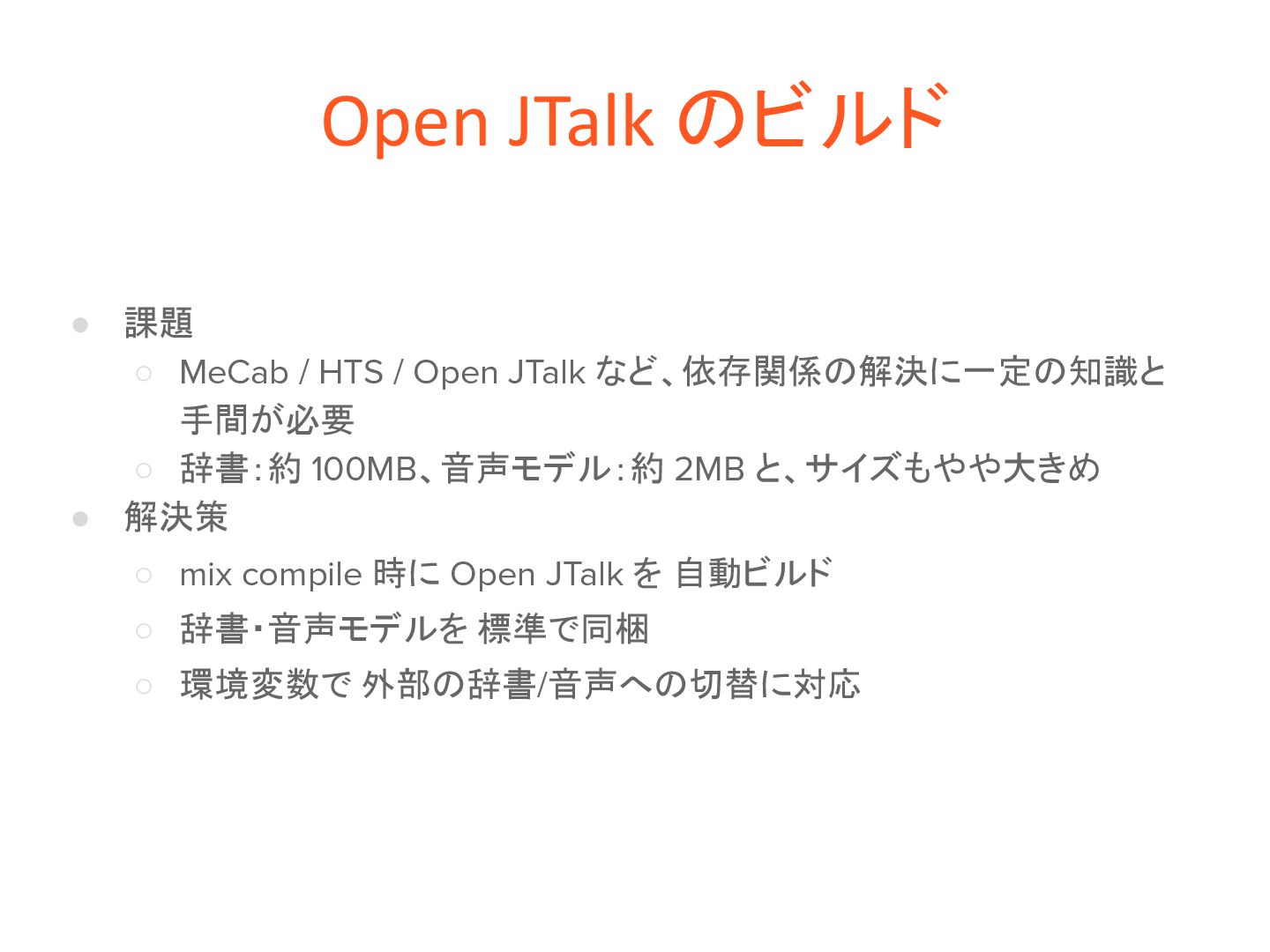 Open JTalk など、依存関係の解決に一定の知識と 手間が必要 ◦ 辞書:約 100MB、音声モデル:約 2MB と、サイズもやや大きめ • 解決策 ◦ mix compile 時に Open JTalk を 自動ビルド ◦ 辞書・音声モデルを 標準で同梱 ◦ 環境変数で 外部の辞書/音声への切替に対応