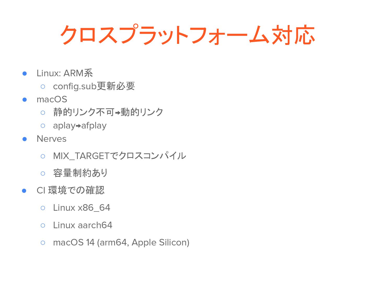 ◦ aplay→afplay • Nerves ◦ MIX_TARGETでクロスコンパイル ◦ 容量制約あり • CI 環境での確認 ◦ Linux x86_64 ◦ Linux aarch64 ◦ macOS 14 (arm64, Apple Silicon)