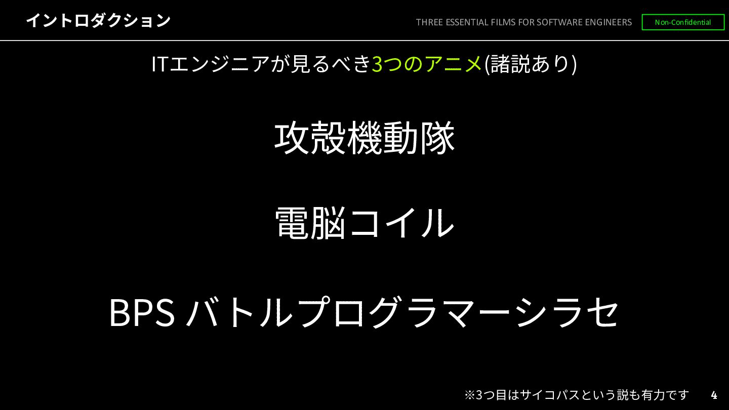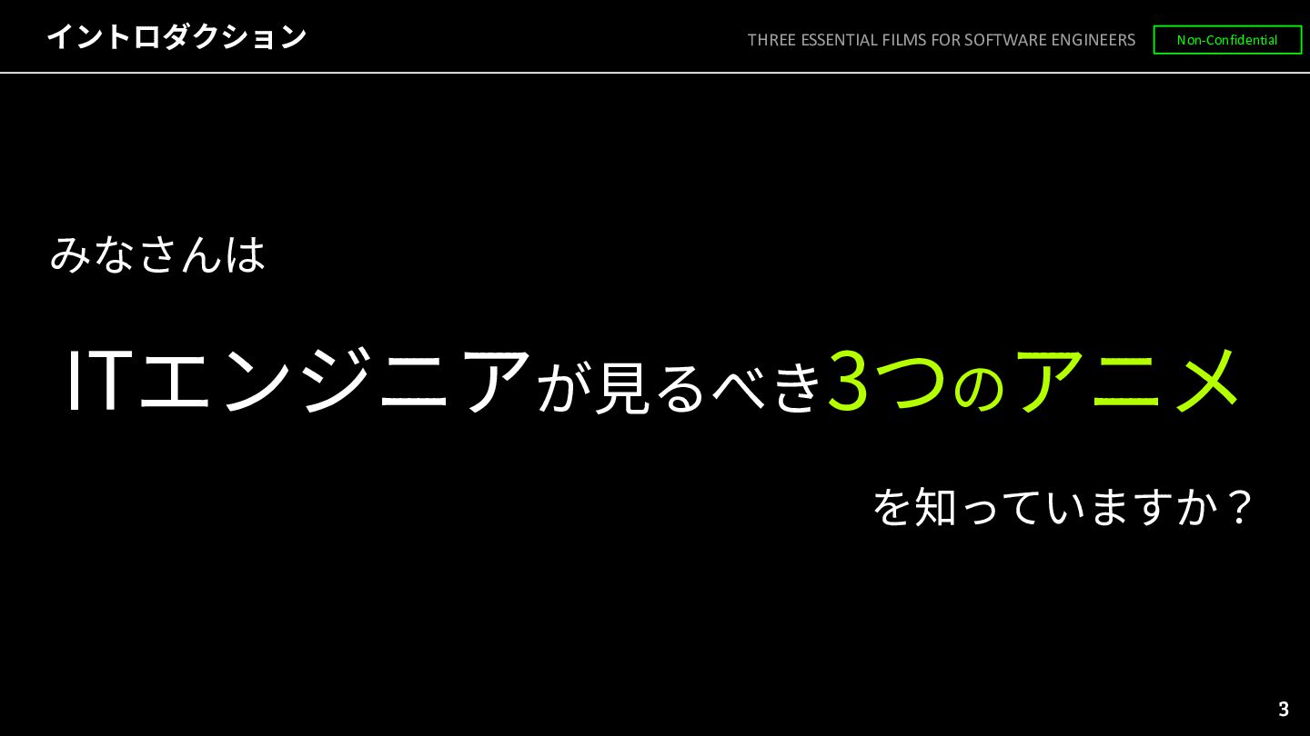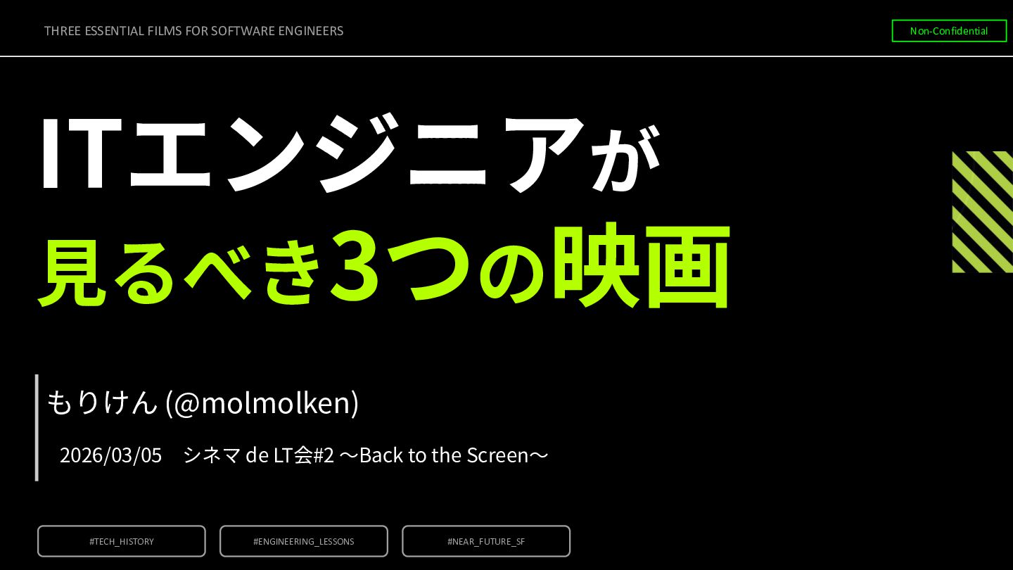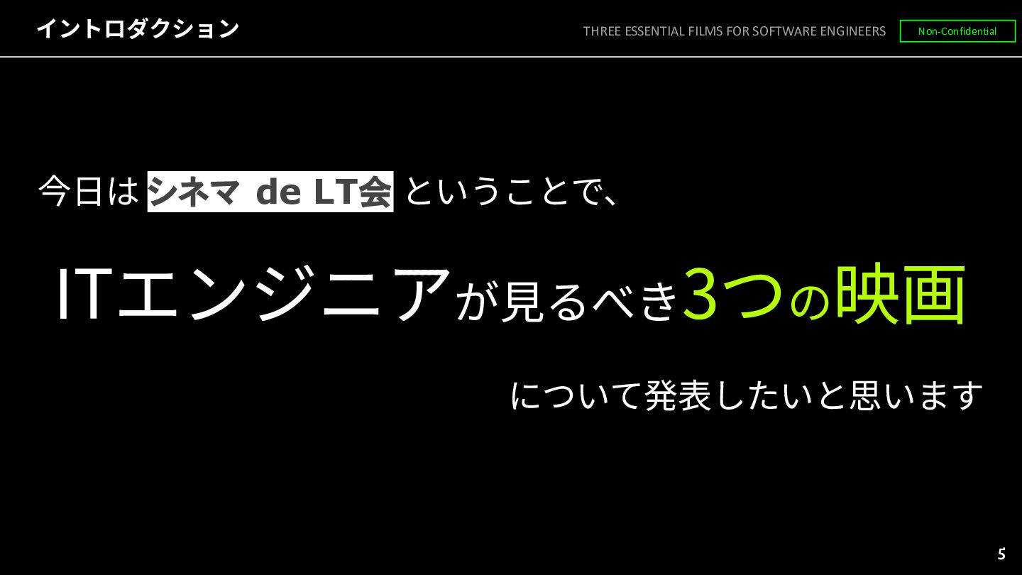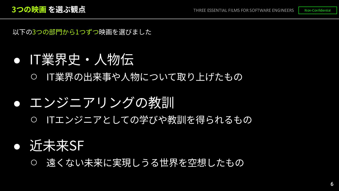 ◦ ITエンジニアとしての学びや教訓を得られるもの • 近未来SF ◦ 遠くない未来に実現しうる世界を空想したもの THREE ESSENTIAL FILMS FOR SOFTWARE ENGINEERS Non-Confidential