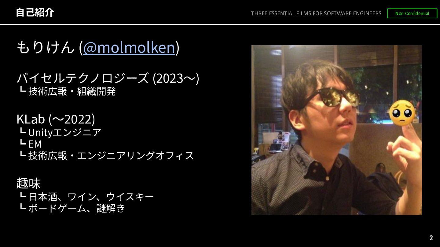 Unityエンジニア ┗ EM ┗ 技術広報‧エンジニアリングオフィス 趣味 ┗ ⽇本酒、ワイン、ウイスキー ┗ ボードゲーム、謎解き   2 THREE ESSENTIAL FILMS FOR SOFTWARE ENGINEERS Non-Confidential