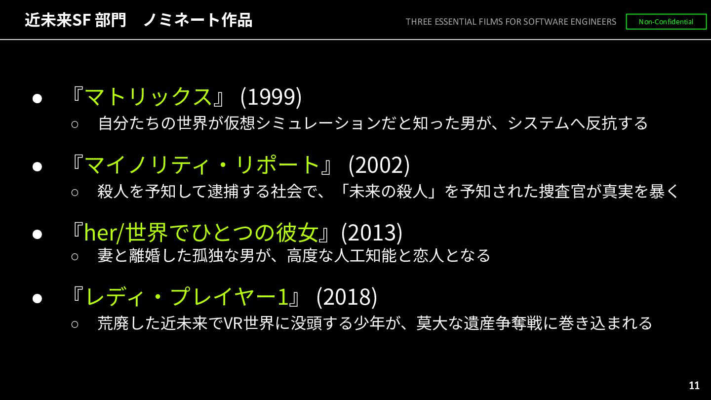 (2002) ◦ 殺⼈を予知して逮捕する社会で、「未来の殺⼈」を予知された捜査官が真実を暴く • 『her/世界でひとつの彼⼥』(2013) ◦ 妻と離婚した孤独な男が、⾼度な⼈⼯知能と恋⼈となる • 『レディ‧プレイヤー1』 (2018) ◦ 荒廃した近未来でVR世界に没頭する少年が、莫⼤な遺産争奪戦に巻き込まれる THREE ESSENTIAL FILMS FOR SOFTWARE ENGINEERS Non-Confidential