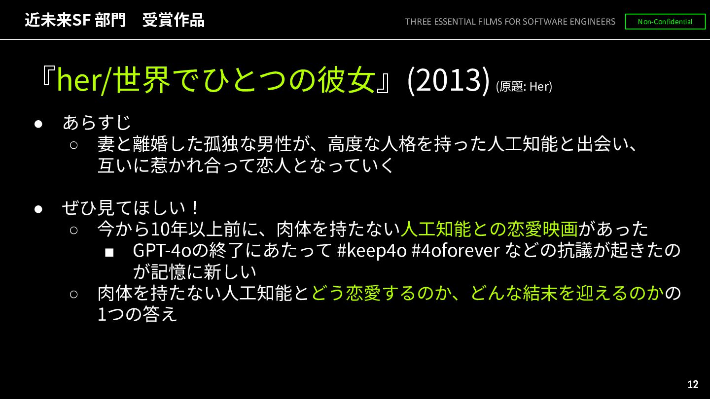 互いに惹かれ合って恋⼈となっていく • ぜひ⾒てほしい! ◦ 今から10年以上前に、⾁体を持たない⼈⼯知能との恋愛映画があった ▪ GPT-4oの終了にあたって #keep4o #4oforever などの抗議が起きたの が記憶に新しい ◦ ⾁体を持たない⼈⼯知能とどう恋愛するのか、どんな結末を迎えるのかの 1つの答え THREE ESSENTIAL FILMS FOR SOFTWARE ENGINEERS Non-Confidential