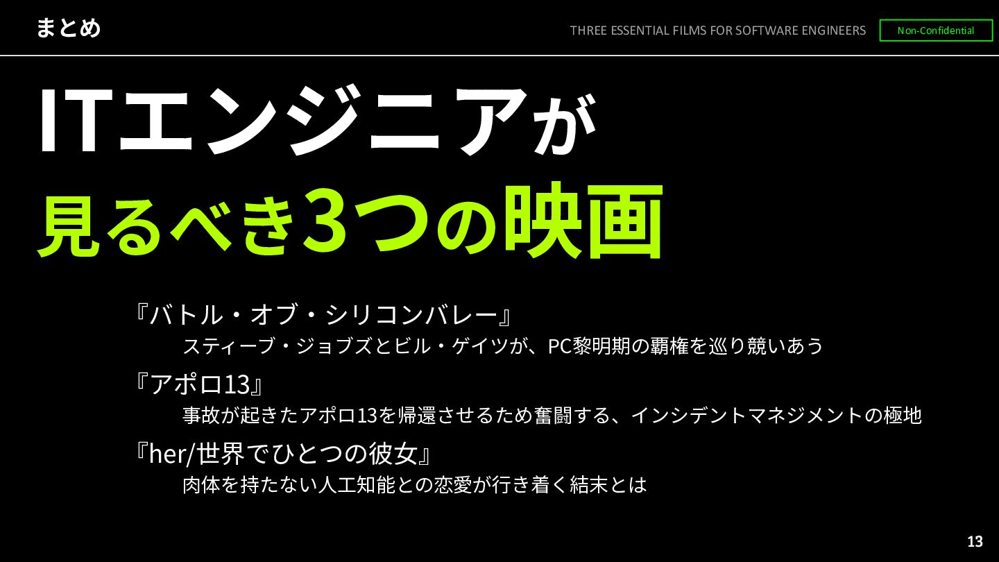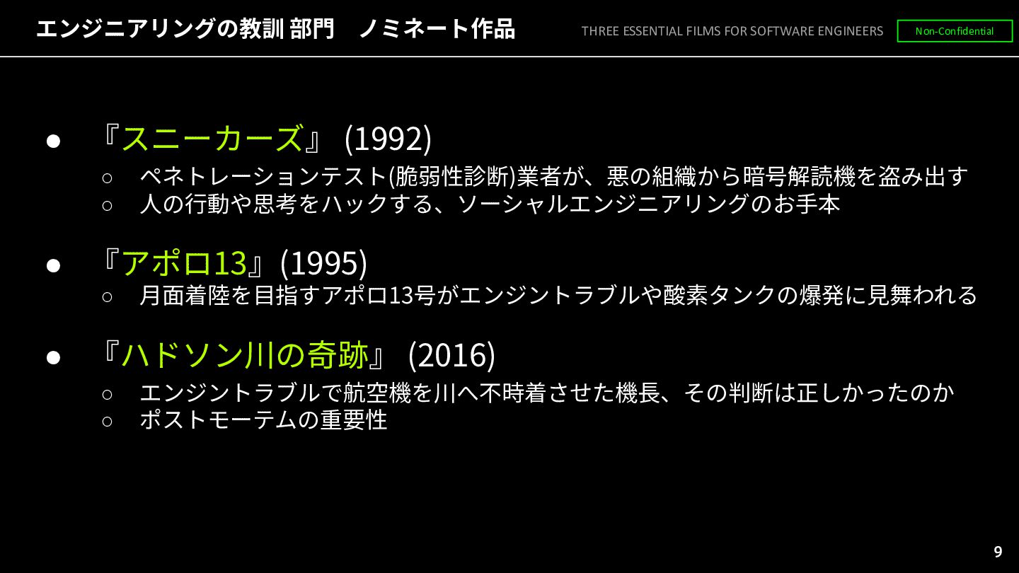• 『アポロ13』(1995) ◦ ⽉⾯着陸を⽬指すアポロ13号がエンジントラブルや酸素タンクの爆発に⾒舞われる • 『ハドソン川の奇跡』 (2016) ◦ エンジントラブルで航空機を川へ不時着させた機⻑、その判断は正しかったのか ◦ ポストモーテムの重要性 THREE ESSENTIAL FILMS FOR SOFTWARE ENGINEERS Non-Confidential