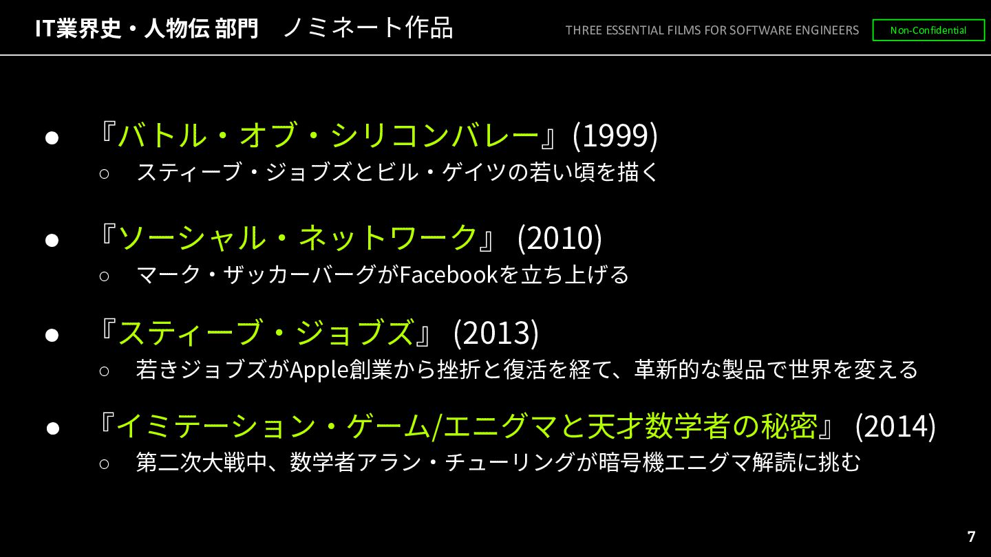 ◦ マーク‧ザッカーバーグがFacebookを⽴ち上げる • 『スティーブ‧ジョブズ』 (2013) ◦ 若きジョブズがApple創業から挫折と復活を経て、⾰新的な製品で世界を変える • 『イミテーション‧ゲーム/エニグマと天才数学者の秘密』 (2014) ◦ 第⼆次⼤戦中、数学者アラン‧チューリングが暗号機エニグマ解読に挑む THREE ESSENTIAL FILMS FOR SOFTWARE ENGINEERS Non-Confidential