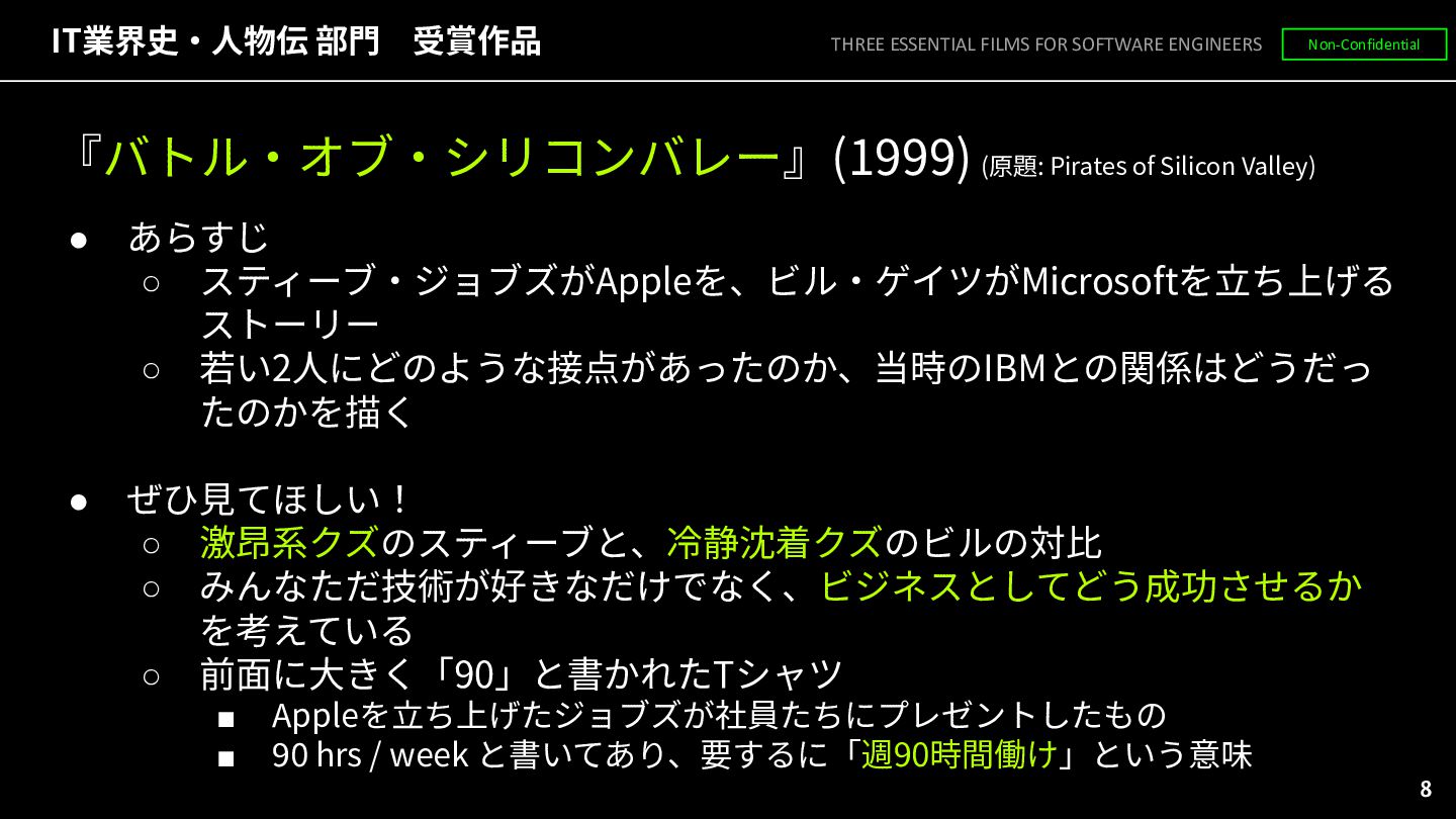 あらすじ ◦ スティーブ‧ジョブズがAppleを、ビル‧ゲイツがMicrosoftを⽴ち上げる ストーリー ◦ 若い2⼈にどのような接点があったのか、当時のIBMとの関係はどうだっ たのかを描く • ぜひ⾒てほしい! ◦ 激昂系クズのスティーブと、冷静沈着クズのビルの対⽐ ◦ みんなただ技術が好きなだけでなく、ビジネスとしてどう成功させるか を考えている ◦ 前⾯に⼤きく「90」と書かれたTシャツ ▪ Appleを⽴ち上げたジョブズが社員たちにプレゼントしたもの ▪ 90 hrs / week と書いてあり、要するに「週90時間働け」という意味 THREE ESSENTIAL FILMS FOR SOFTWARE ENGINEERS Non-Confidential