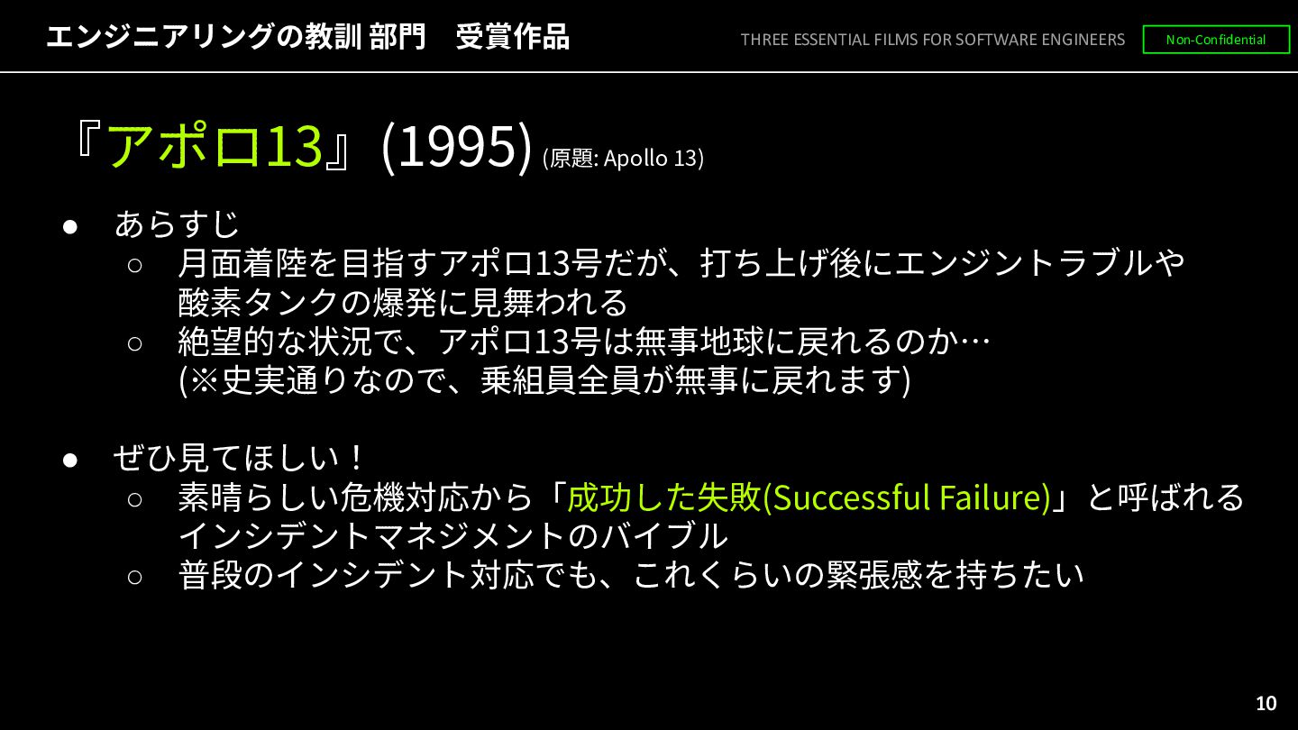 ⽉⾯着陸を⽬指すアポロ13号だが、打ち上げ後にエンジントラブルや 酸素タンクの爆発に⾒舞われる ◦ 絶望的な状況で、アポロ13号は無事地球に戻れるのか… (※史実通りなので、乗組員全員が無事に戻れます) • ぜひ⾒てほしい! ◦ 素晴らしい危機対応から「成功した失敗(Successful Failure)」と呼ばれる インシデントマネジメントのバイブル ◦ 普段のインシデント対応でも、これくらいの緊張感を持ちたい THREE ESSENTIAL FILMS FOR SOFTWARE ENGINEERS Non-Confidential