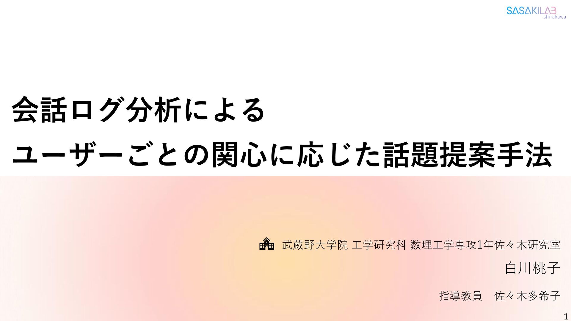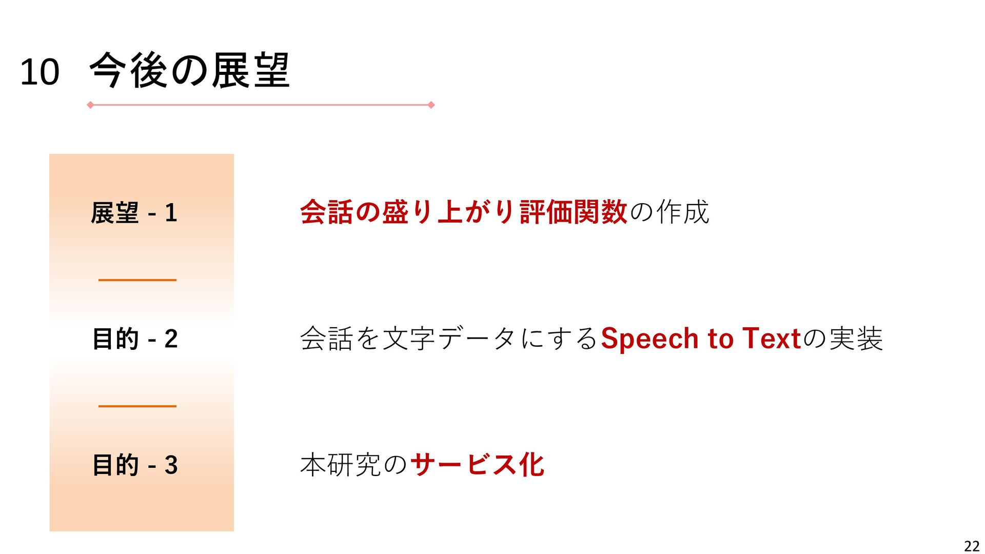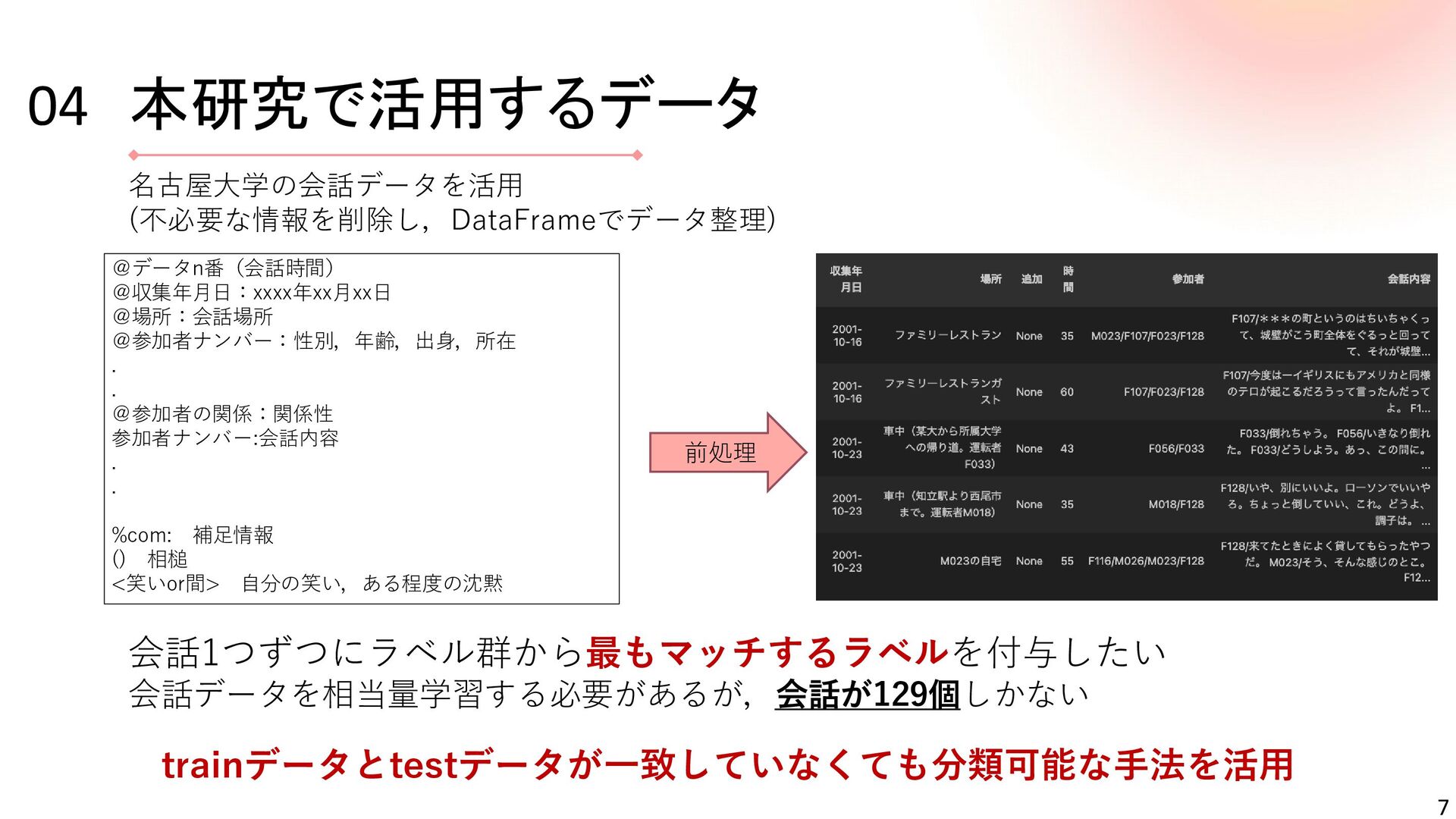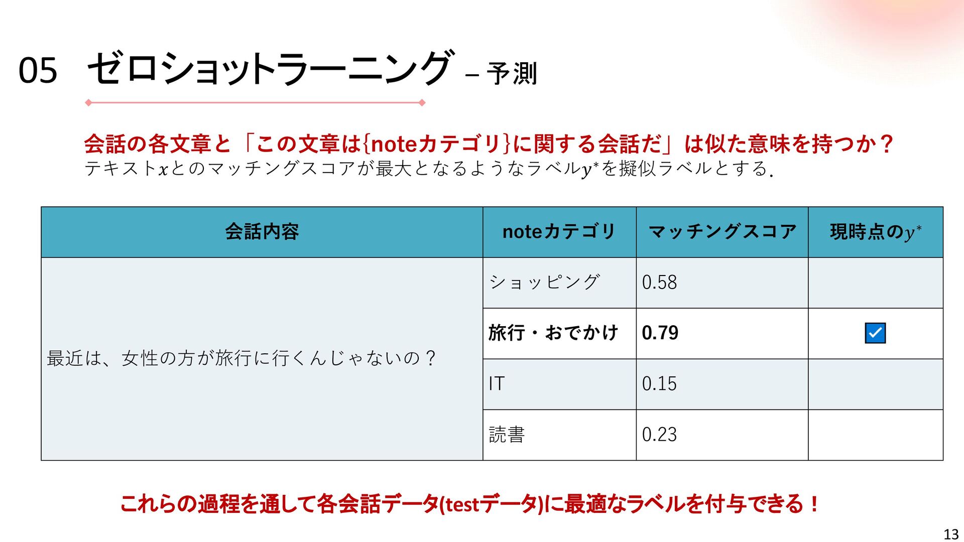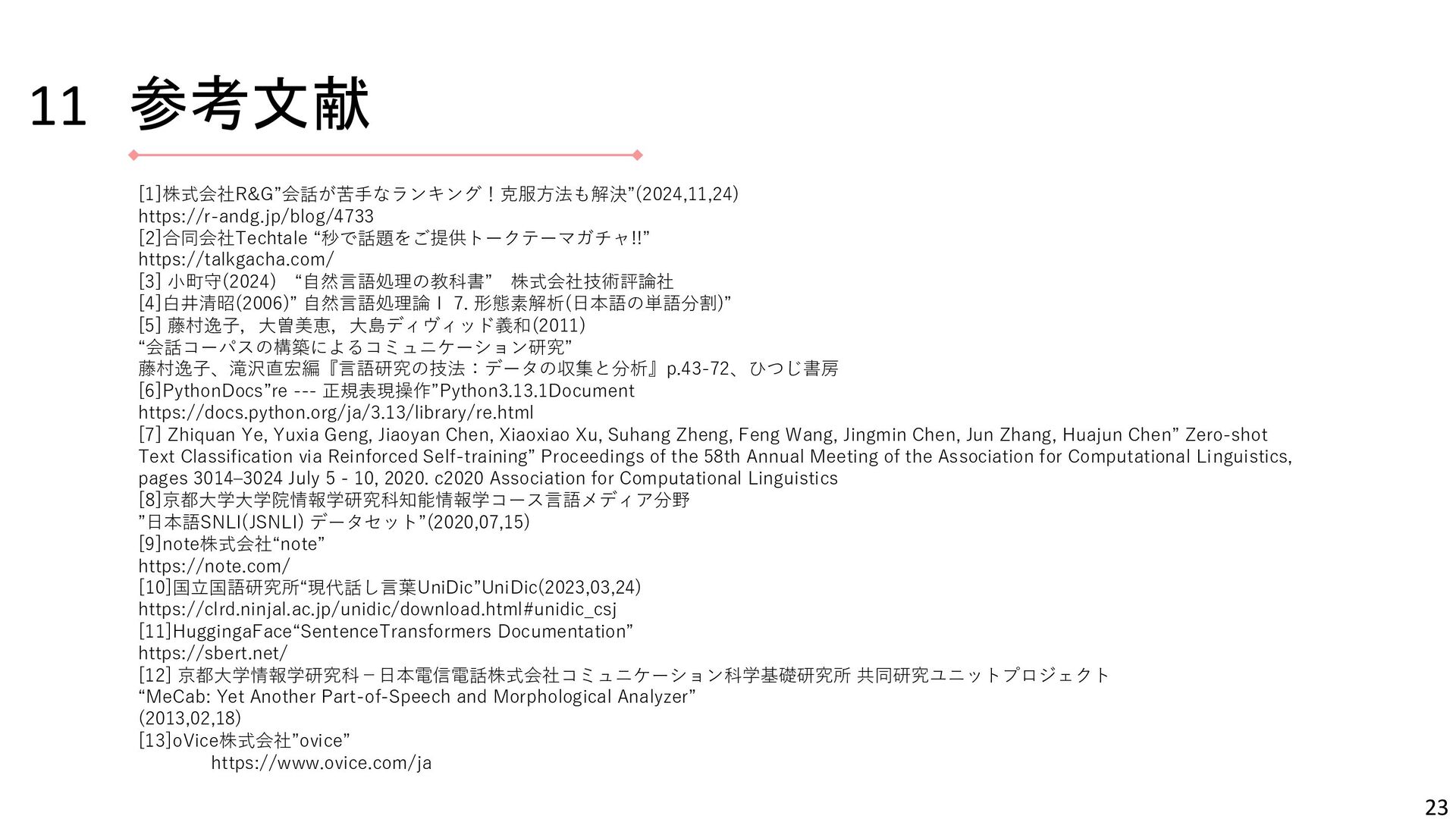 “自然言語処理の教科書” 株式会社技術評論社 [4]白井清昭(2006)” 自然言語処理論I 7. 形態素解析(日本語の単語分割)” [5] 藤村逸子,大曽美恵,大島ディヴィッド義和(2011) “会話コーパスの構築によるコミュニケーション研究” 藤村逸子、滝沢直宏編『言語研究の技法:データの収集と分析』p.43-72、ひつじ書房 [6]PythonDocs”re --- 正規表現操作”Python3.13.1Document https://docs.python.org/ja/3.13/library/re.html [7] Zhiquan Ye, Yuxia Geng, Jiaoyan Chen, Xiaoxiao Xu, Suhang Zheng, Feng Wang, Jingmin Chen, Jun Zhang, Huajun Chen” Zero-shot Text Classification via Reinforced Self-training” Proceedings of the 58th Annual Meeting of the Association for Computational Linguistics, pages 3014–3024 July 5 - 10, 2020. c2020 Association for Computational Linguistics [8]京都大学大学院情報学研究科知能情報学コース言語メディア分野 ”日本語SNLI(JSNLI) データセット”(2020,07,15) [9]note株式会社“note” https://note.com/ [10]国立国語研究所“現代話し言葉UniDic”UniDic(2023,03,24) https://clrd.ninjal.ac.jp/unidic/download.html#unidic_csj [11]HuggingaFace“SentenceTransformers Documentation” https://sbert.net/ [12] 京都大学情報学研究科−日本電信電話株式会社コミュニケーション科学基礎研究所 共同研究ユニットプロジェクト “MeCab: Yet Another Part-of-Speech and Morphological Analyzer” (2013,02,18) [13]oVice株式会社”ovice” https://www.ovice.com/ja