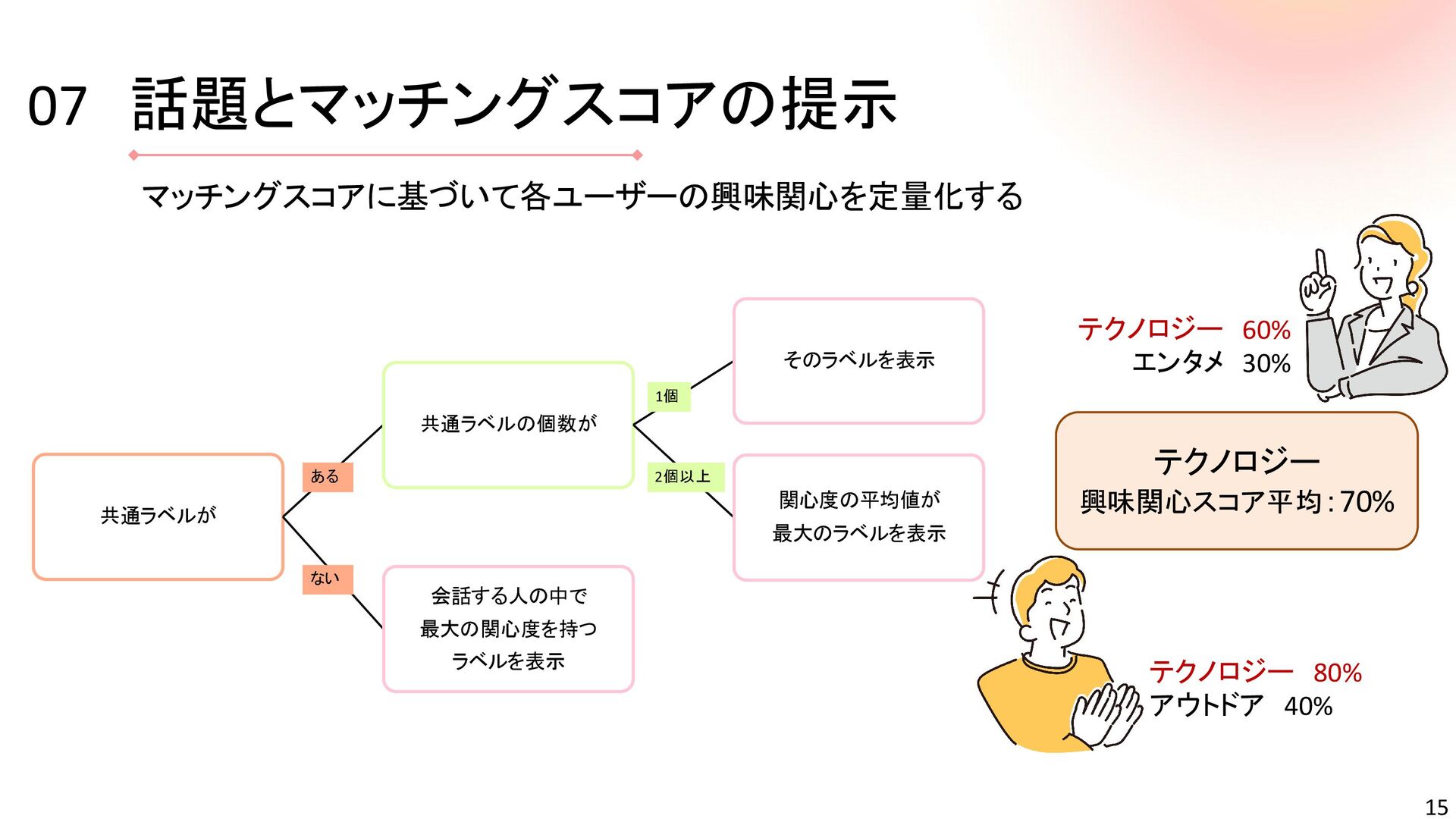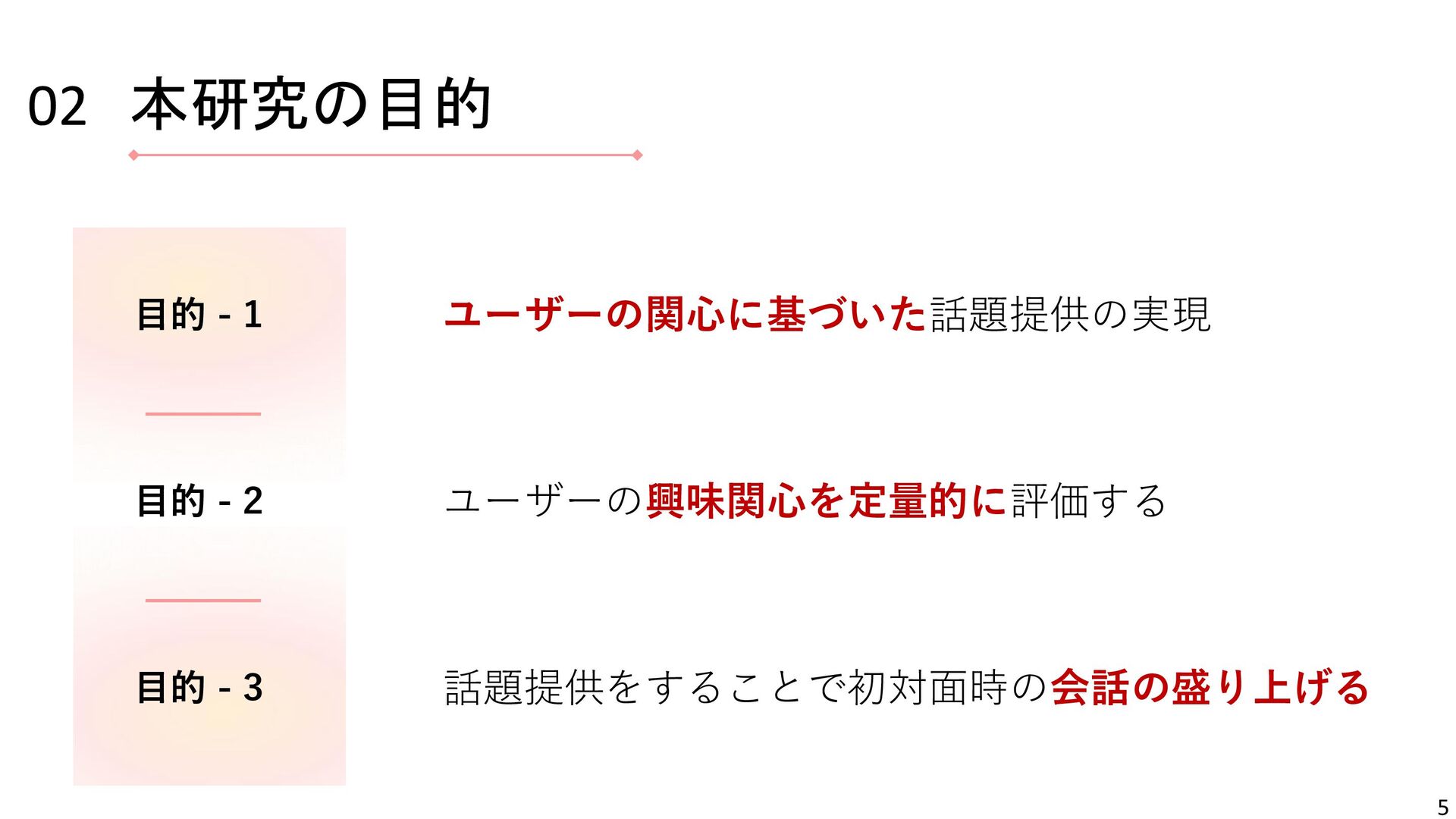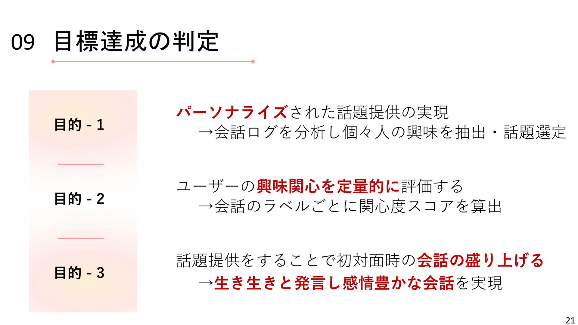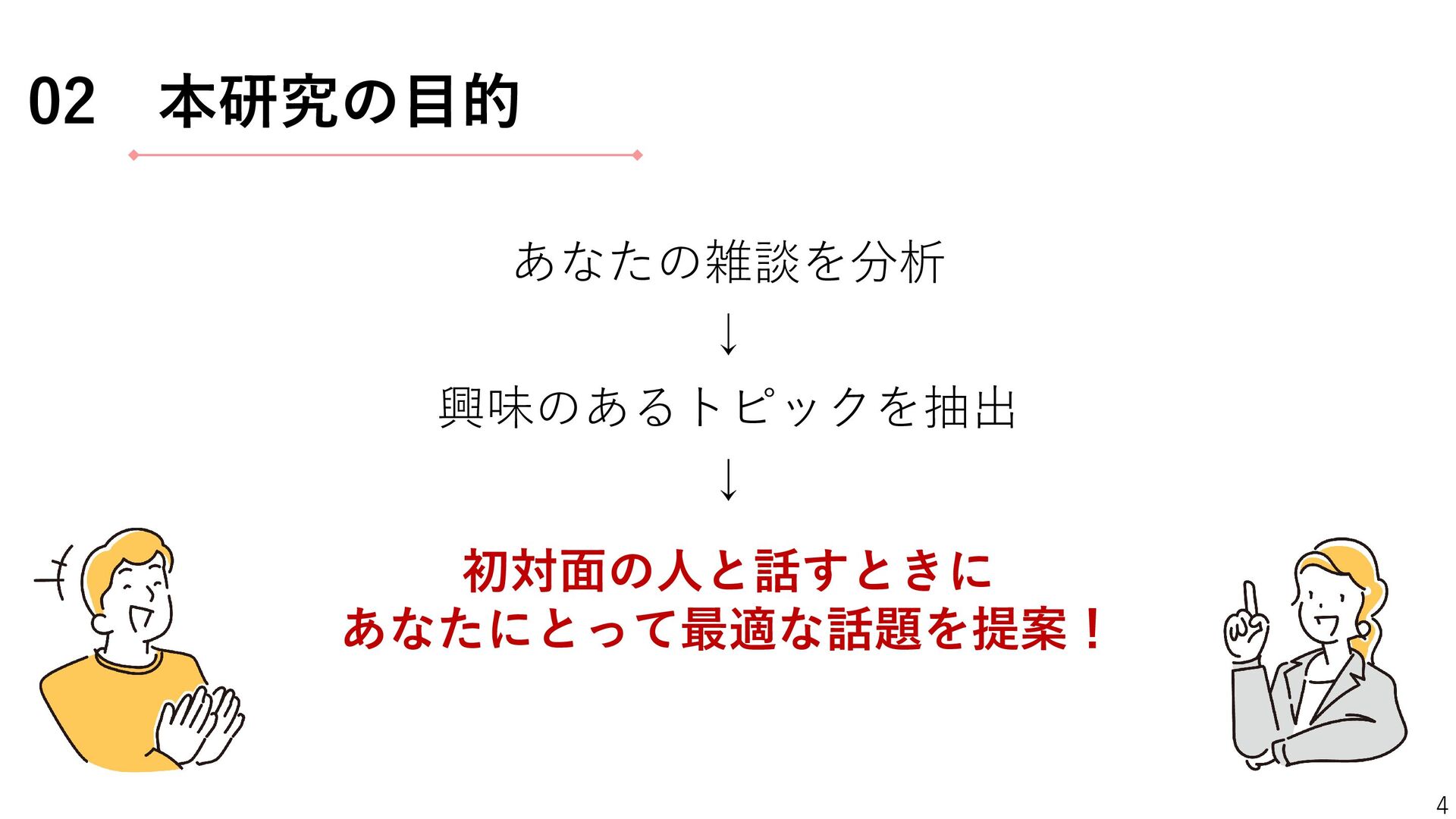 “自然言語処理の教科書” 株式会社技術評論社 [4]白井清昭(2006)” 自然言語処理論I 7. 形態素解析(日本語の単語分割)” [5] 藤村逸子,大曽美恵,大島ディヴィッド義和(2011) “会話コーパスの構築によるコミュニケーション研究” 藤村逸子、滝沢直宏編『言語研究の技法:データの収集と分析』p.43-72、ひつじ書房 [6]PythonDocs”re --- 正規表現操作”Python3.13.1Document https://docs.python.org/ja/3.13/library/re.html [7] Zhiquan Ye, Yuxia Geng, Jiaoyan Chen, Xiaoxiao Xu, Suhang Zheng, Feng Wang, Jingmin Chen, Jun Zhang, Huajun Chen” Zero-shot Text Classification via Reinforced Self-training” Proceedings of the 58th Annual Meeting of the Association for Computational Linguistics, pages 3014–3024 July 5 - 10, 2020. c2020 Association for Computational Linguistics [8]京都大学大学院情報学研究科知能情報学コース言語メディア分野 ”日本語SNLI(JSNLI) データセット”(2020,07,15) [9]note株式会社“note” https://note.com/ [10]国立国語研究所“現代話し言葉UniDic”UniDic(2023,03,24) https://clrd.ninjal.ac.jp/unidic/download.html#unidic_csj [11]HuggingaFace“SentenceTransformers Documentation” https://sbert.net/ [12] 京都大学情報学研究科−日本電信電話株式会社コミュニケーション科学基礎研究所 共同研究ユニットプロジェクト “MeCab: Yet Another Part-of-Speech and Morphological Analyzer” (2013,02,18) [13]oVice株式会社”ovice” https://www.ovice.com/ja