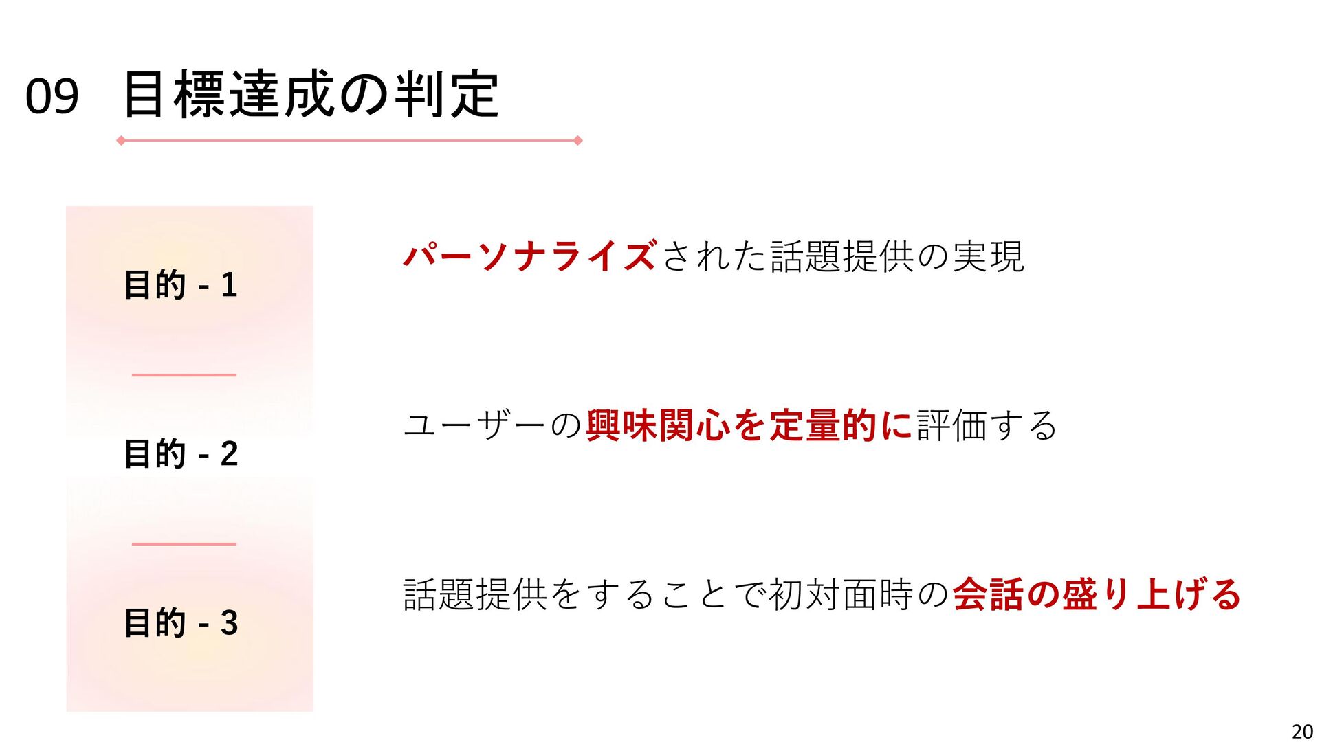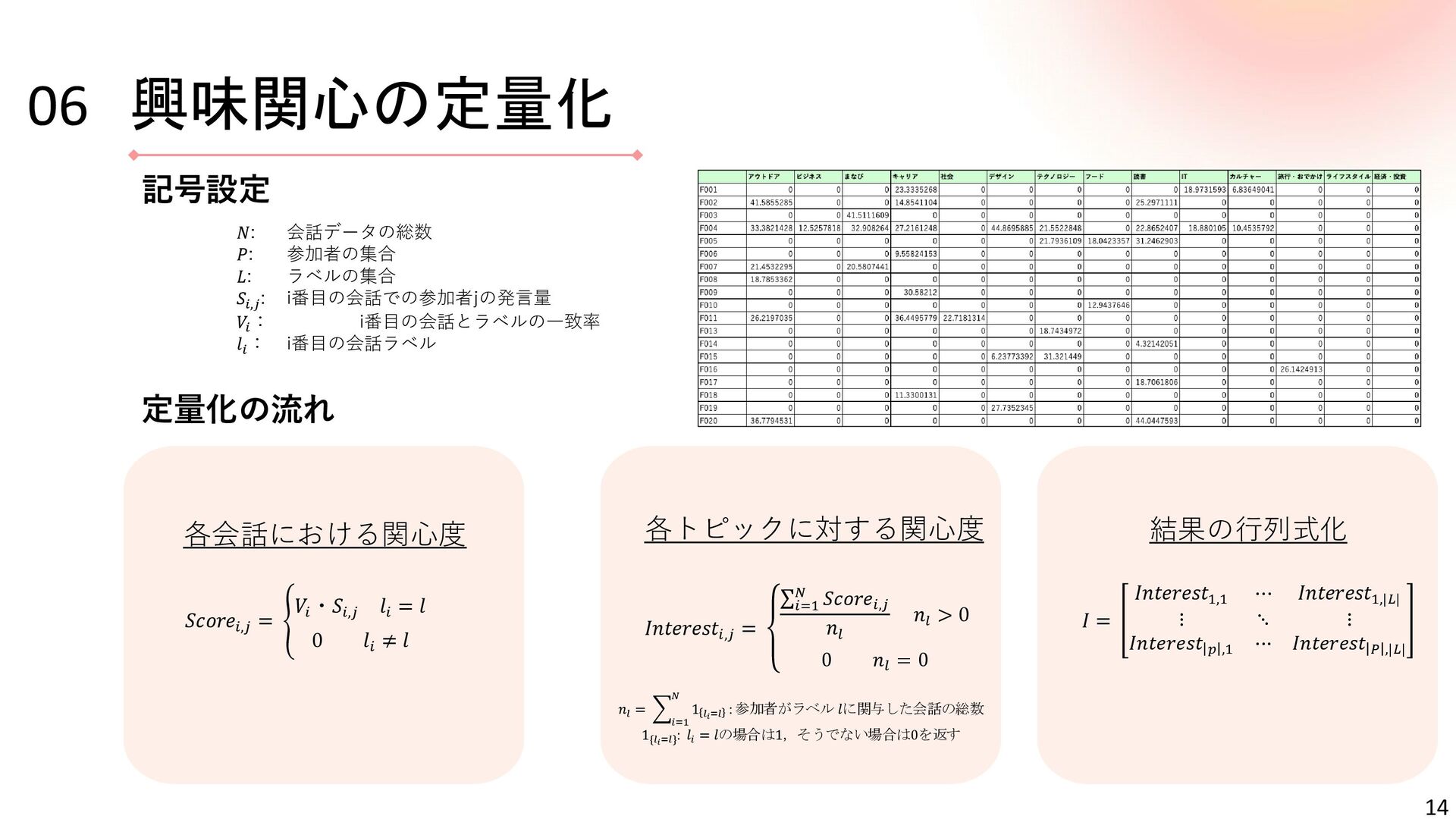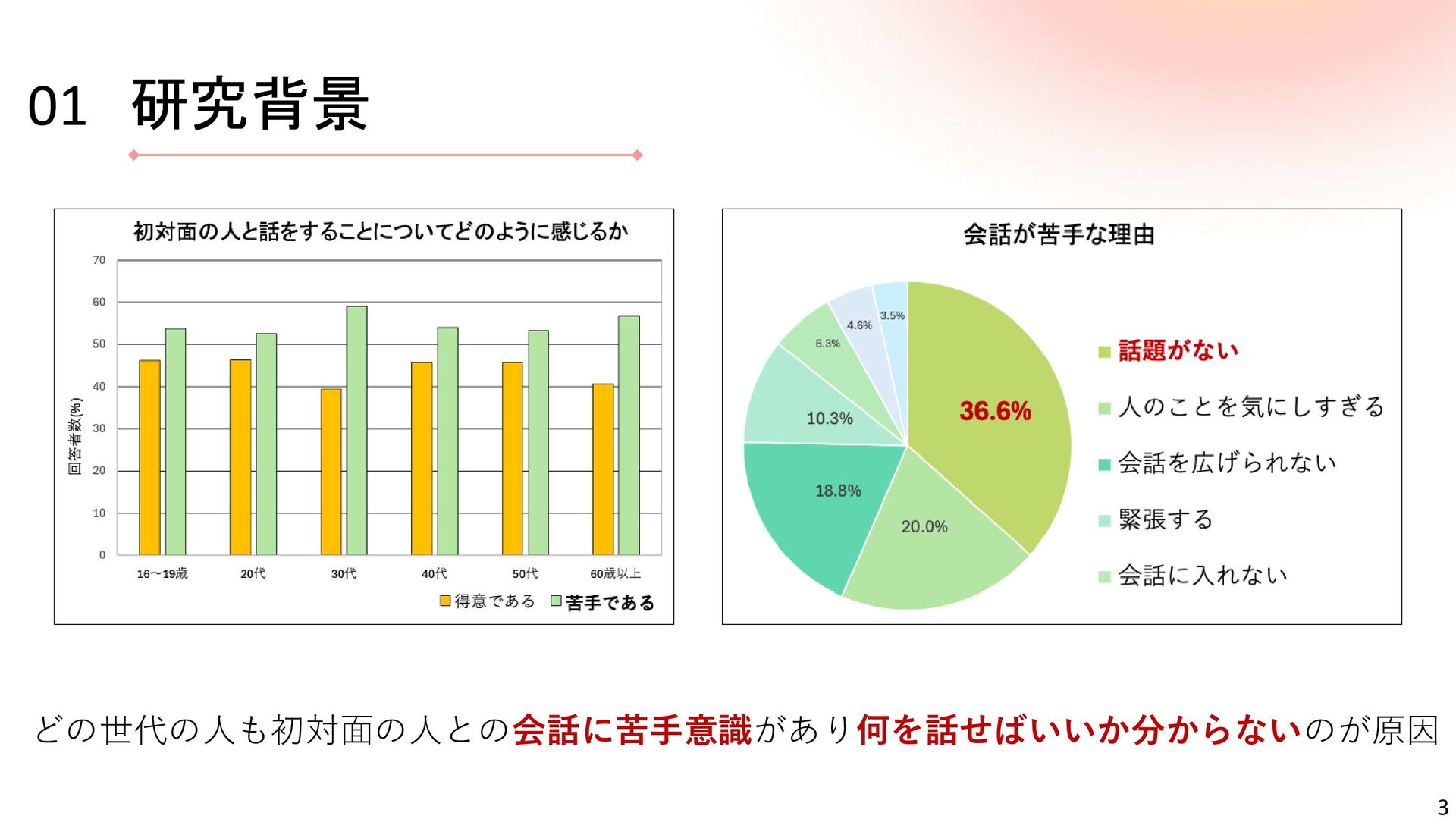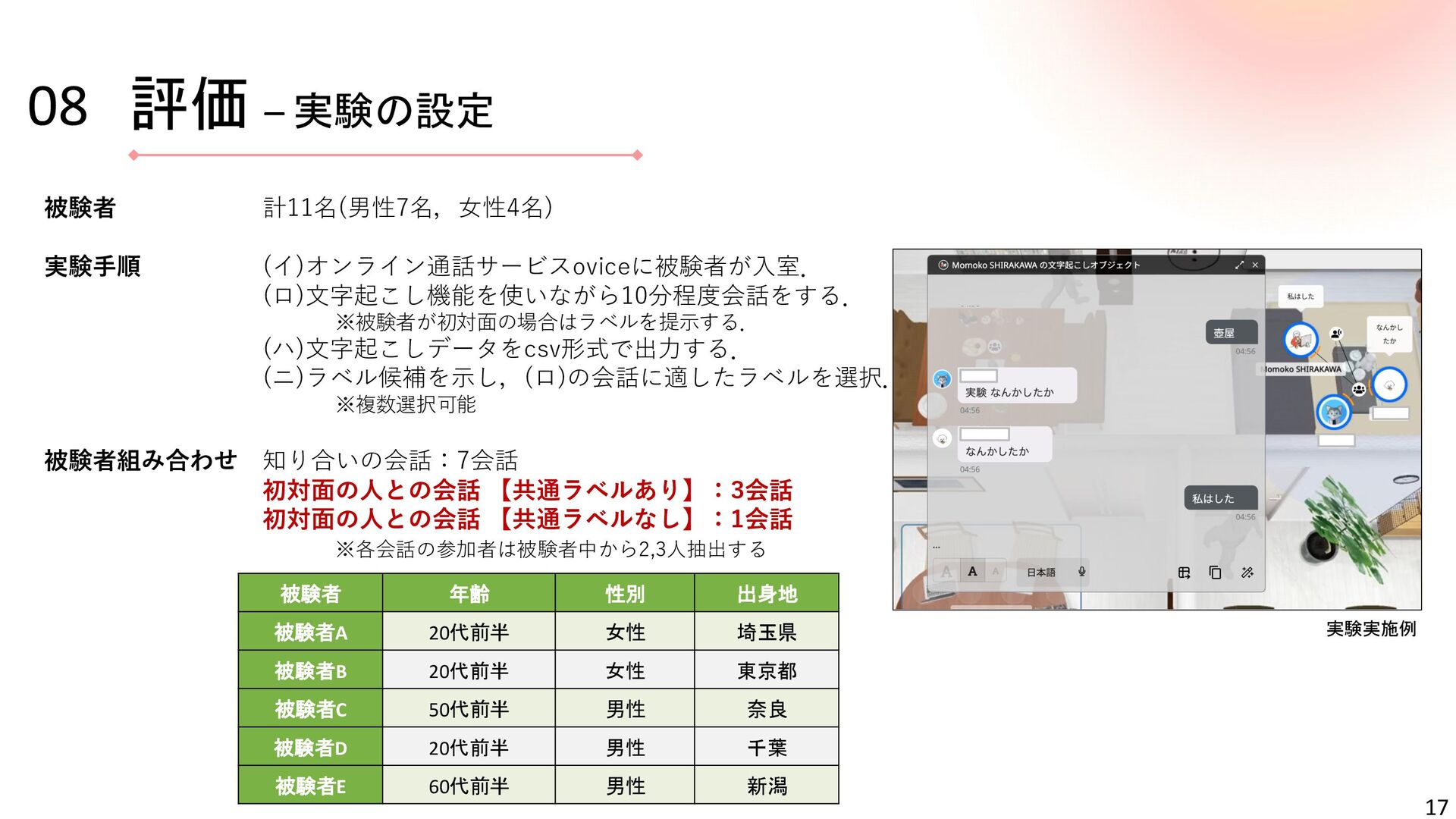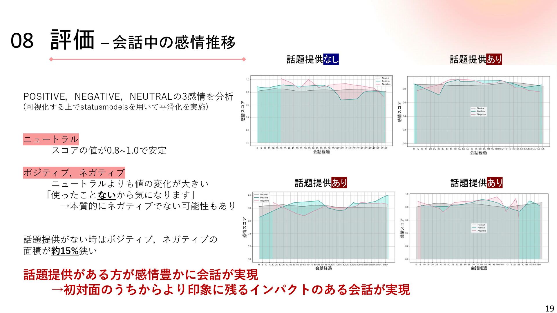 “自然言語処理の教科書” 株式会社技術評論社 [4]白井清昭(2006)” 自然言語処理論I 7. 形態素解析(日本語の単語分割)” [5] 藤村逸子,大曽美恵,大島ディヴィッド義和(2011) “会話コーパスの構築によるコミュニケーション研究” 藤村逸子、滝沢直宏編『言語研究の技法:データの収集と分析』p.43-72、ひつじ書房 [6]PythonDocs”re --- 正規表現操作”Python3.13.1Document https://docs.python.org/ja/3.13/library/re.html [7] Zhiquan Ye, Yuxia Geng, Jiaoyan Chen, Xiaoxiao Xu, Suhang Zheng, Feng Wang, Jingmin Chen, Jun Zhang, Huajun Chen” Zero-shot Text Classification via Reinforced Self-training” Proceedings of the 58th Annual Meeting of the Association for Computational Linguistics, pages 3014–3024 July 5 - 10, 2020. c2020 Association for Computational Linguistics [8]京都大学大学院情報学研究科知能情報学コース言語メディア分野 ”日本語SNLI(JSNLI) データセット”(2020,07,15) [9]note株式会社“note” https://note.com/ [10]国立国語研究所“現代話し言葉UniDic”UniDic(2023,03,24) https://clrd.ninjal.ac.jp/unidic/download.html#unidic_csj [11]HuggingaFace“SentenceTransformers Documentation” https://sbert.net/ [12] 京都大学情報学研究科−日本電信電話株式会社コミュニケーション科学基礎研究所 共同研究ユニットプロジェクト “MeCab: Yet Another Part-of-Speech and Morphological Analyzer” (2013,02,18) [13]oVice株式会社”ovice” https://www.ovice.com/ja