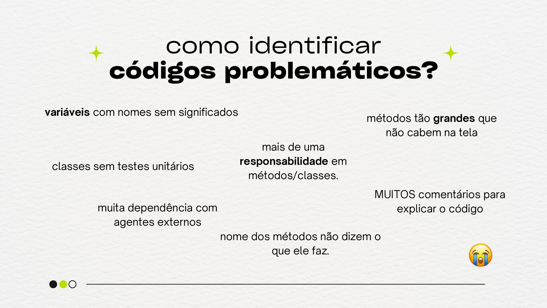 tão grandes que não cabem na tela mais de uma responsabilidade em métodos/classes. classes sem testes unitários MUITOS comentários para explicar o código muita dependência com agentes externos nome dos métodos não dizem o que ele faz.