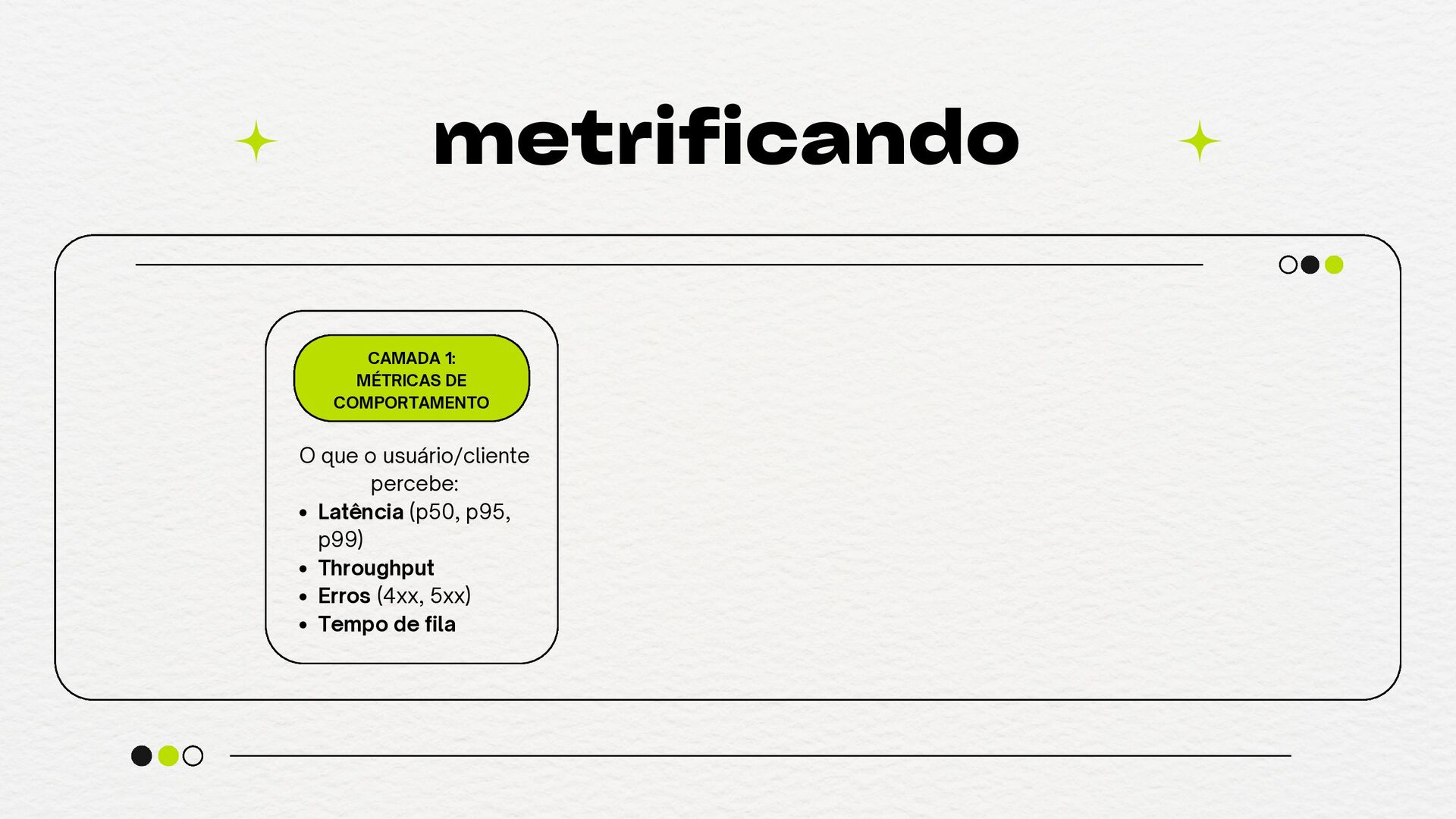 percebe: Latência (p50, p95, p99) Throughput Erros (4xx, 5xx) Tempo de fila