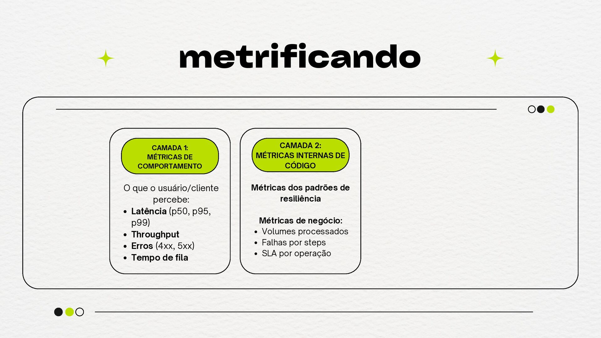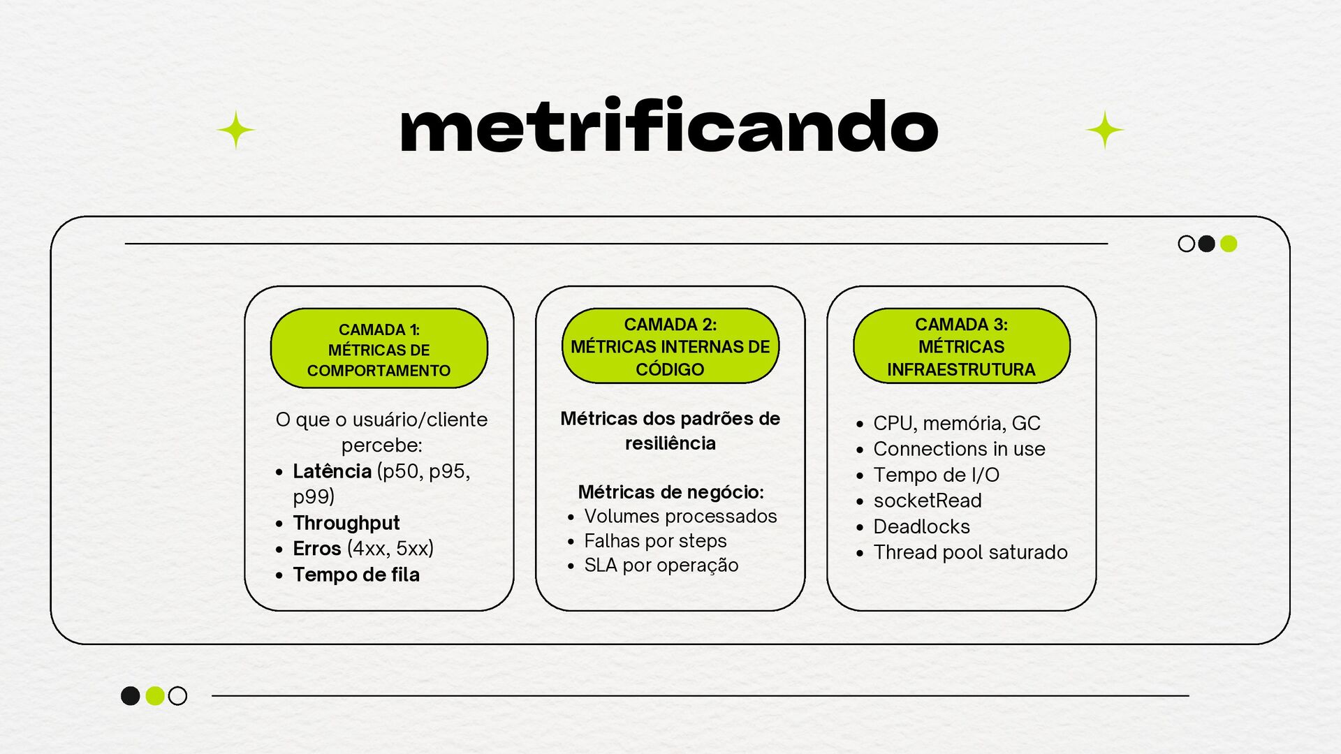 DE CÓDIGO Métricas dos padrões de resiliência Métricas de negócio: Volumes processados Falhas por steps SLA por operação O que o usuário/cliente percebe: Latência (p50, p95, p99) Throughput Erros (4xx, 5xx) Tempo de fila CAMADA 3: MÉTRICAS INFRAESTRUTURA CPU, memória, GC Connections in use Tempo de I/O socketRead Deadlocks Thread pool saturado