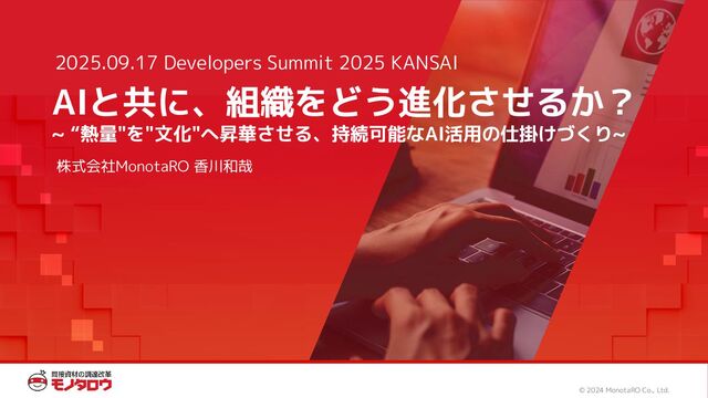 本セッションでは、私たちモノタロウが「何を目的に置き、どう判断し、どんな施策を打ってきたのか」という実践の道のりを共有。200名以上の開発者と試行錯誤する中で見出した、個々の“熱量”を一過性のブームで終わらせず、組織の“文化”へと昇華させるための具体的な取り組みと、その背景にある思想を解説します。