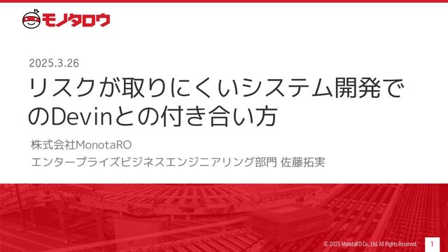 リスクが取りにくいシステム開発で のDevinとの付き合い方 株式会社MonotaRO エンタープライズビジネスエンジニアリング部門 佐藤拓実 1 2025.3.26 © 2025 MonotaRO