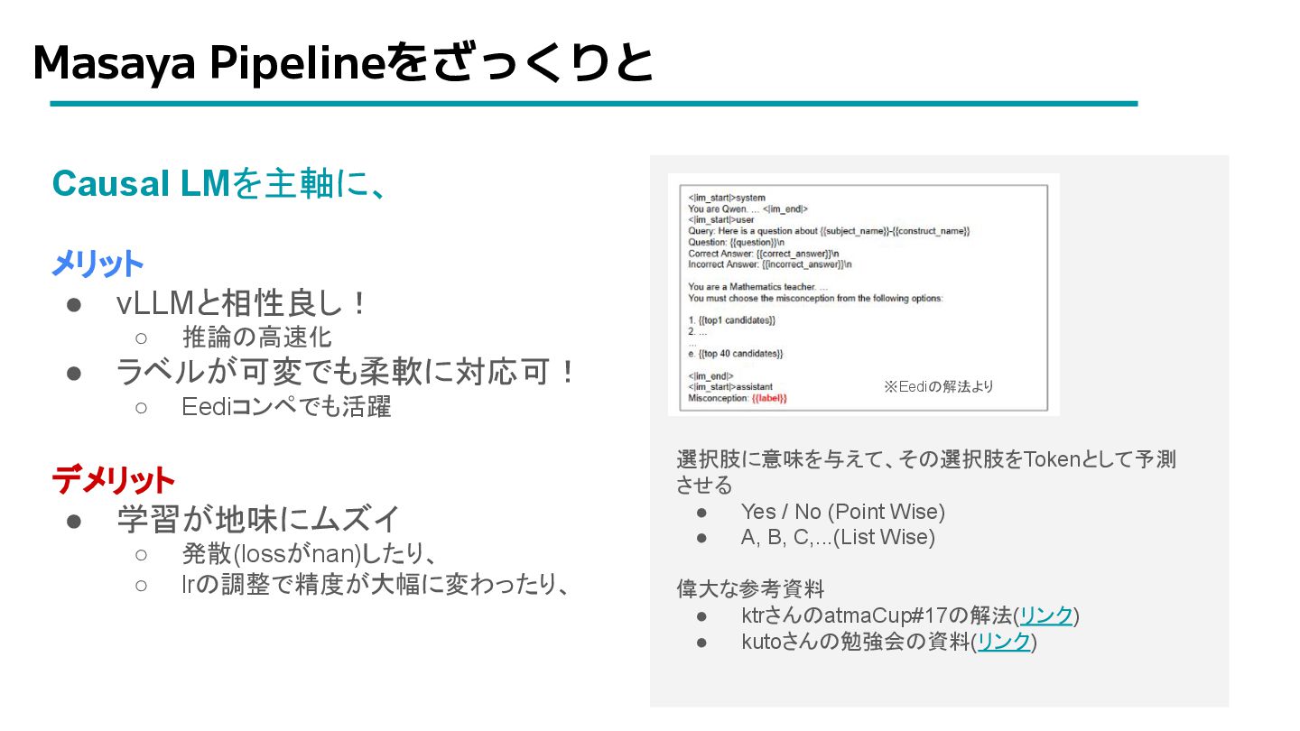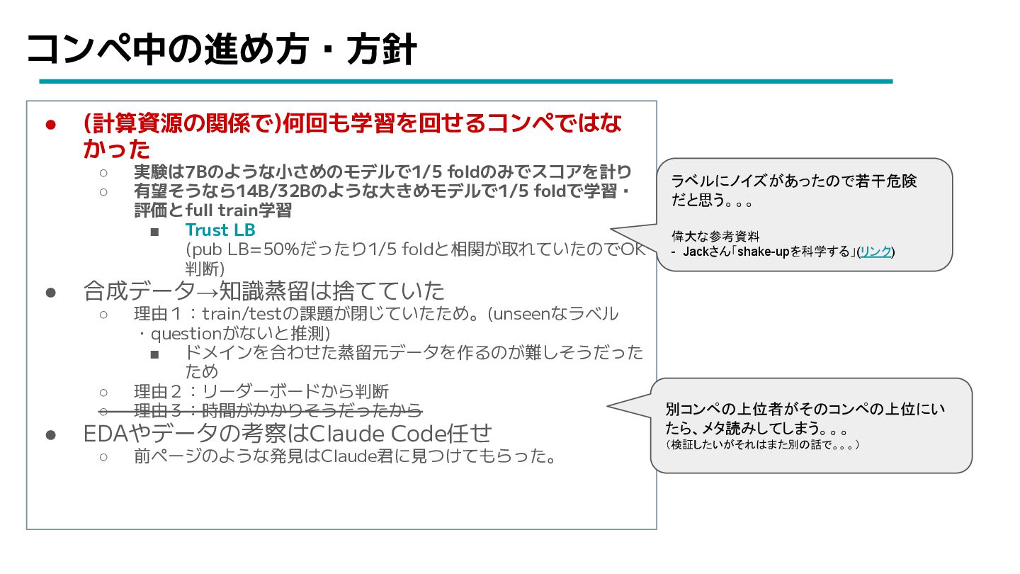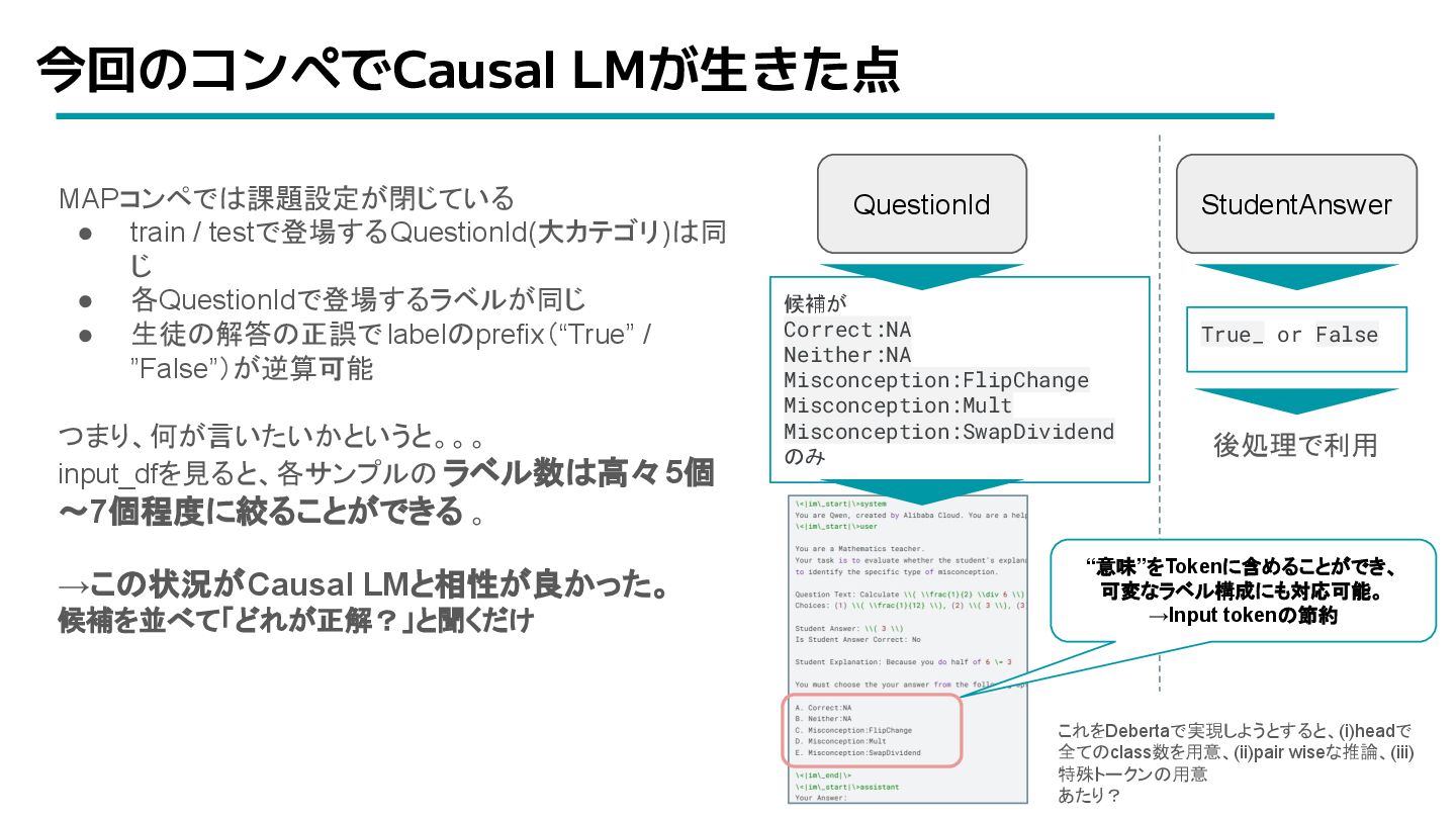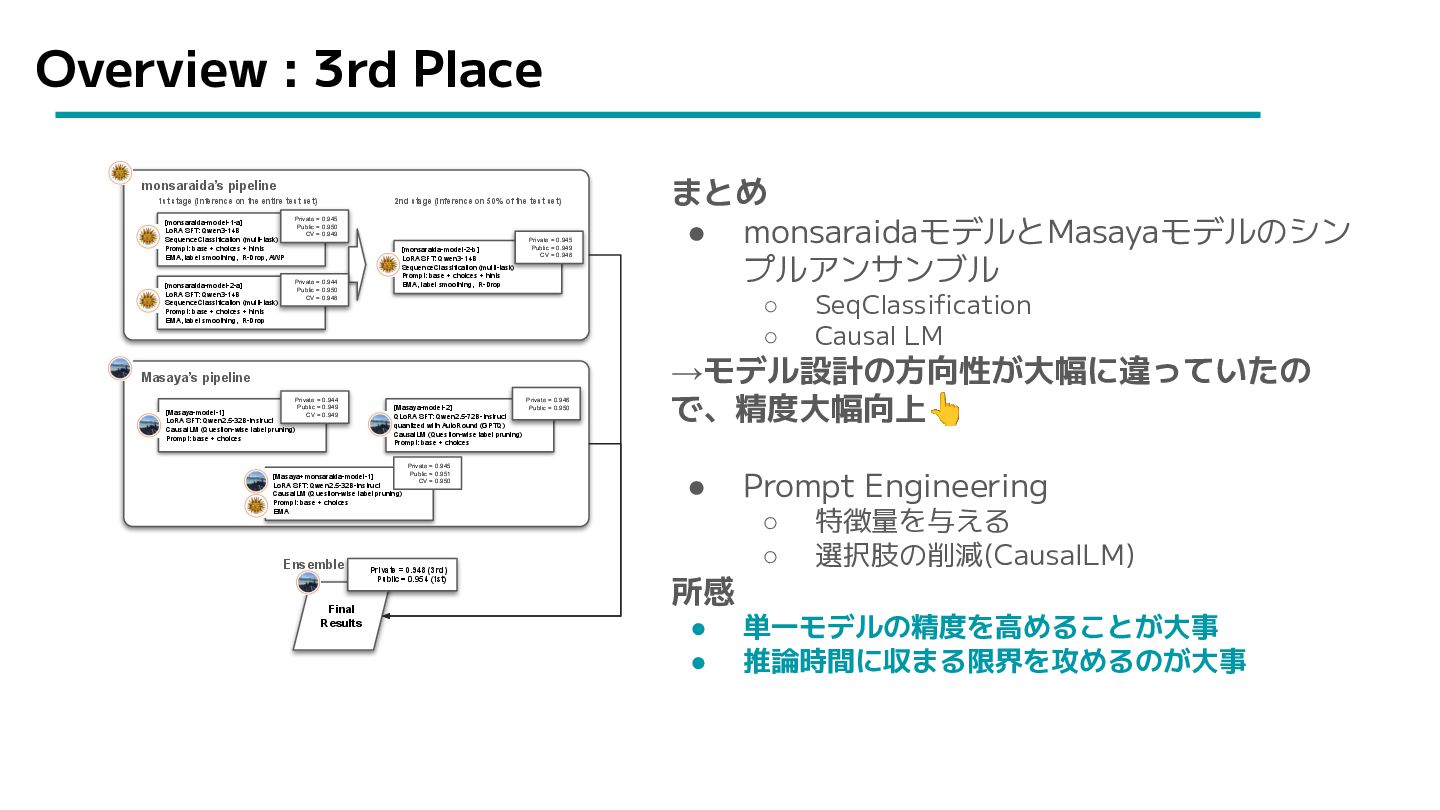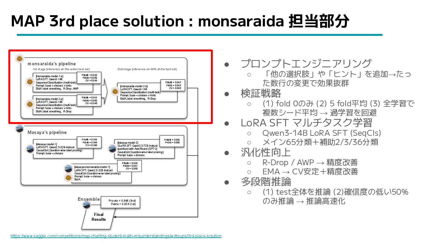 Qwen3-14B SequenceClassification (multi-task) Prompt: base + choices + hints EMA, label smoothing, R-Drop monsaraida’s pipeline 2nd stage (inference on 50% of the test set) [Masaya-model-1] LoRA SFT: Qwen2.5-32B-Instruct CausalLM (Question-wise label pruning) Prompt: base + choices [monsaraida-model-1-a] LoRA SFT: Qwen3-14B SequenceClassification (multi-task) Prompt: base + choices + hints EMA, label smoothing, R-Drop, AWP Private = 0.945 Public = 0.950 CV = 0.949 Private = 0.945 Public = 0.949 CV = 0.948 [Masaya-model-2] QLoRA SFT: Qwen2.5-72B-Instruct quantized with AutoRound (GPTQ) CausalLM (Question-wise label pruning) Prompt: base + choices Private = 0.946 Public = 0.950 Private = 0.944 Public = 0.949 CV = 0.949 [monsaraida-model-2-a] LoRA SFT: Qwen3-14B SequenceClassification (multi-task) Prompt: base + choices + hints EMA, label smoothing, R-Drop Private = 0.944 Public = 0.950 CV = 0.948 [Masaya+monsaraida-model-1] LoRA SFT: Qwen2.5-32B-Instruct CausalLM (Question-wise label pruning) Prompt: base + choices EMA Private = 0.945 Public = 0.951 CV = 0.950 Masaya’s pipeline 1st stage (inference on the entire test set) Final Results Private = 0.948 (3rd) Public = 0.954 (1st) Ensemble https://www.kaggle.com/competitions/map-charting-student-math-misunderstandings/writeups/3rd-place-solution • プロンプトエンジニアリング ◦ 「他の選択肢」や「ヒント」を追加→たっ た数行の変更で効果抜群 • 検証戦略 ◦ (1) fold 0のみ (2) 5 fold平均 (3) 全学習で 複数シード平均 → 過学習を回避 • LoRA SFT マルチタスク学習 ◦ Qwen3-14B LoRA SFT (SeqCls) ◦ メイン65分類+補助2/3/36分類 • 汎化性向上 ◦ R-Drop / AWP → 精度改善 ◦ EMA → CV安定+精度改善 • 多段階推論 ◦ (1) test全体を推論 (2)確信度の低い50% のみ推論 → 推論高速化