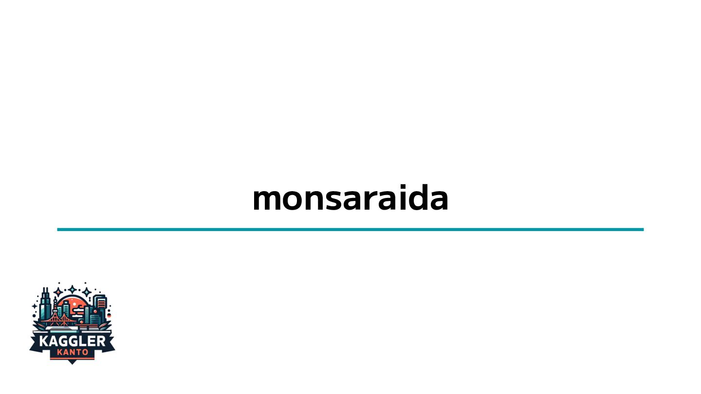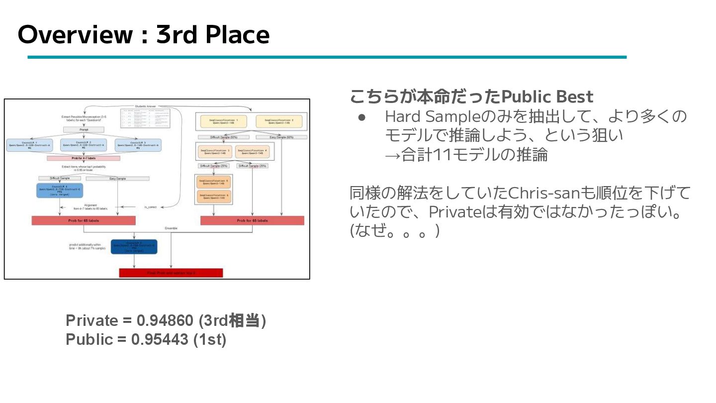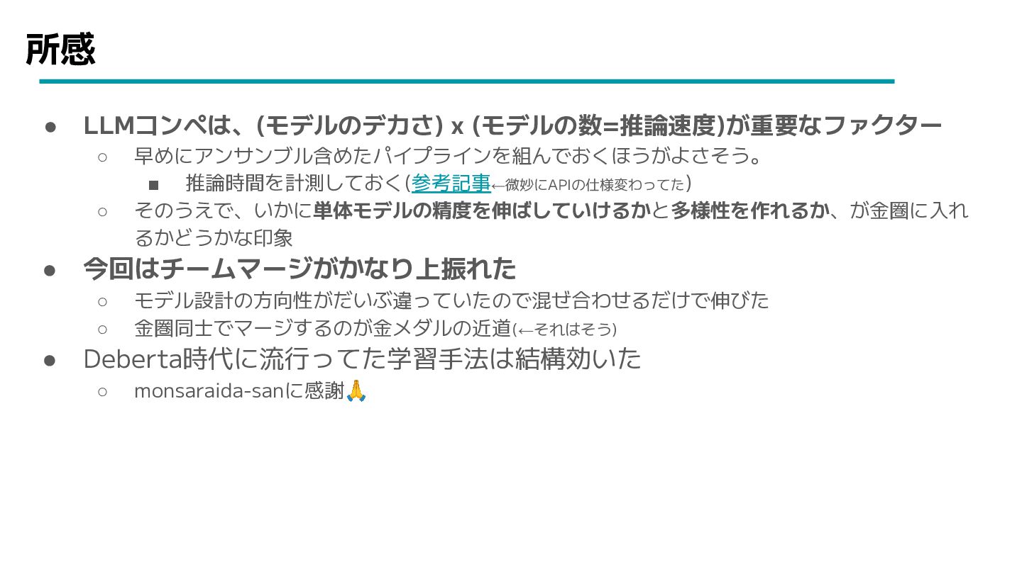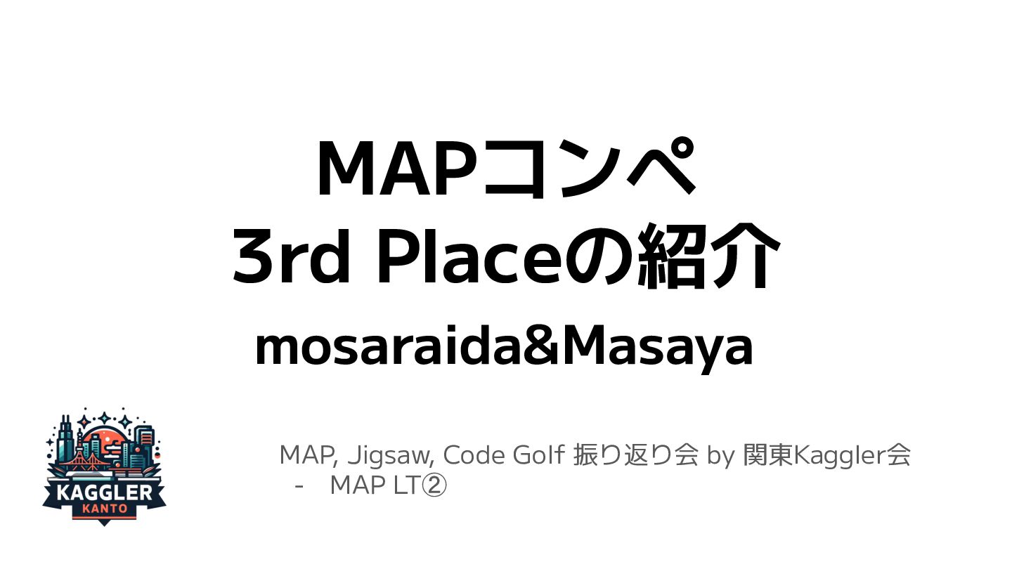 Qwen3-14B SequenceClassification (multi-task) Prompt: base + choices + hints EMA, label smoothing, R-Drop monsaraida’s pipeline 2nd stage (inference on 50% of the test set) [Masaya-model-1] LoRA SFT: Qwen2.5-32B-Instruct CausalLM (Question-wise label pruning) Prompt: base + choices [monsaraida-model-1-a] LoRA SFT: Qwen3-14B SequenceClassification (multi-task) Prompt: base + choices + hints EMA, label smoothing, R-Drop, AWP Private = 0.945 Public = 0.950 CV = 0.949 Private = 0.945 Public = 0.949 CV = 0.948 [Masaya-model-2] QLoRA SFT: Qwen2.5-72B-Instruct quantized with AutoRound (GPTQ) CausalLM (Question-wise label pruning) Prompt: base + choices Private = 0.946 Public = 0.950 Private = 0.944 Public = 0.949 CV = 0.949 [monsaraida-model-2-a] LoRA SFT: Qwen3-14B SequenceClassification (multi-task) Prompt: base + choices + hints EMA, label smoothing, R-Drop Private = 0.944 Public = 0.950 CV = 0.948 [Masaya+monsaraida-model-1] LoRA SFT: Qwen2.5-32B-Instruct CausalLM (Question-wise label pruning) Prompt: base + choices EMA Private = 0.945 Public = 0.951 CV = 0.950 Masaya’s pipeline 1st stage (inference on the entire test set) Final Results Private = 0.948 (3rd) Public = 0.954 (1st) Ensemble https://www.kaggle.com/competitions/map-charting-student-math-misunderstandings/writeups/3rd-place-solution • プロンプトエンジニアリング ◦ 「他の選択肢」や「ヒント」を追加→たっ た数行の変更で効果抜群 • 検証戦略 ◦ (1) fold 0のみ (2) 5 fold平均 (3) 全学習で 複数シード平均 → 過学習を回避 • LoRA SFT マルチタスク学習 ◦ Qwen3-14B LoRA SFT (SeqCls) ◦ メイン65分類+補助2/3/36分類 • 汎化性向上 ◦ R-Drop / AWP → 精度改善 ◦ EMA → CV安定+精度改善 • 多段階推論 ◦ (1) test全体を推論 (2)確信度の低い50% のみ推論 → 推論高速化