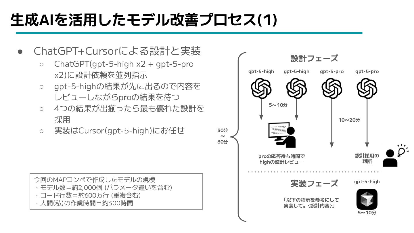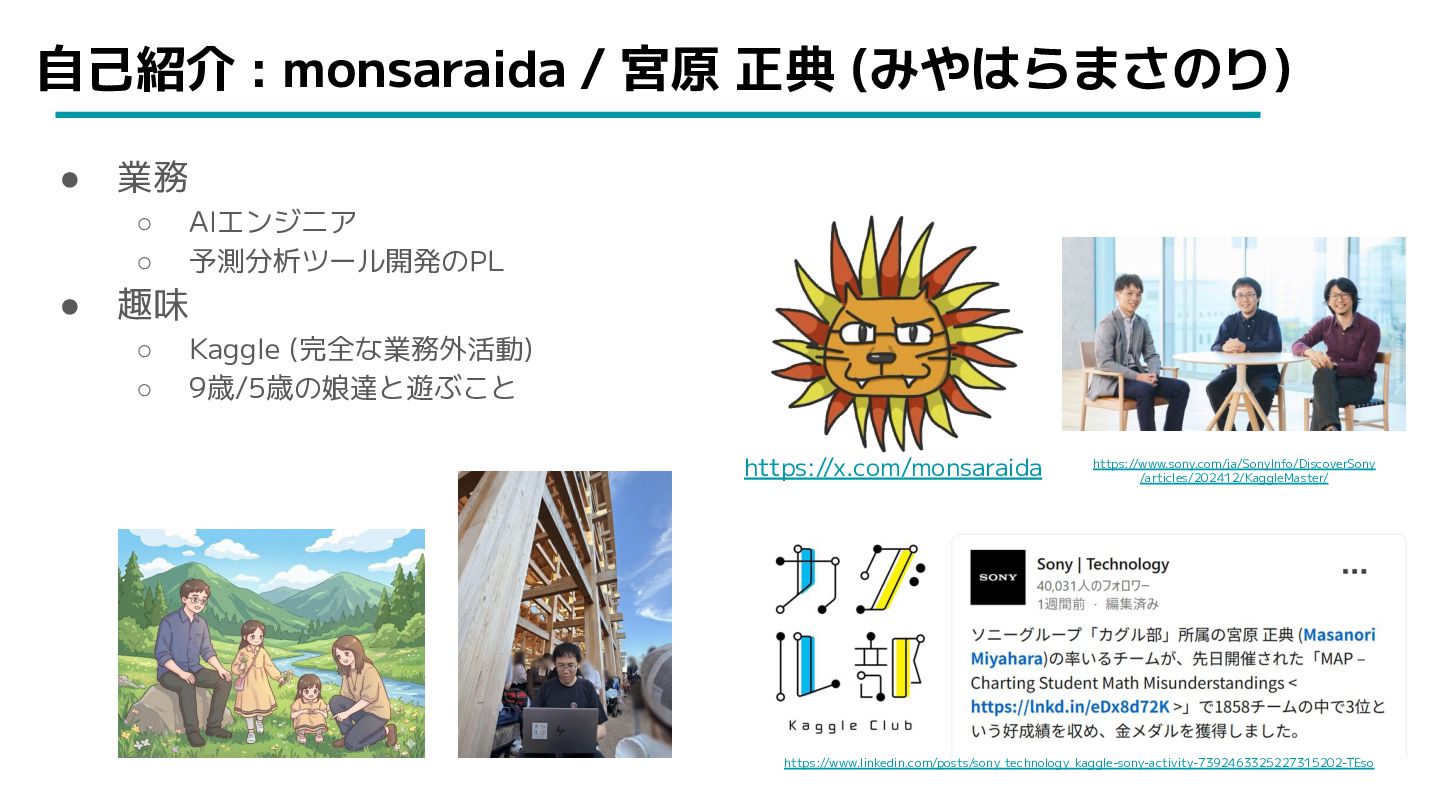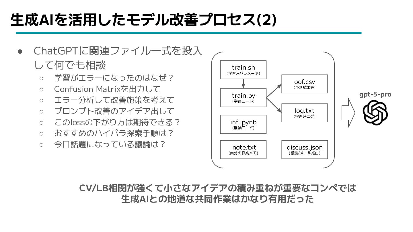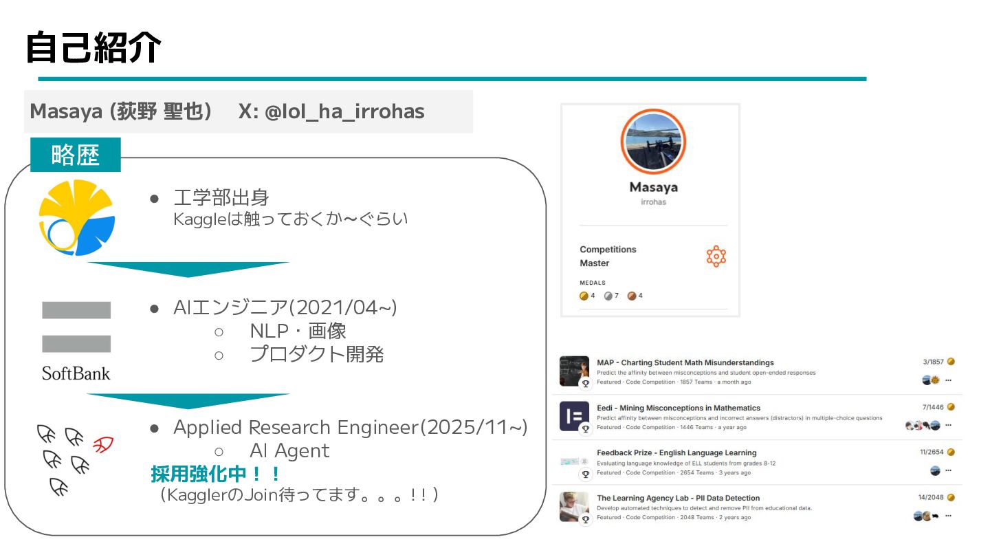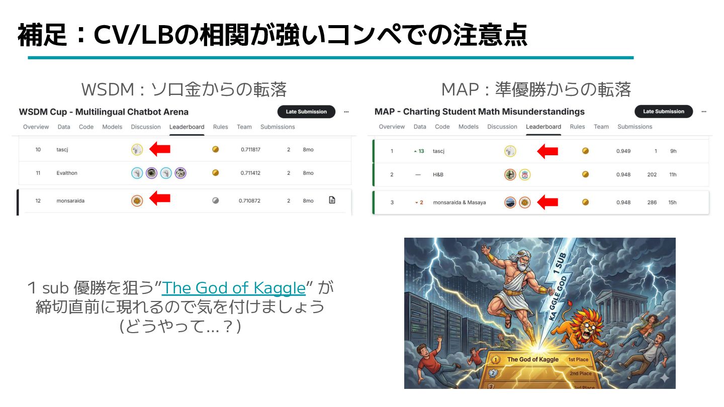 Qwen3-14B SequenceClassification (multi-task) Prompt: base + choices + hints EMA, label smoothing, R-Drop monsaraida’s pipeline 2nd stage (inference on 50% of the test set) [Masaya-model-1] LoRA SFT: Qwen2.5-32B-Instruct CausalLM (Question-wise label pruning) Prompt: base + choices [monsaraida-model-1-a] LoRA SFT: Qwen3-14B SequenceClassification (multi-task) Prompt: base + choices + hints EMA, label smoothing, R-Drop, AWP Private = 0.945 Public = 0.950 CV = 0.949 Private = 0.945 Public = 0.949 CV = 0.948 [Masaya-model-2] QLoRA SFT: Qwen2.5-72B-Instruct quantized with AutoRound (GPTQ) CausalLM (Question-wise label pruning) Prompt: base + choices Private = 0.946 Public = 0.950 Private = 0.944 Public = 0.949 CV = 0.949 [monsaraida-model-2-a] LoRA SFT: Qwen3-14B SequenceClassification (multi-task) Prompt: base + choices + hints EMA, label smoothing, R-Drop Private = 0.944 Public = 0.950 CV = 0.948 [Masaya+monsaraida-model-1] LoRA SFT: Qwen2.5-32B-Instruct CausalLM (Question-wise label pruning) Prompt: base + choices EMA Private = 0.945 Public = 0.951 CV = 0.950 Masaya’s pipeline 1st stage (inference on the entire test set) Final Results Private = 0.948 (3rd) Public = 0.954 (1st) Ensemble https://www.kaggle.com/competitions/map-charting-student-math-misunderstandings/writeups/3rd-place-solution • プロンプトエンジニアリング ◦ 「他の選択肢」や「ヒント」を追加→たっ た数行の変更で効果抜群 • 検証戦略 ◦ (1) fold 0のみ (2) 5 fold平均 (3) 全学習で 複数シード平均 → 過学習を回避 • LoRA SFT マルチタスク学習 ◦ Qwen3-14B LoRA SFT (SeqCls) ◦ メイン65分類+補助2/3/36分類 • 汎化性向上 ◦ R-Drop / AWP → 精度改善 ◦ EMA → CV安定+精度改善 • 多段階推論 ◦ (1) test全体を推論 (2)確信度の低い50% のみ推論 → 推論高速化