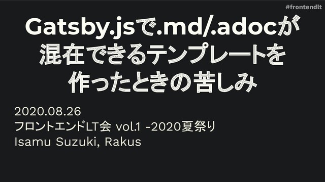 #frontendlt Gatsby.jsで.md/.adocが 混在できるテンプレートを 作ったときの苦しみ 2020.08.26 フロントエンドLT会 vol.1 -2020夏祭り Isamu Suzuki,