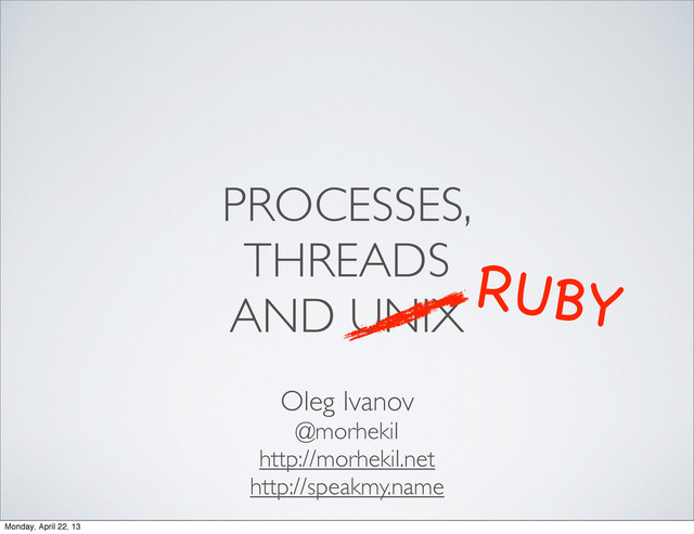 X, QNX, Solaris • Mostly POSIX-compliant: GNU/Linux, *BSD • Ruby implements lots of POSIX functionality, and often - with exactly the same API (Kernel#fork for fork(2), Process.wait for wait(2), etc) Monday, April 22, 13