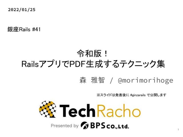 令和版! RailsアプリでPDF生成するテクニック集 森 雅智 / @morimorihoge 2022/01/25 1 銀座Rails