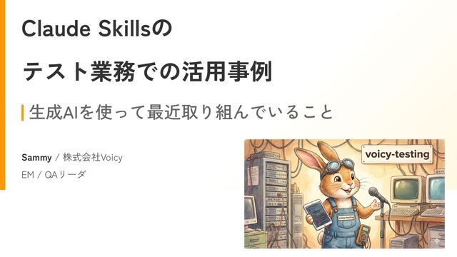 Claude Skillsの テスト業務での活用事例 生成AIを使って最近取り組んでいること Sammy / 株式会社Voicy EM / QAリーダ
