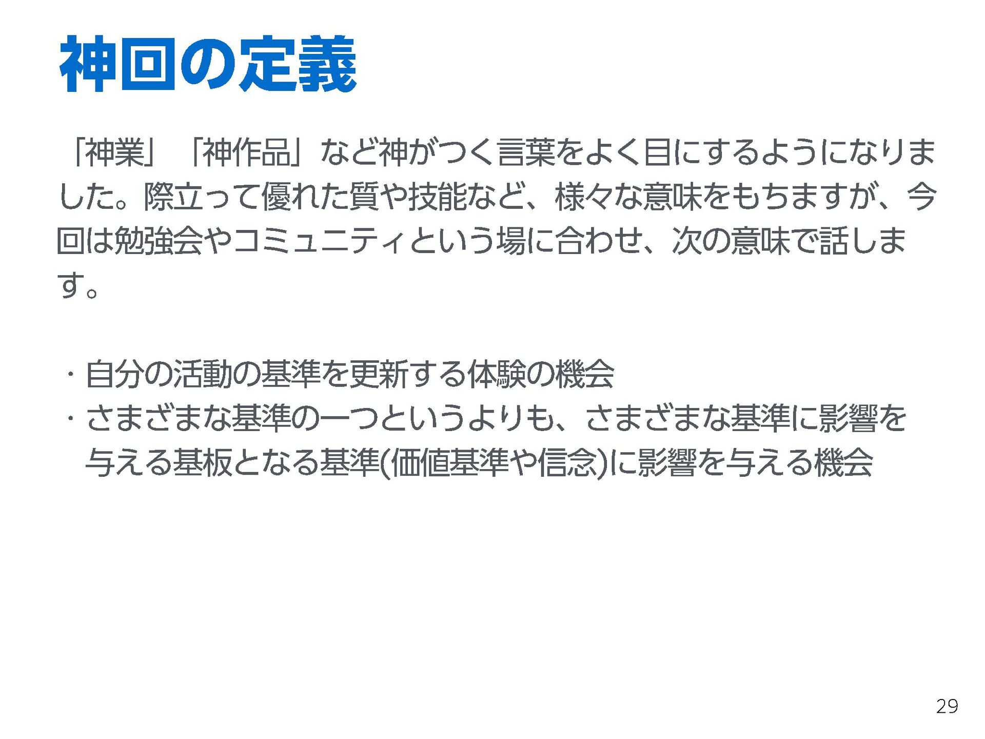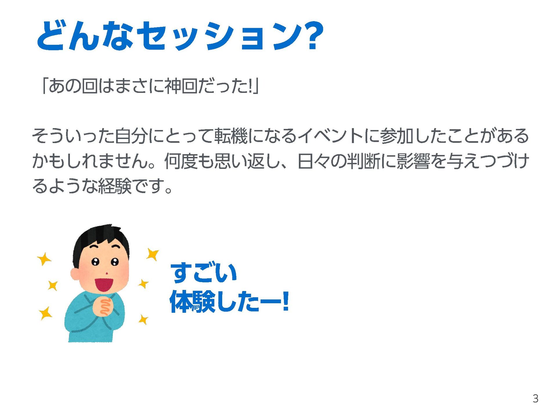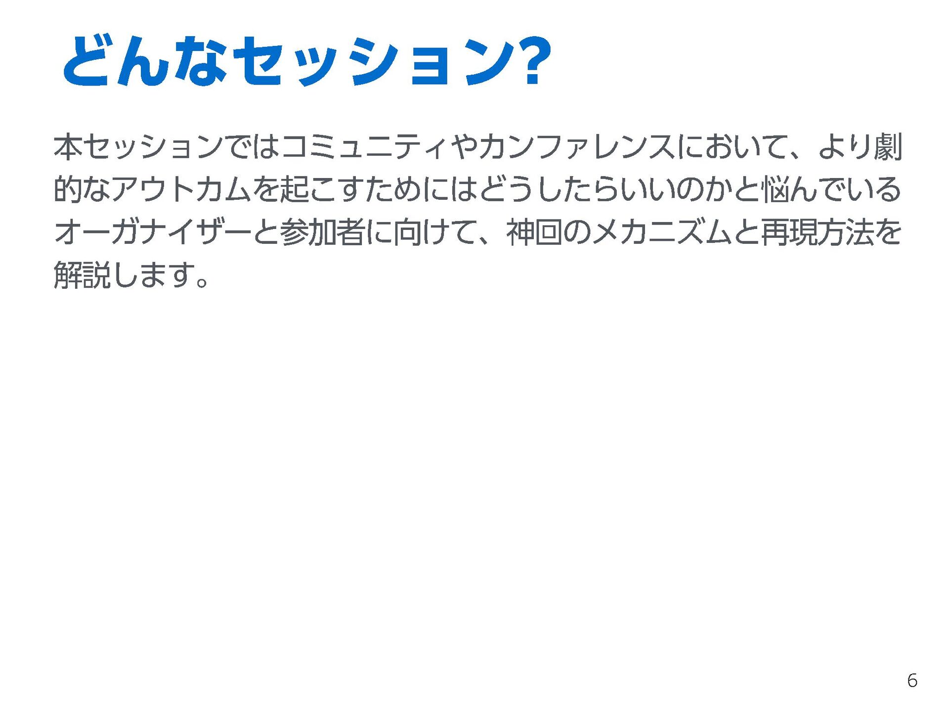 本セッションではコミュニティやカンファレンスにおいて、より劇的なアウトカムを起こすためにはどうしたらいいのかと悩んでいるオーガナイザーと参加者に向けて、神回のメカニズムと再現方法を解説します。