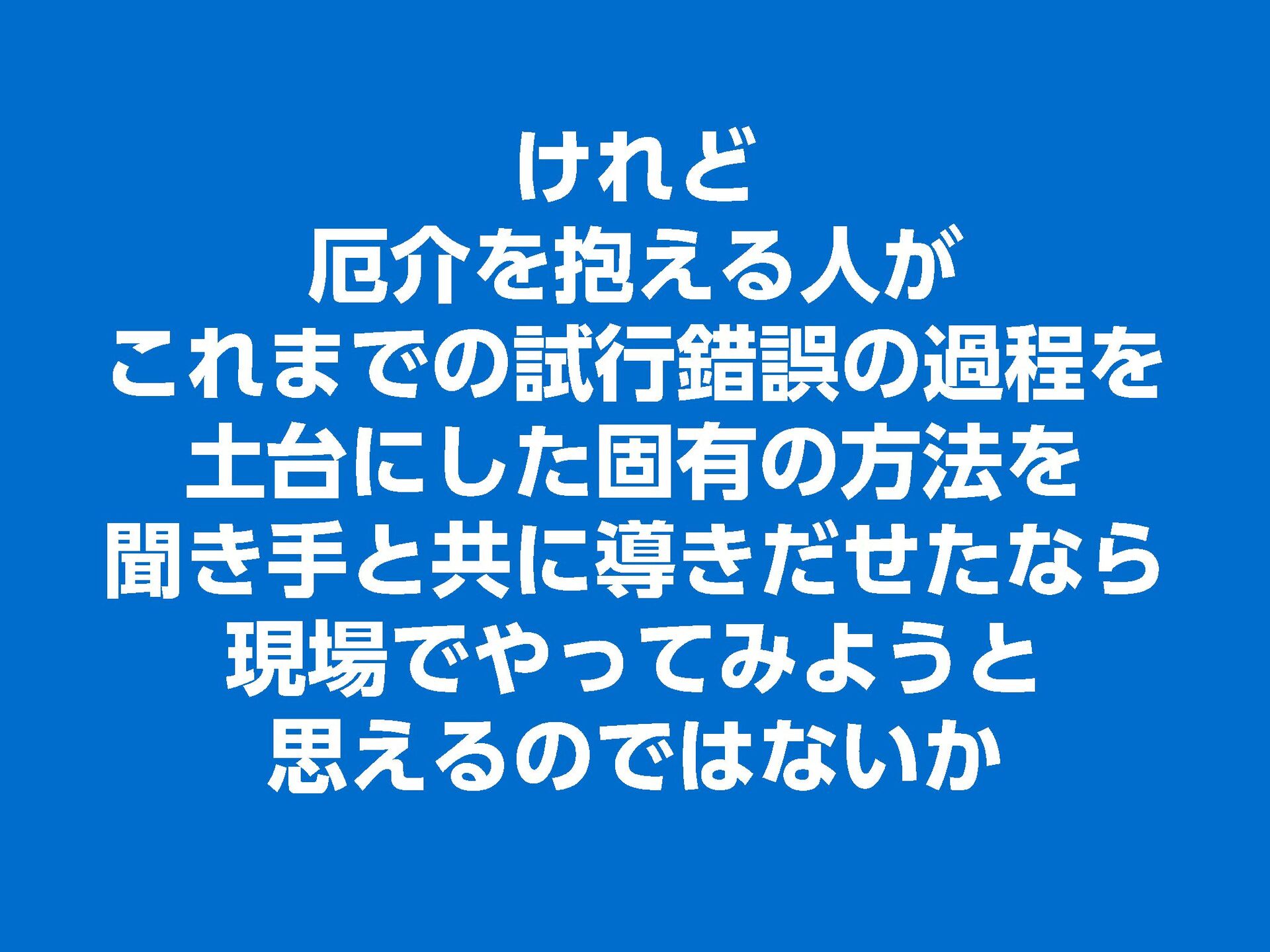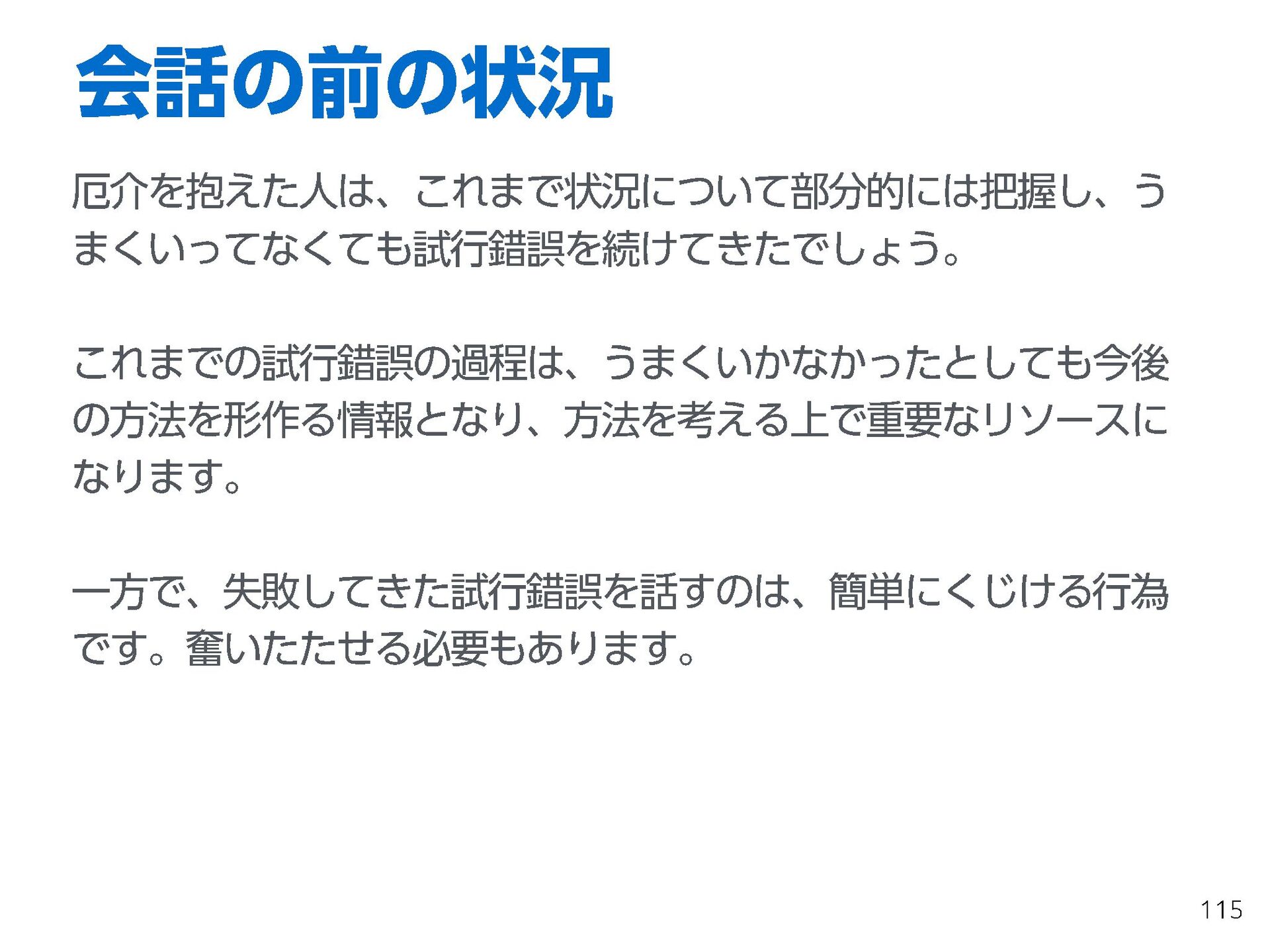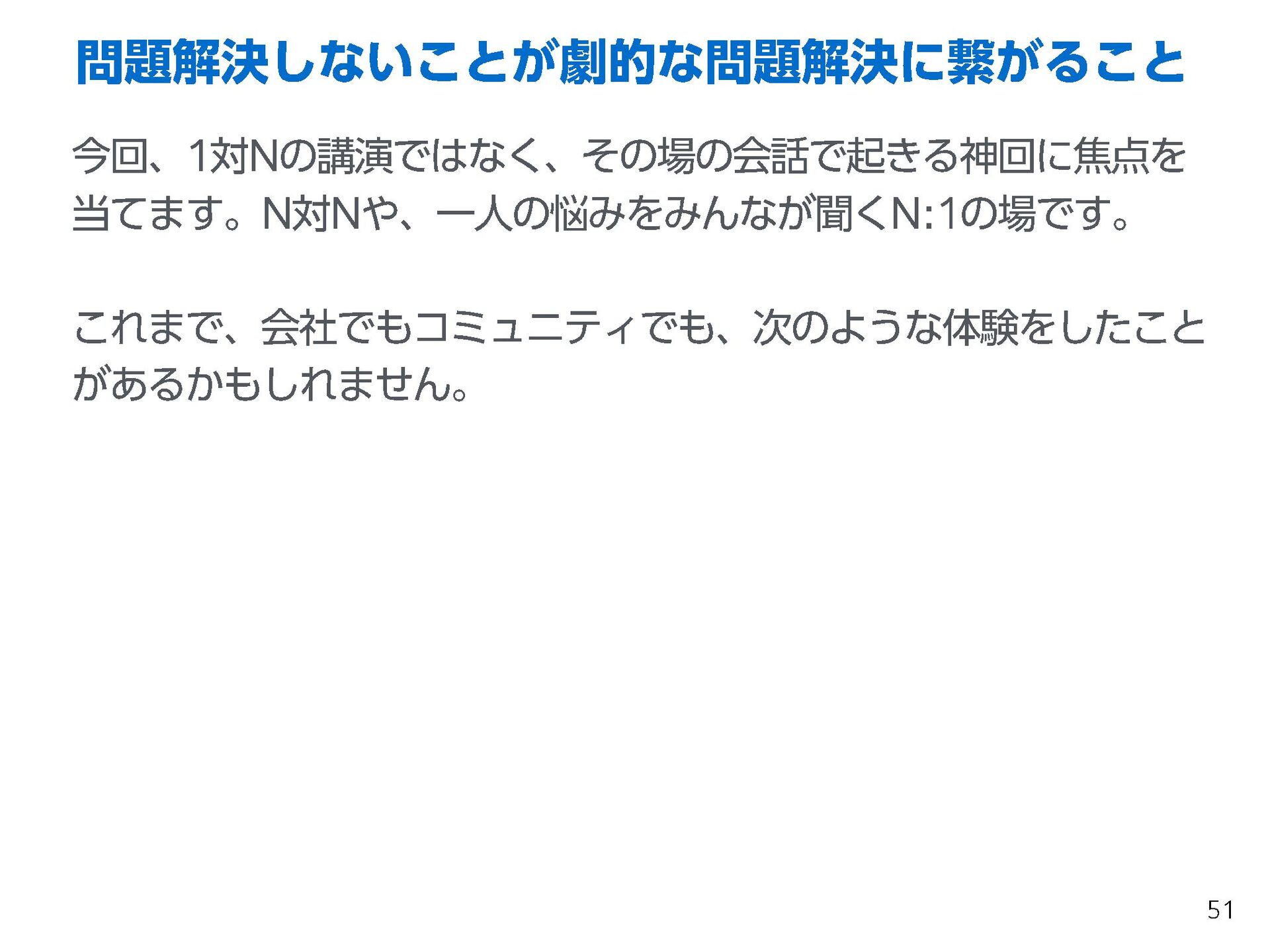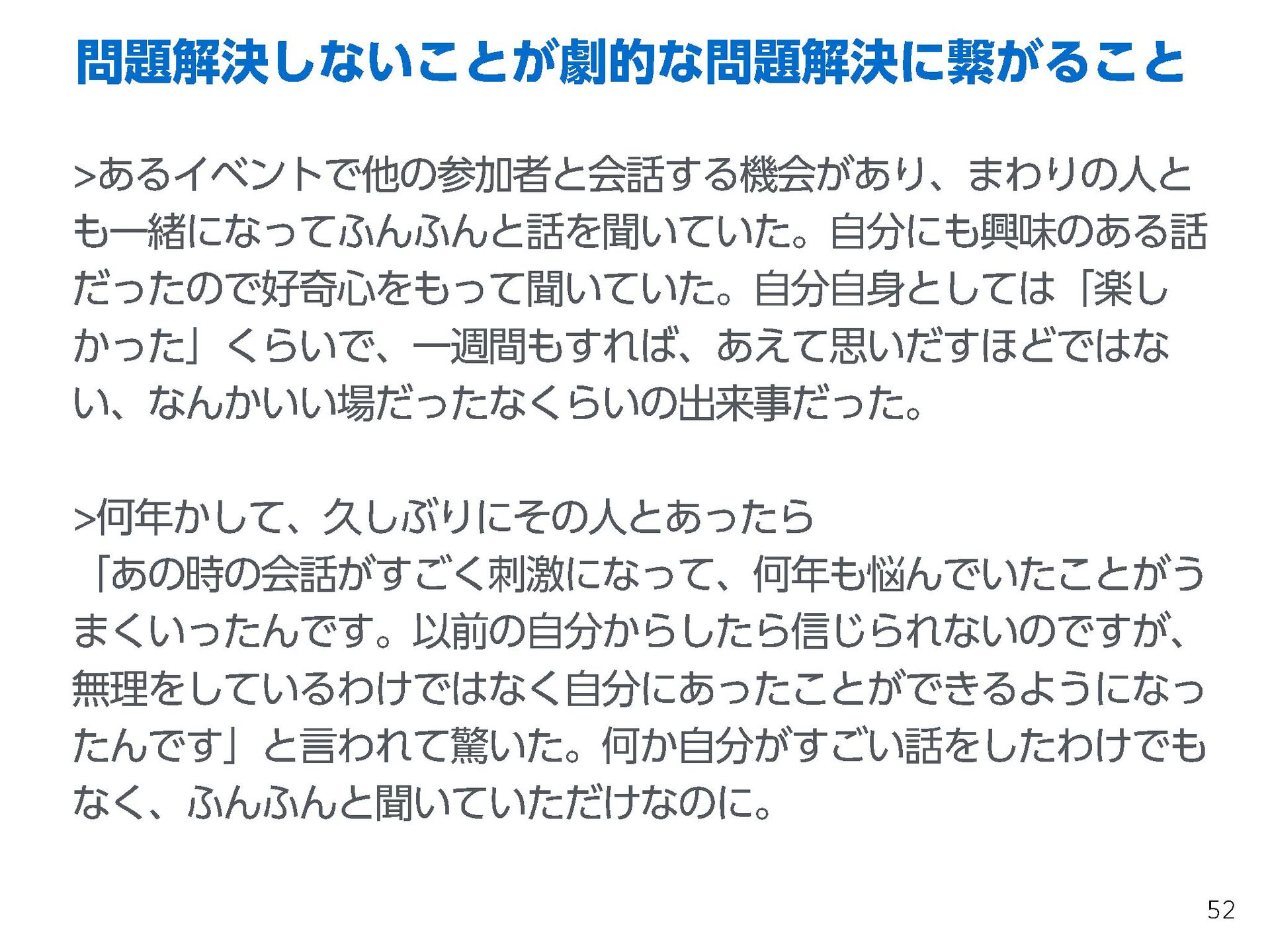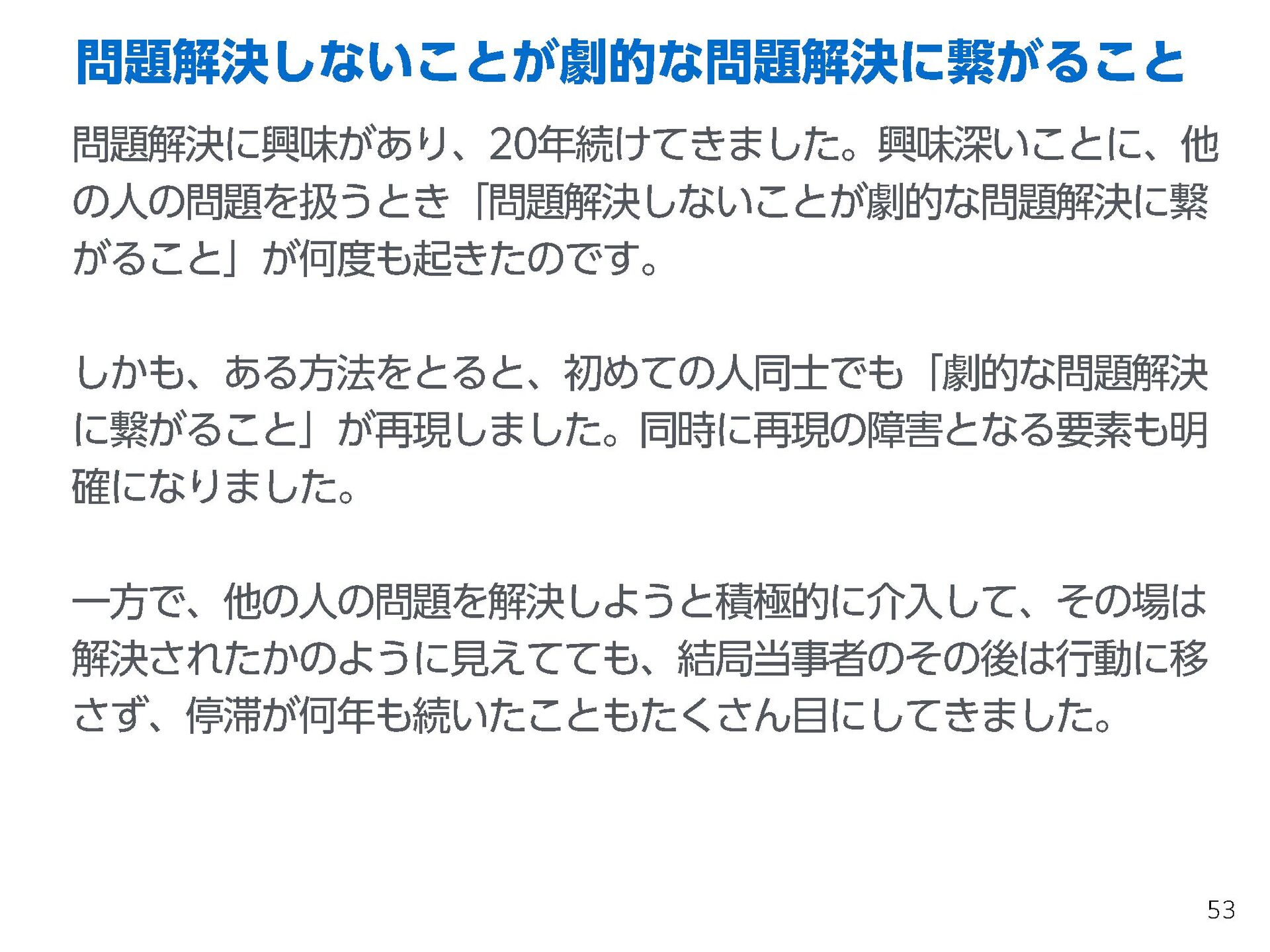 これらの活動の中で、私自身が劇的と感じる体験が何度もあり、自分の考えやふるまいを見直す結果に繋がりました。この体験は問題解決の書籍を学ぶことよりも、自分にとって大きな衝撃となり、強く興味を持つようになりました。それ以後、自主開催も行い、当事者にとって劇的なアウトカムを再現する試みを行ってきました。