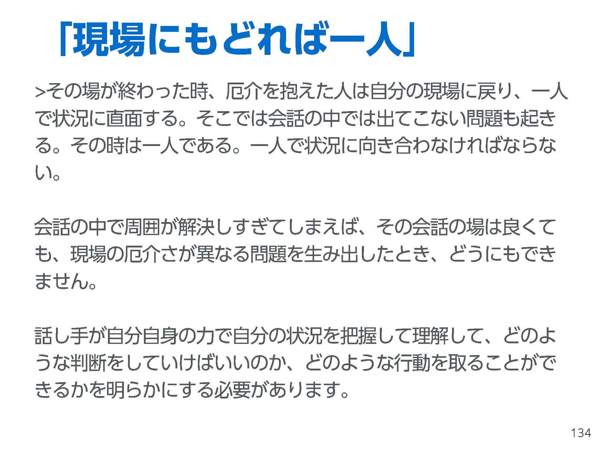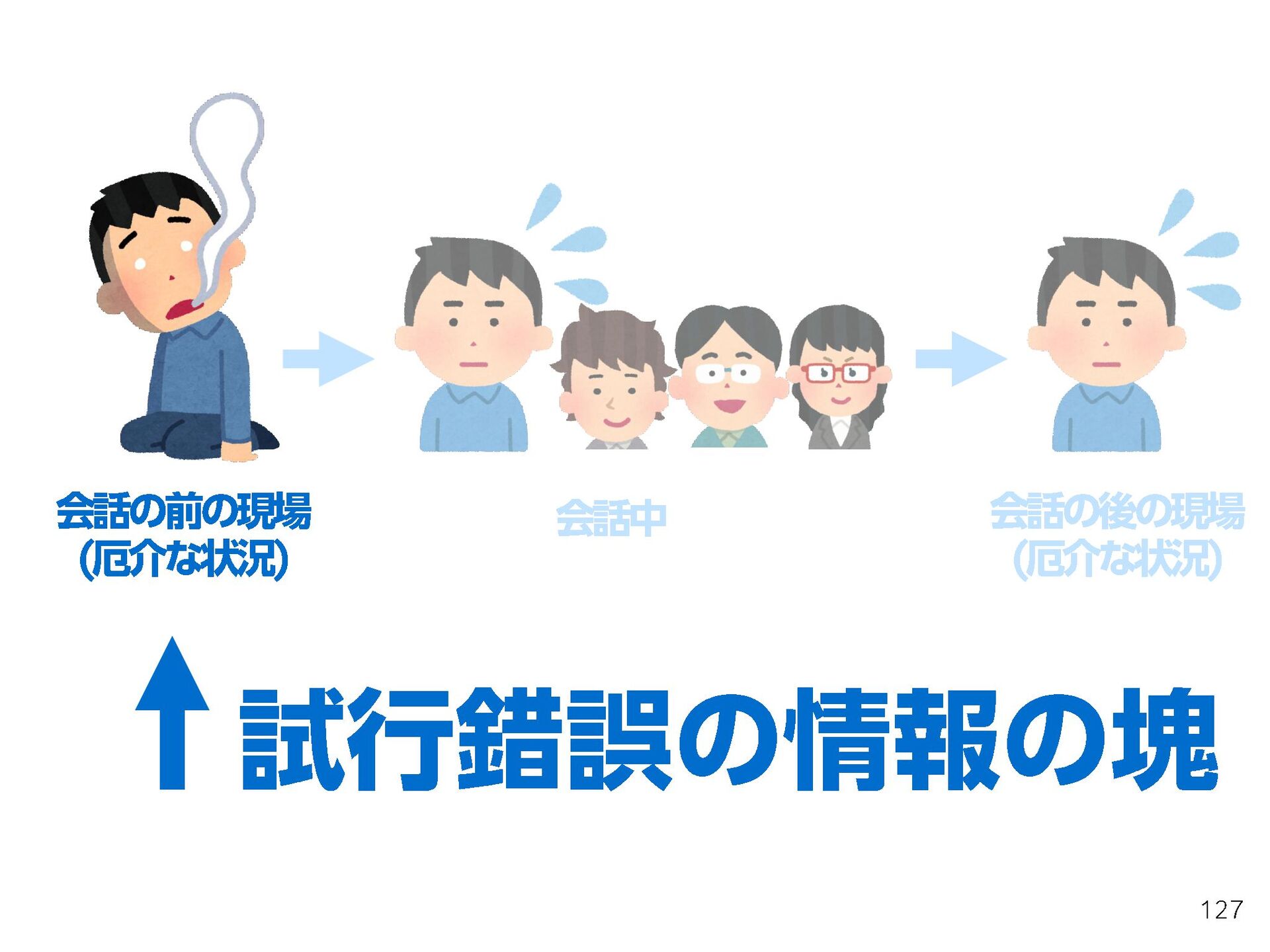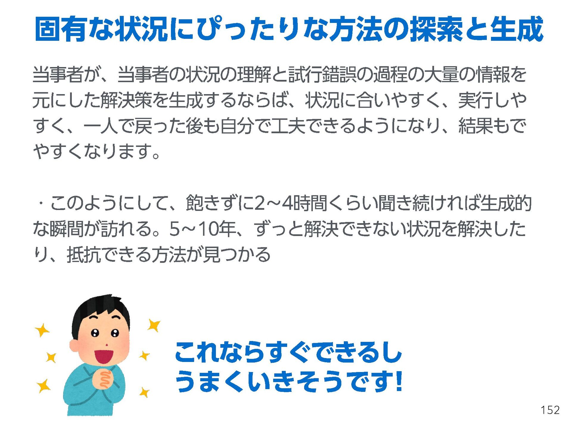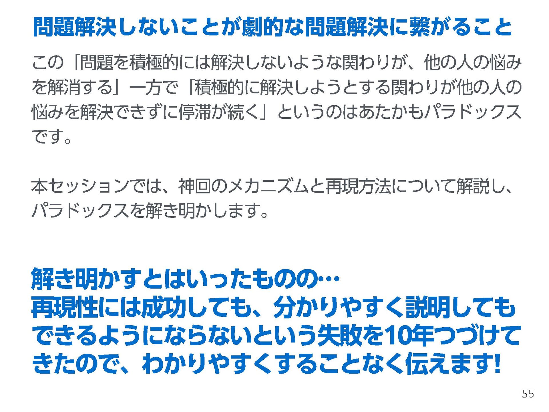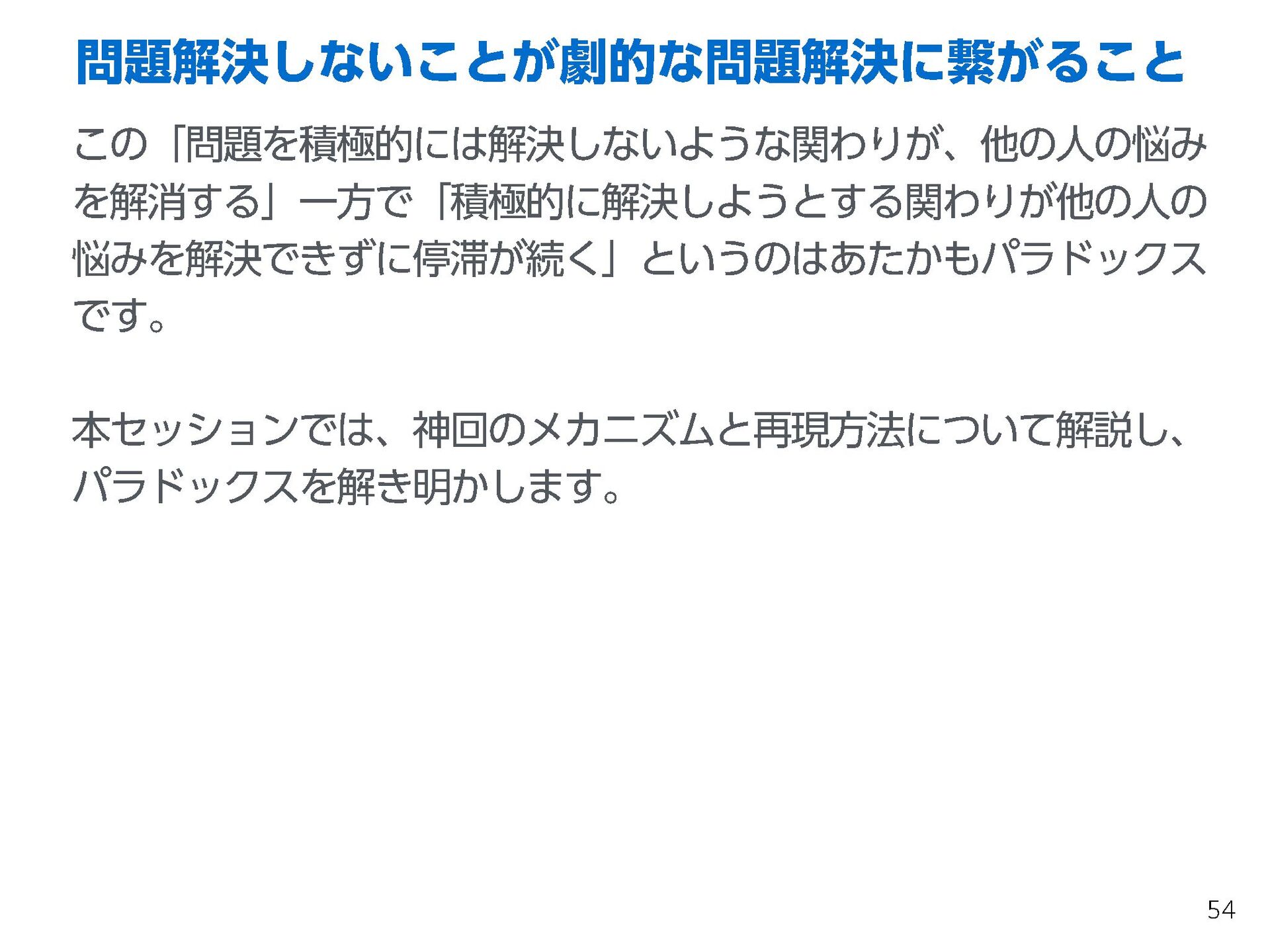 これらの活動の中で、私自身が劇的と感じる体験が何度もあり、自分の考えやふるまいを見直す結果に繋がりました。この体験は問題解決の書籍を学ぶことよりも、自分にとって大きな衝撃となり、強く興味を持つようになりました。それ以後、自主開催も行い、当事者にとって劇的なアウトカムを再現する試みを行ってきました。