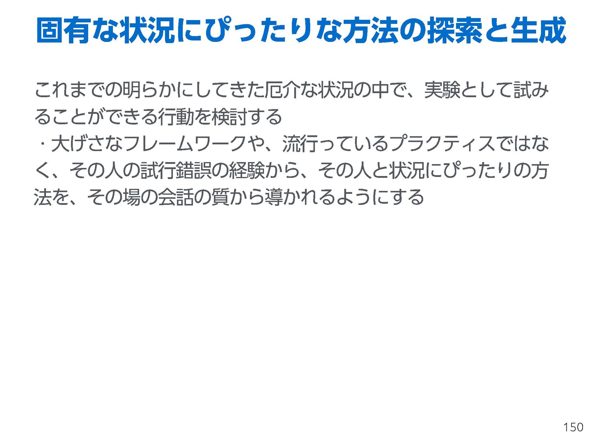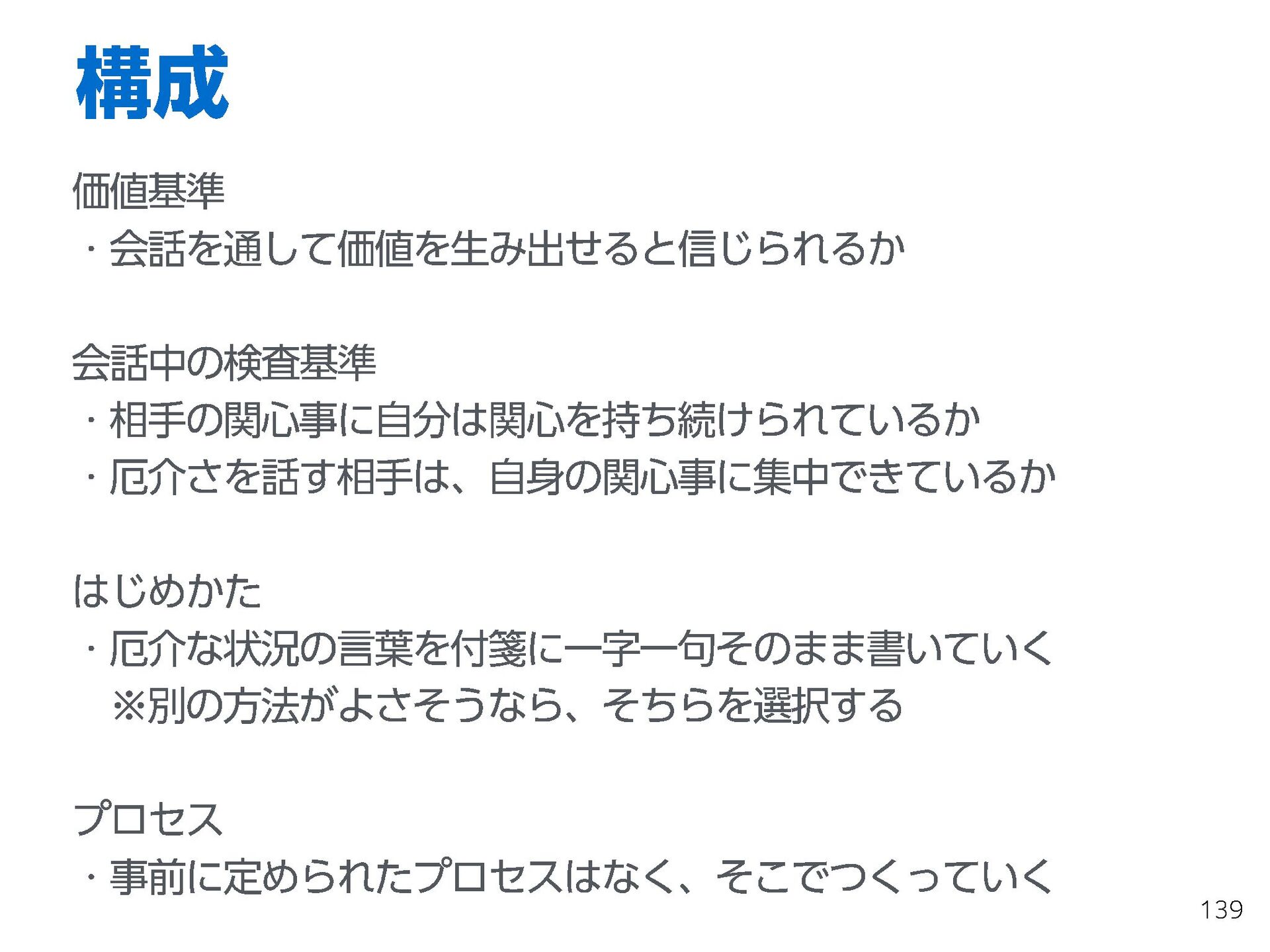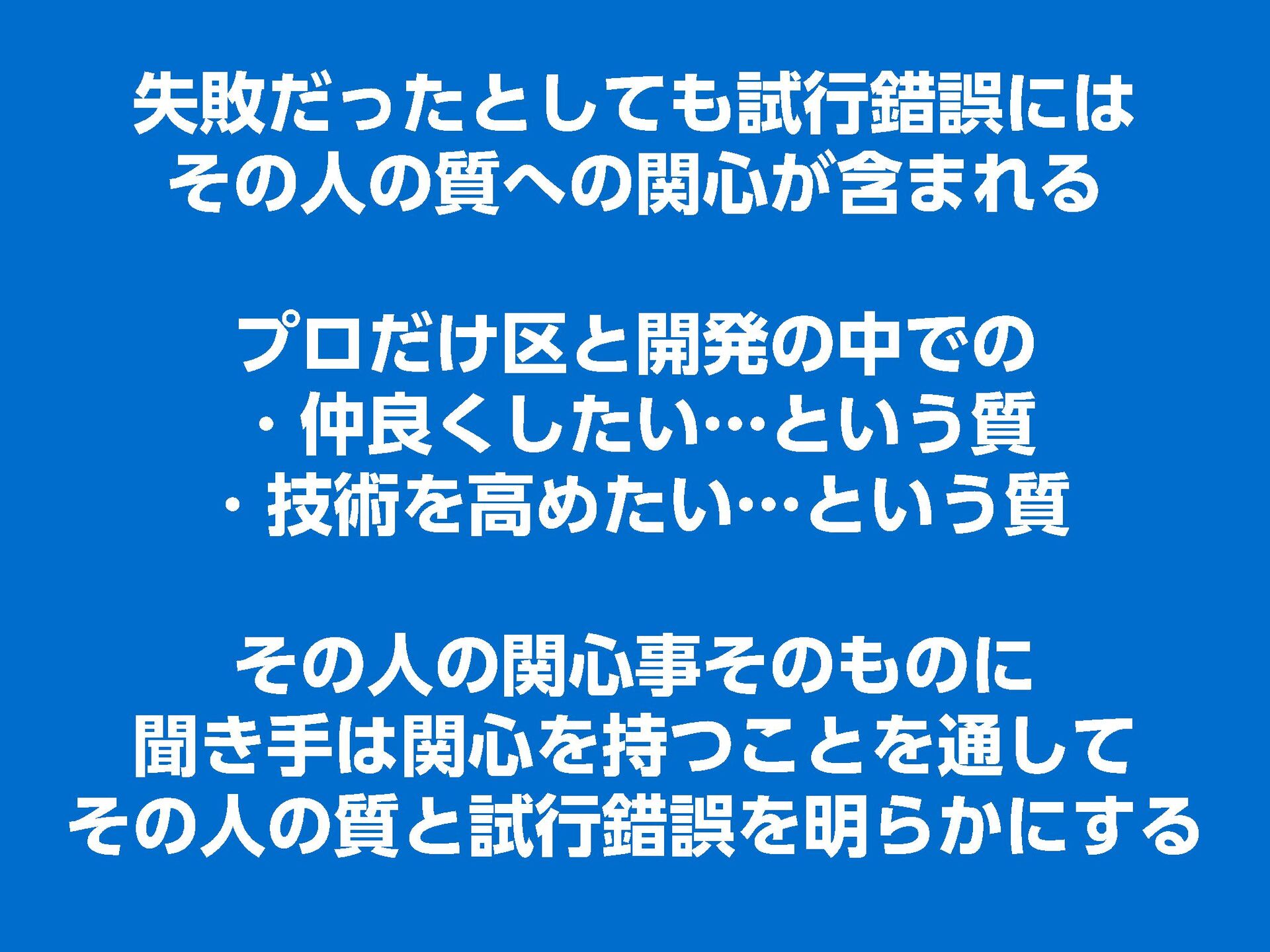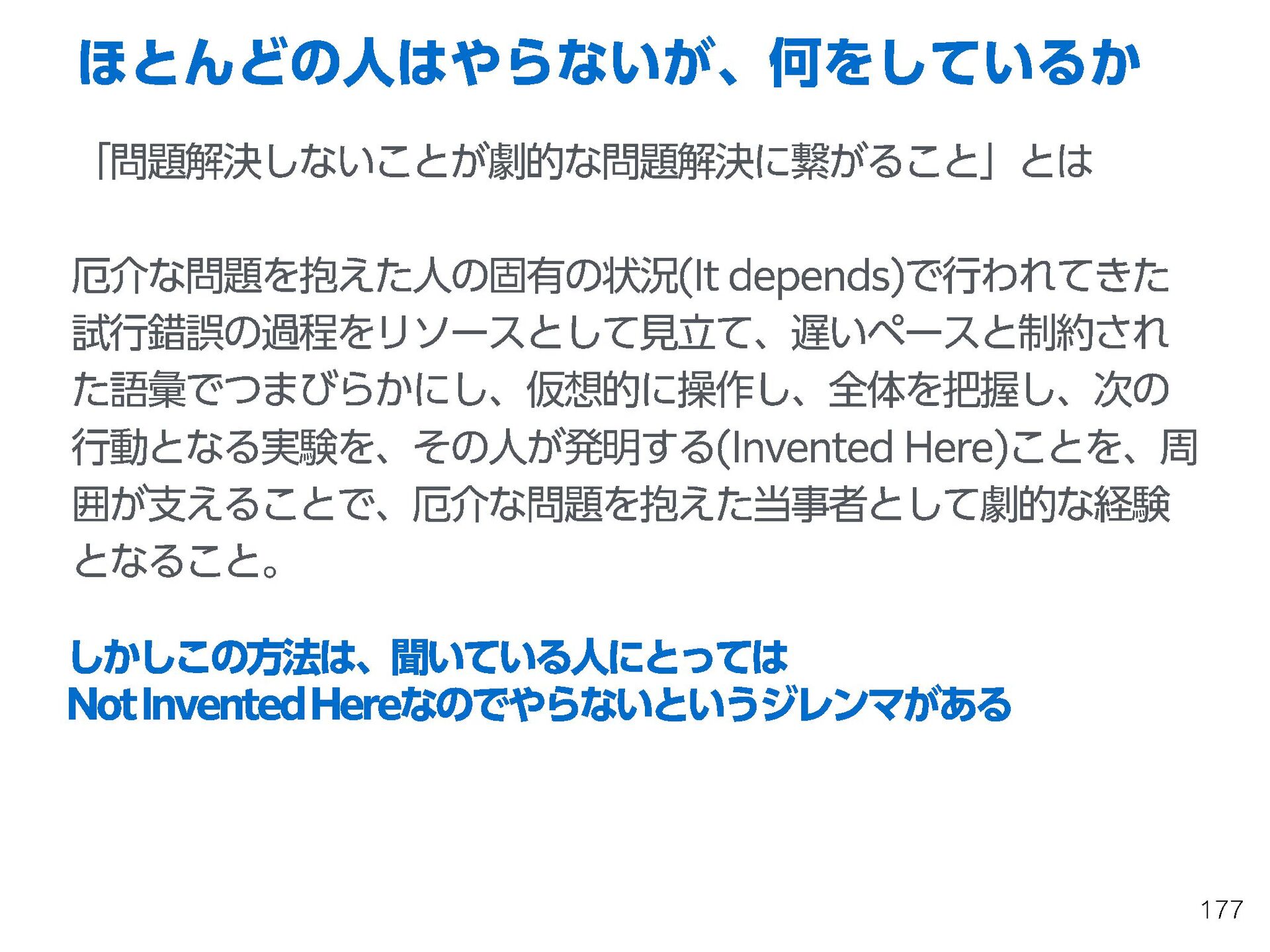 これらの活動の中で、私自身が劇的と感じる体験が何度もあり、自分の考えやふるまいを見直す結果に繋がりました。この体験は問題解決の書籍を学ぶことよりも、自分にとって大きな衝撃となり、強く興味を持つようになりました。それ以後、自主開催も行い、当事者にとって劇的なアウトカムを再現する試みを行ってきました。