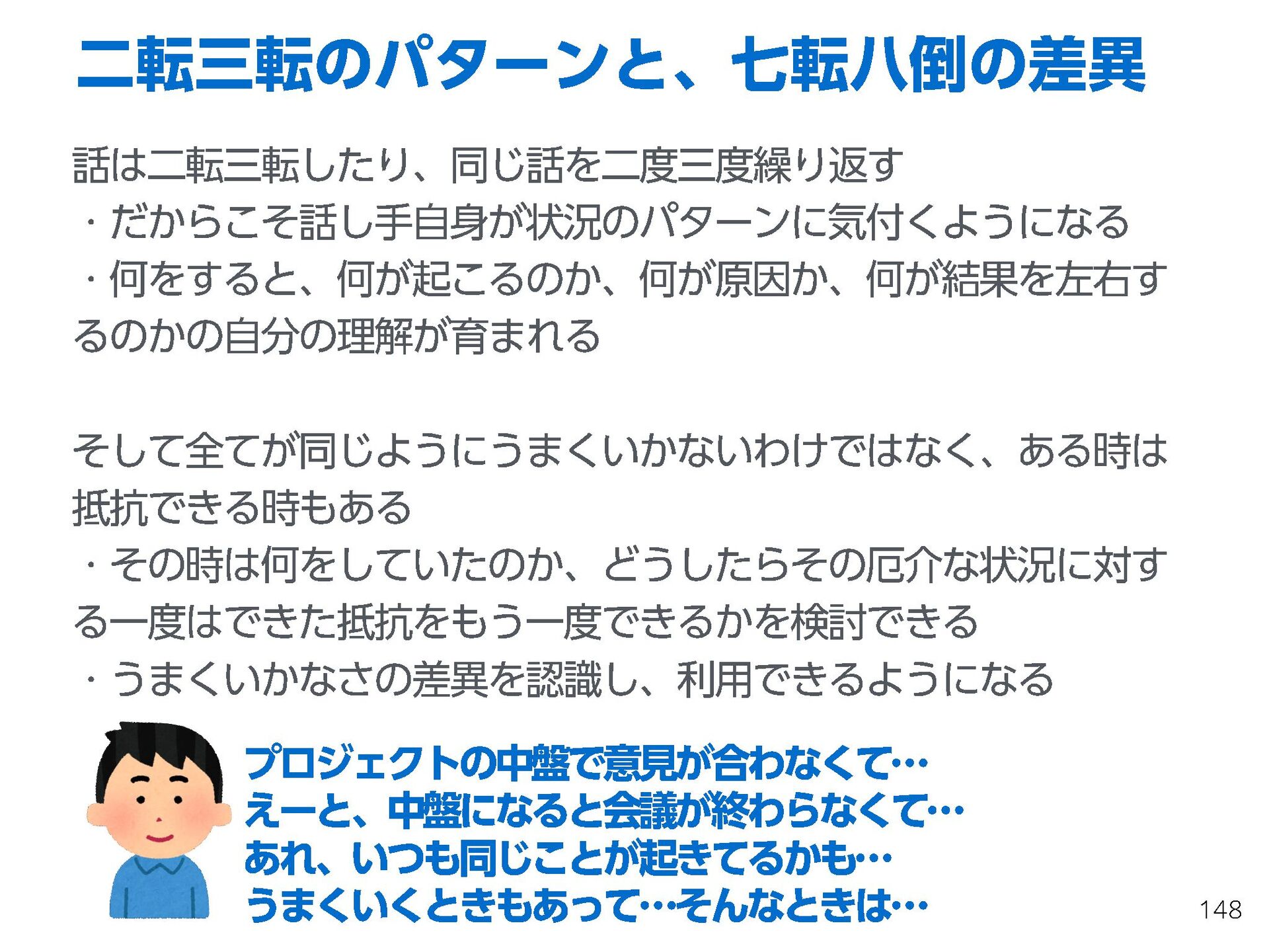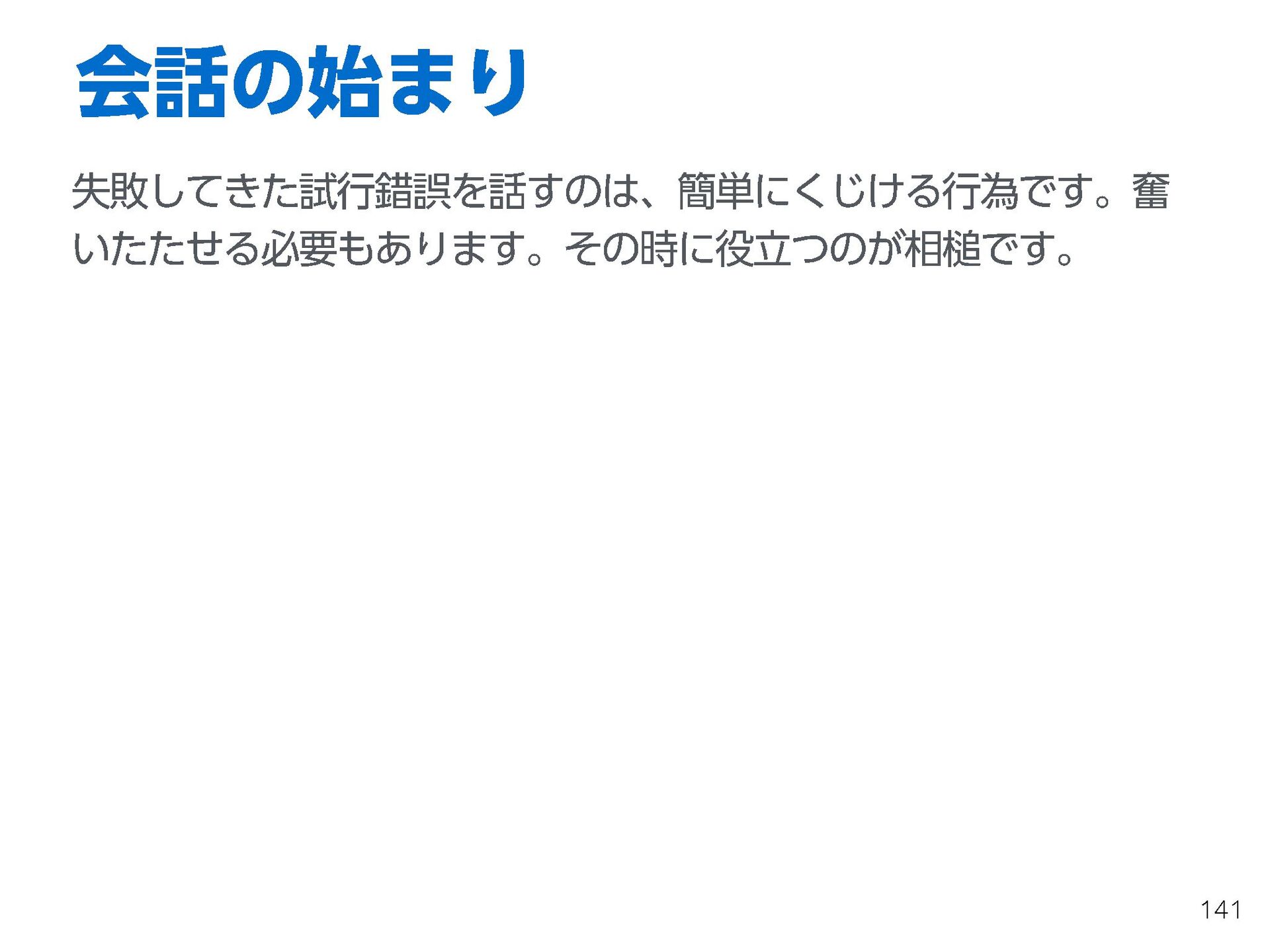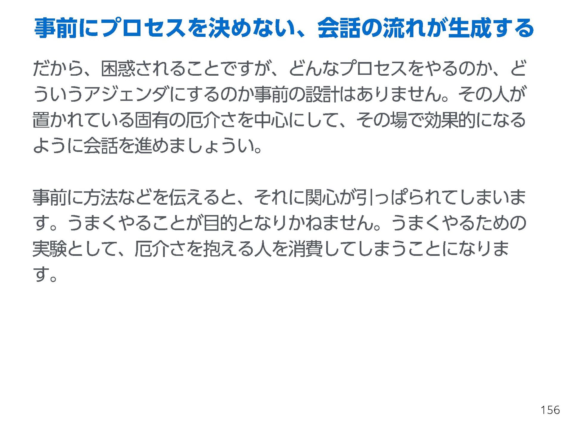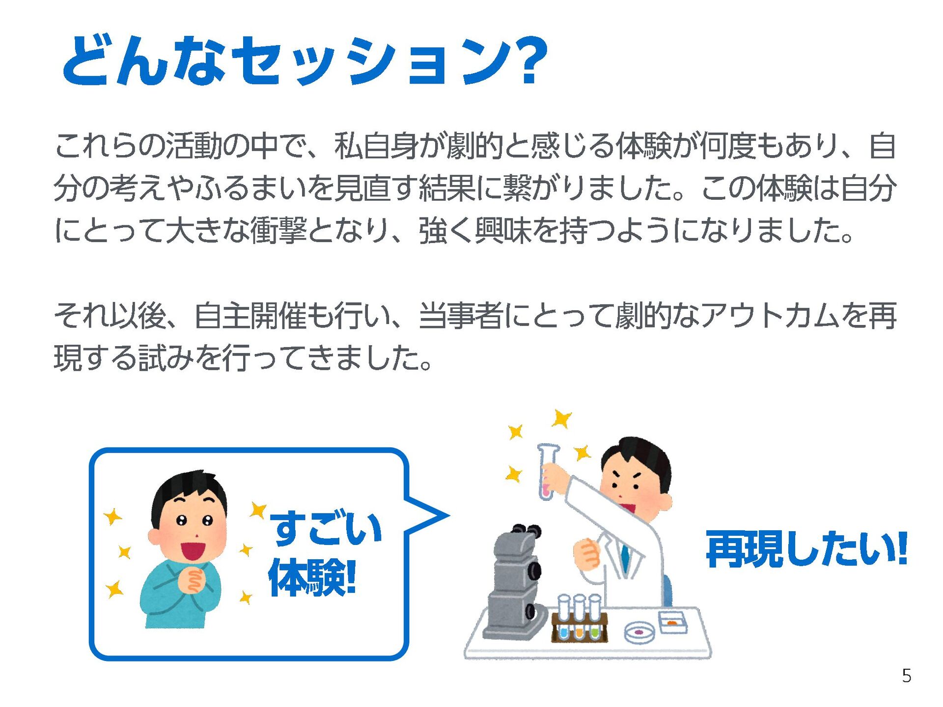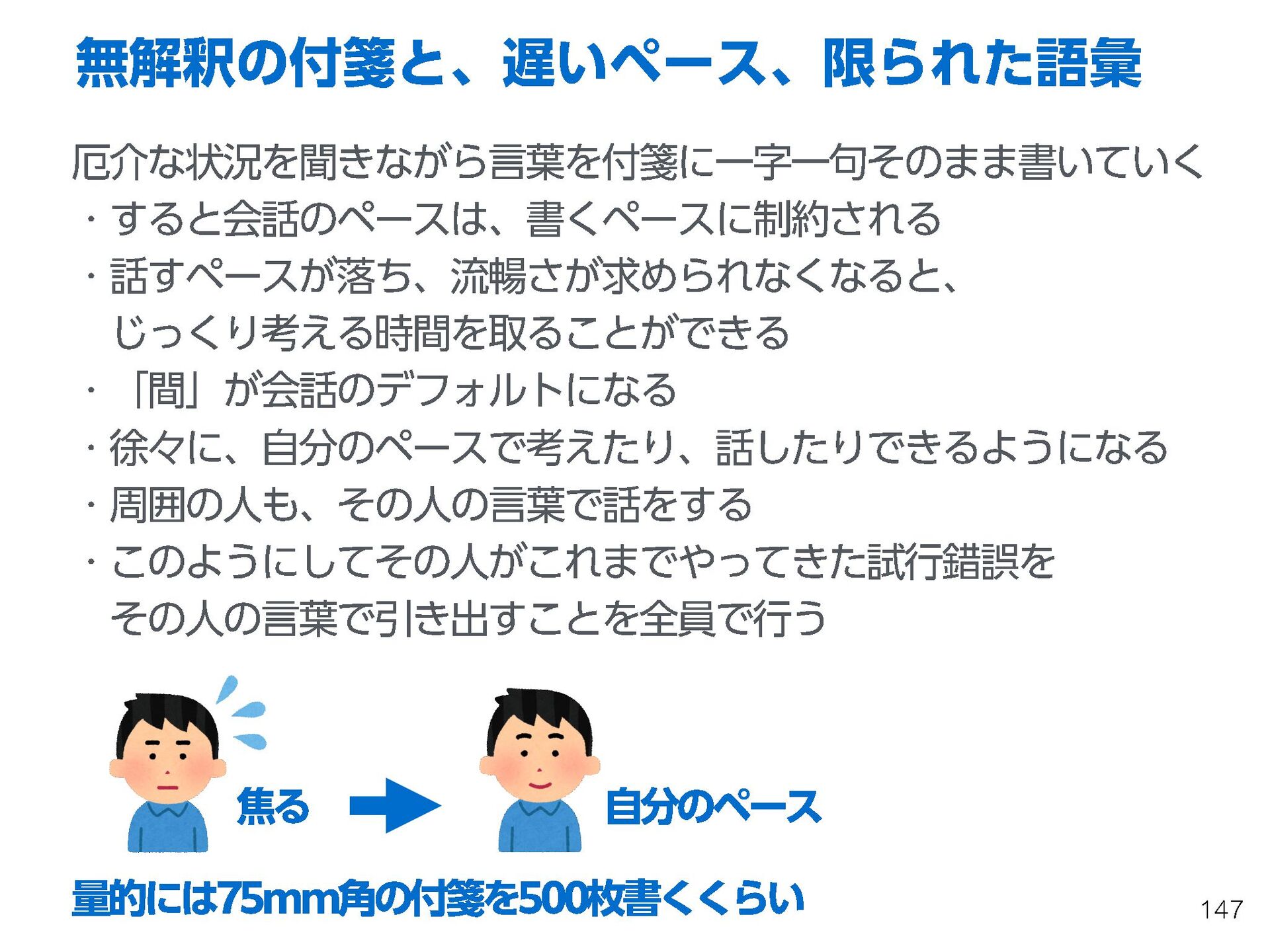 これらの活動の中で、私自身が劇的と感じる体験が何度もあり、自分の考えやふるまいを見直す結果に繋がりました。この体験は問題解決の書籍を学ぶことよりも、自分にとって大きな衝撃となり、強く興味を持つようになりました。それ以後、自主開催も行い、当事者にとって劇的なアウトカムを再現する試みを行ってきました。
