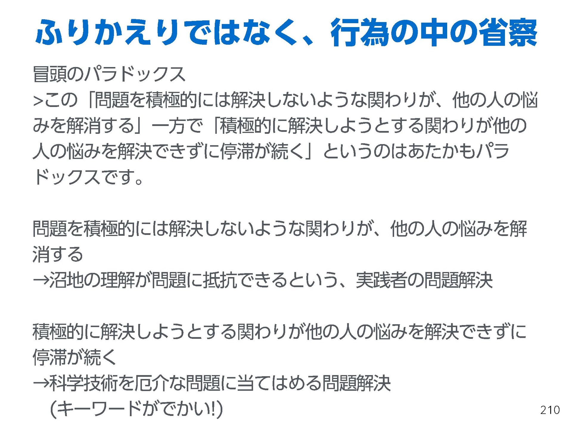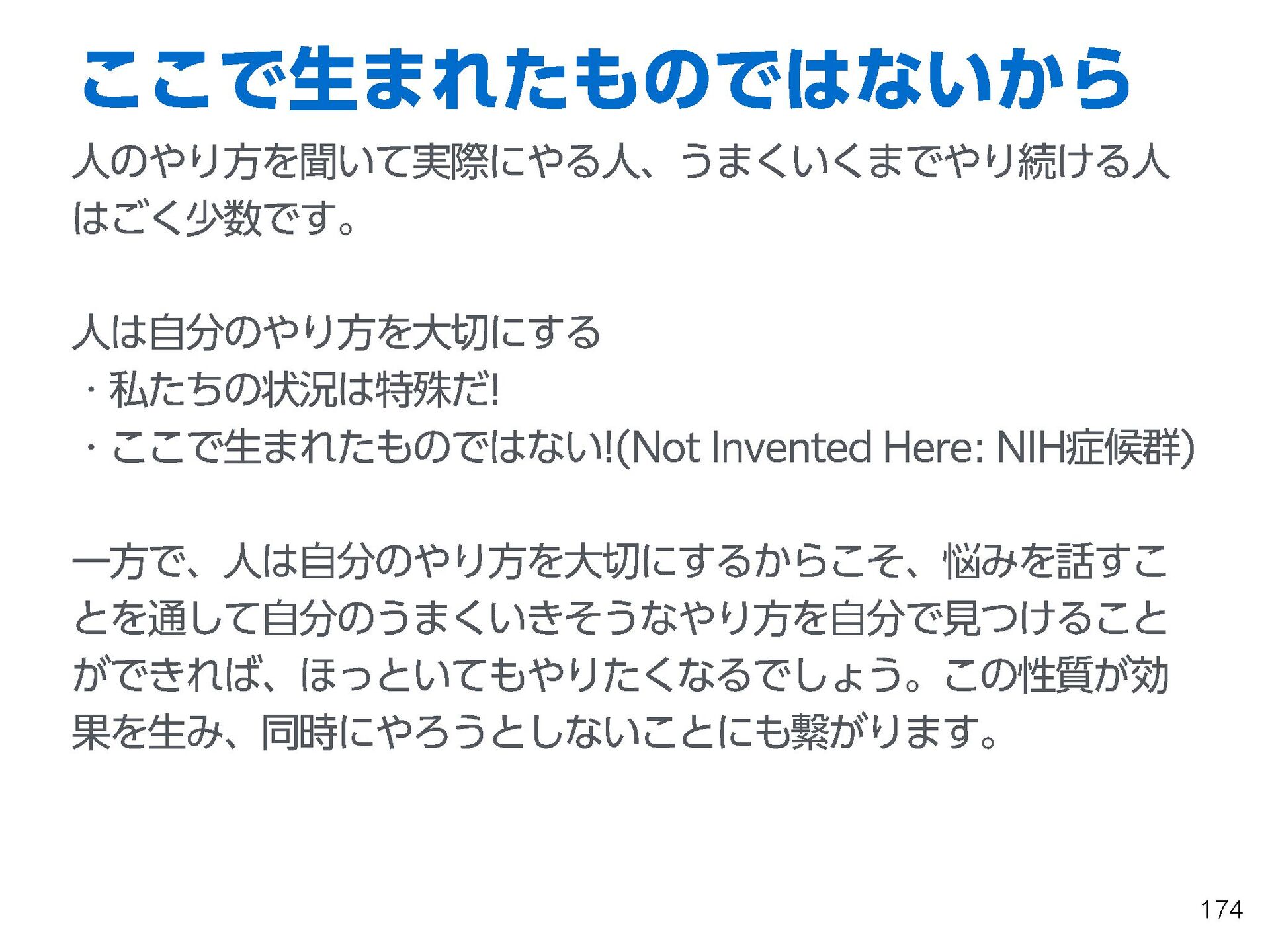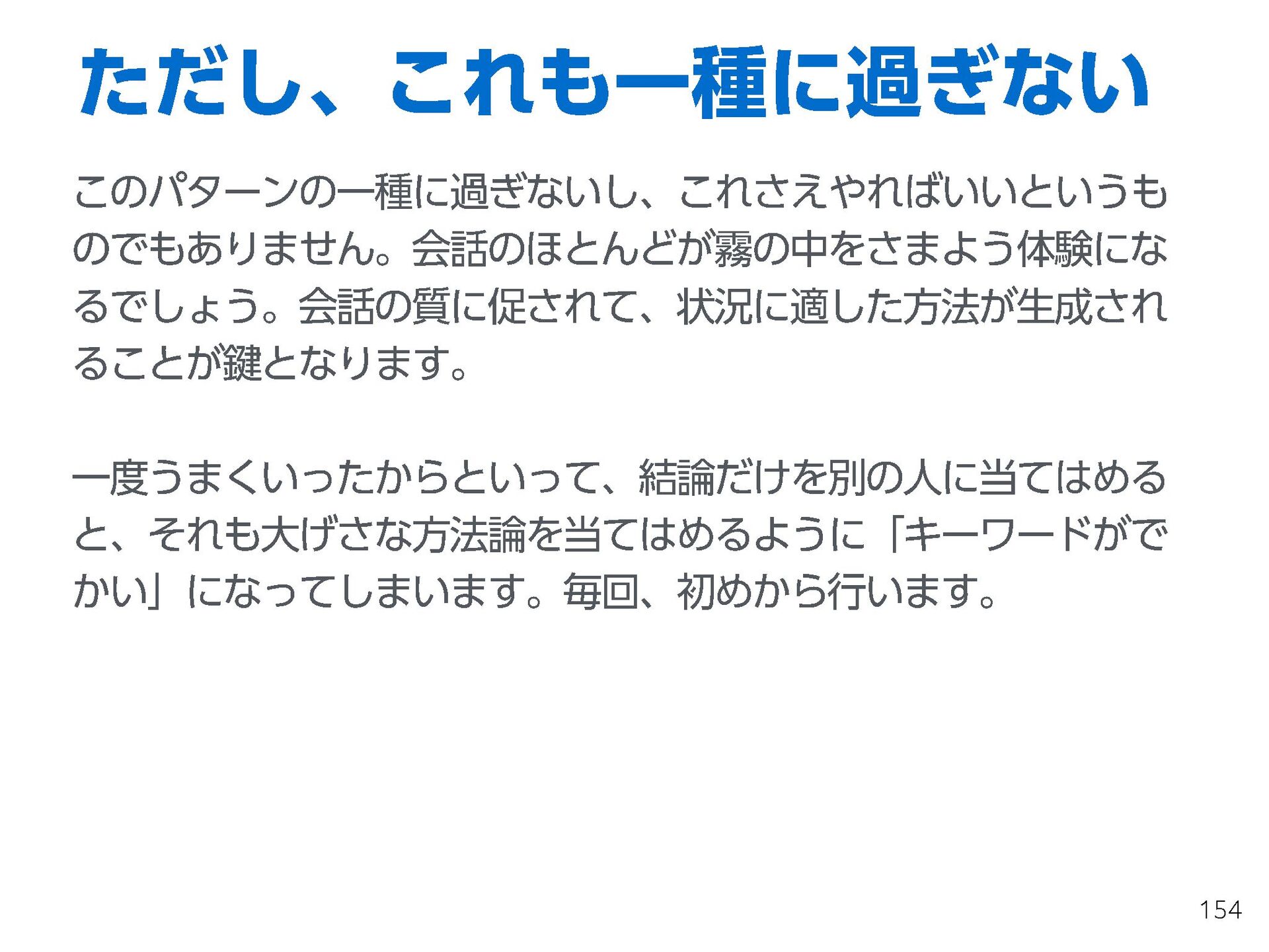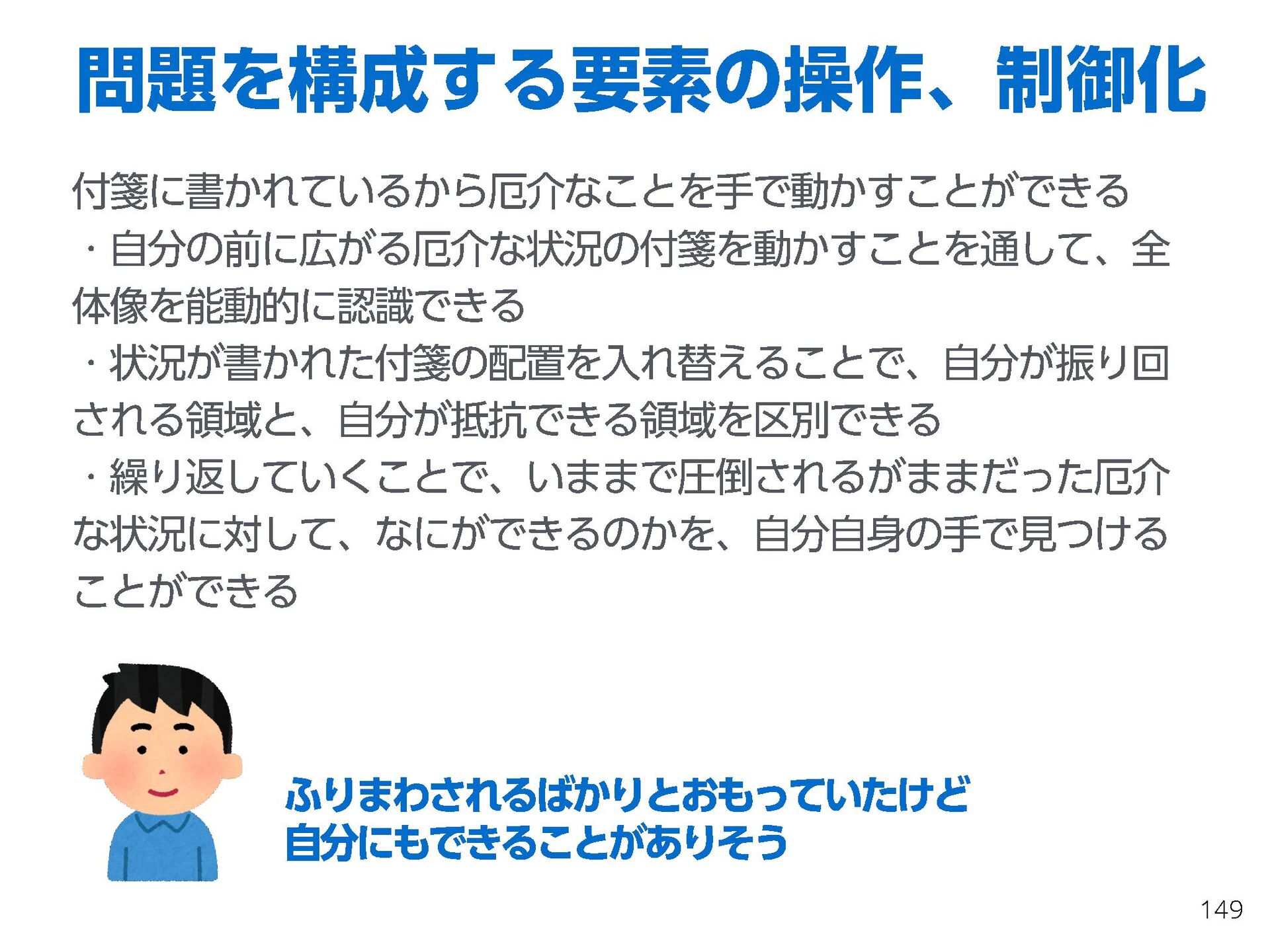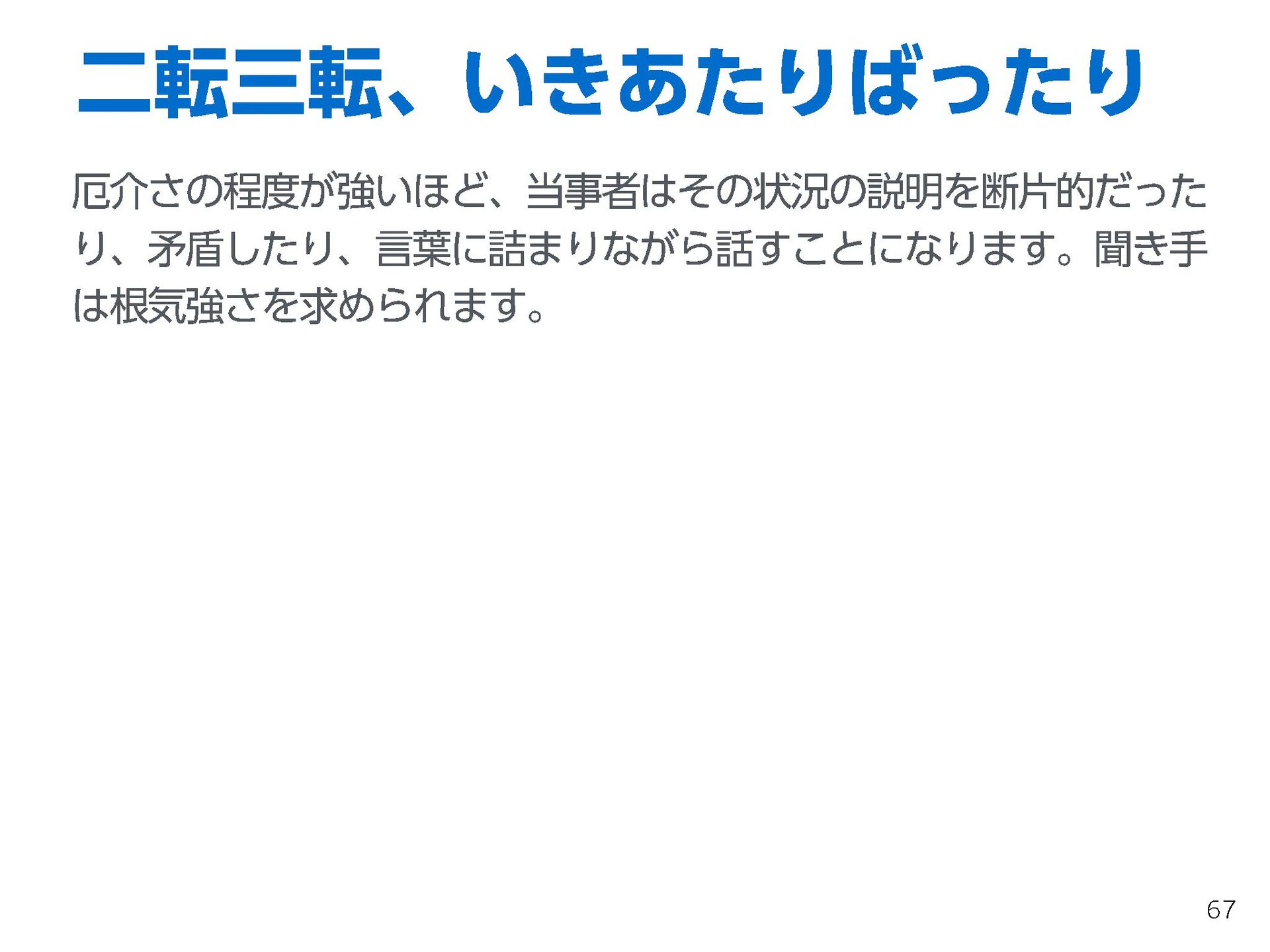 これらの活動の中で、私自身が劇的と感じる体験が何度もあり、自分の考えやふるまいを見直す結果に繋がりました。この体験は問題解決の書籍を学ぶことよりも、自分にとって大きな衝撃となり、強く興味を持つようになりました。それ以後、自主開催も行い、当事者にとって劇的なアウトカムを再現する試みを行ってきました。