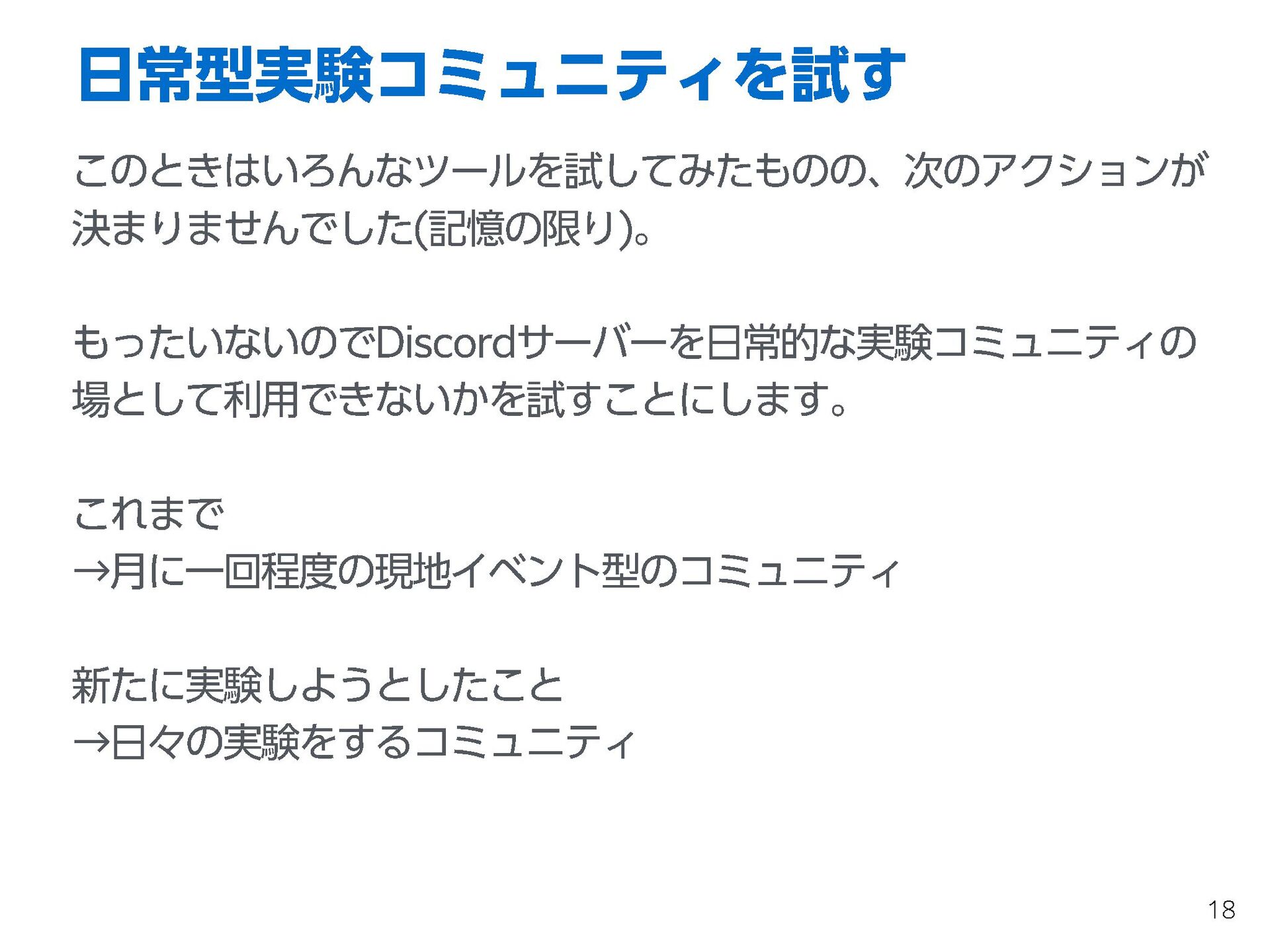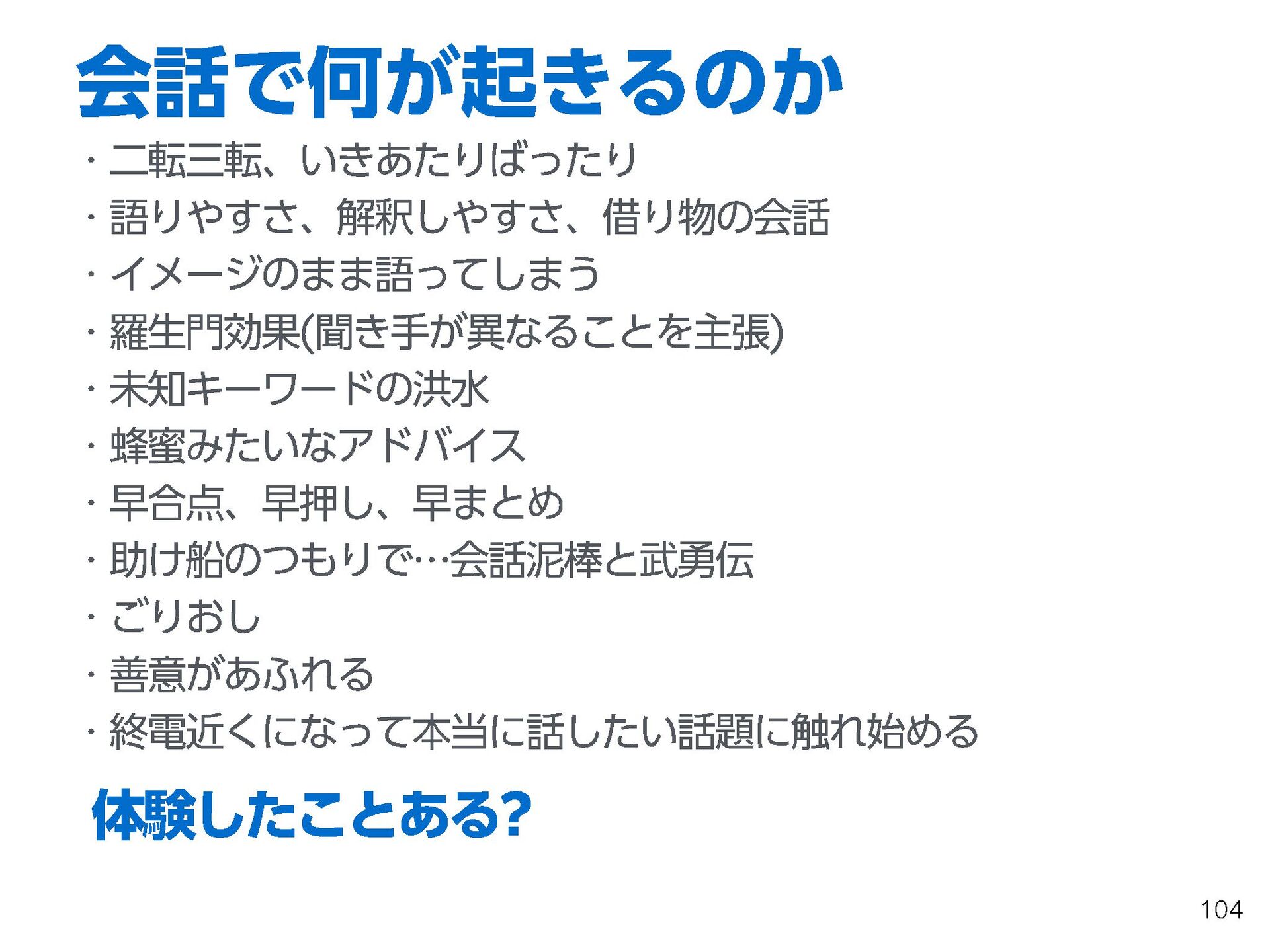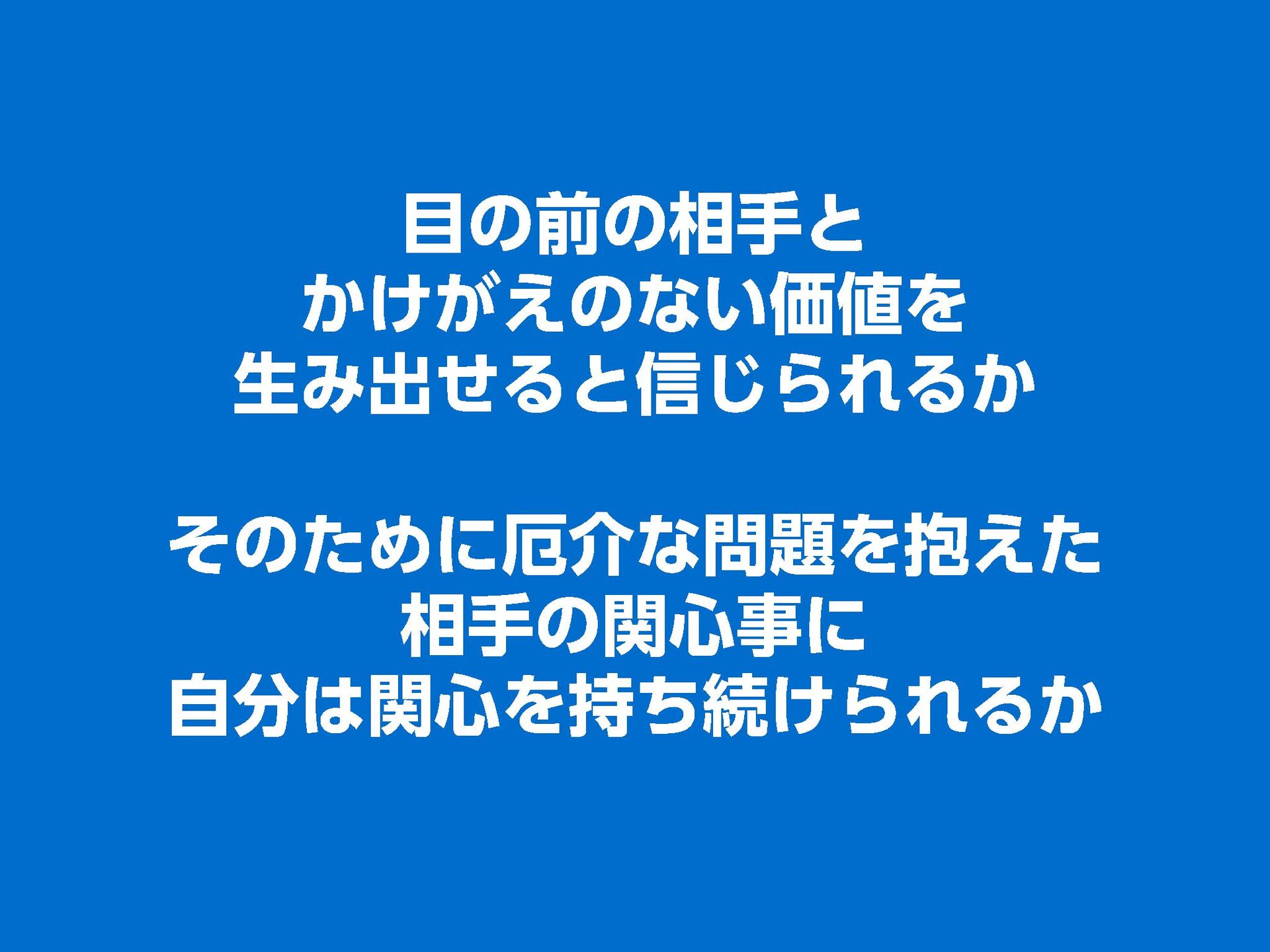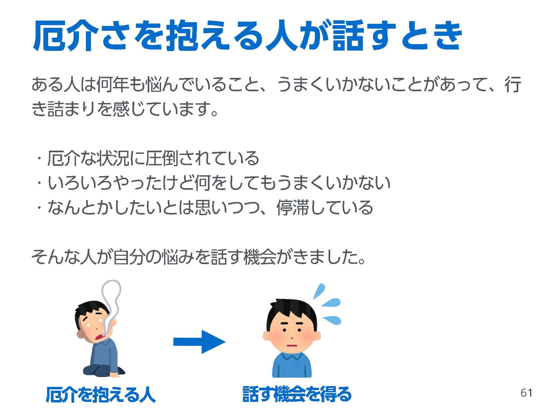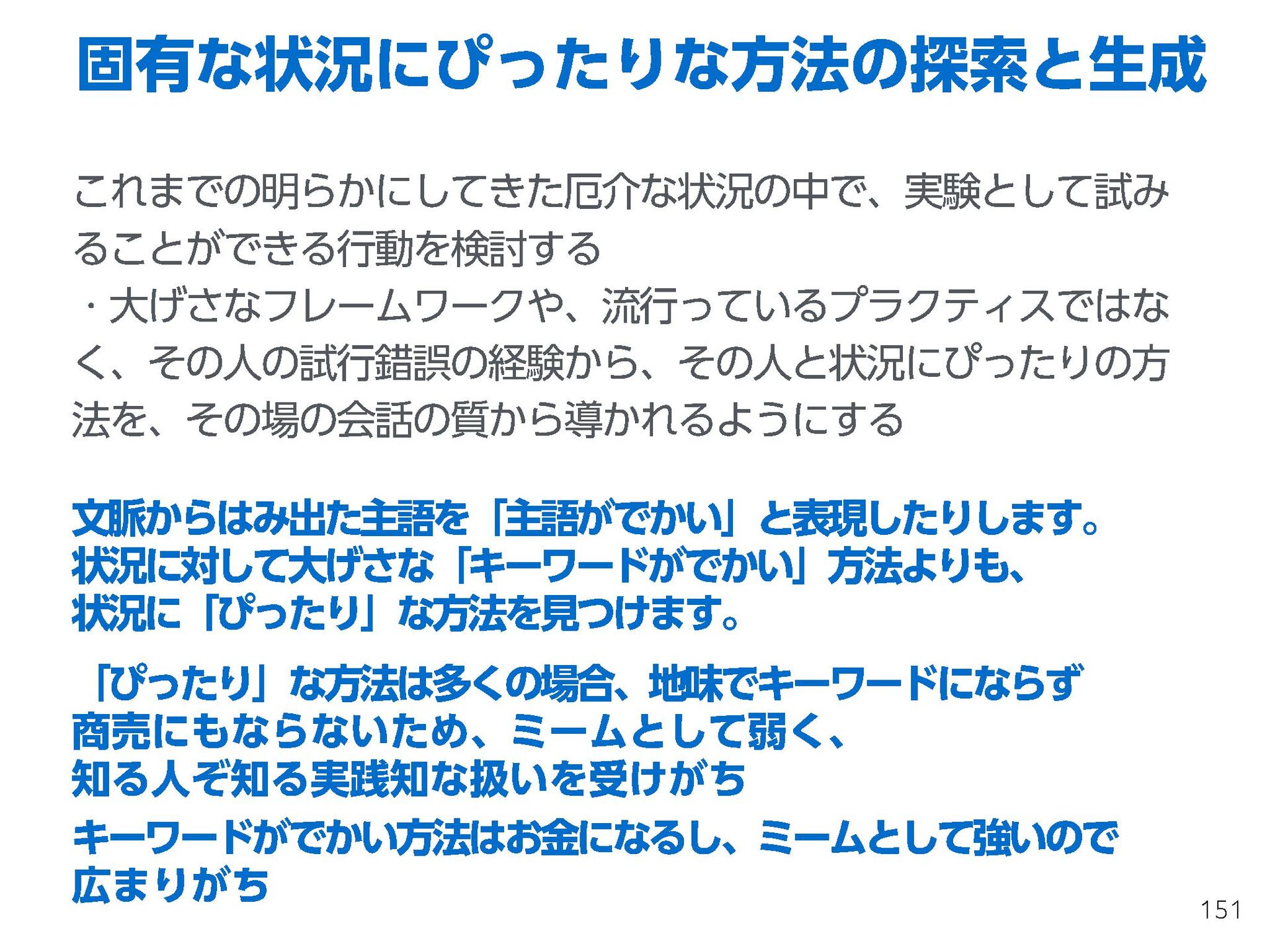 これらの活動の中で、私自身が劇的と感じる体験が何度もあり、自分の考えやふるまいを見直す結果に繋がりました。この体験は問題解決の書籍を学ぶことよりも、自分にとって大きな衝撃となり、強く興味を持つようになりました。それ以後、自主開催も行い、当事者にとって劇的なアウトカムを再現する試みを行ってきました。