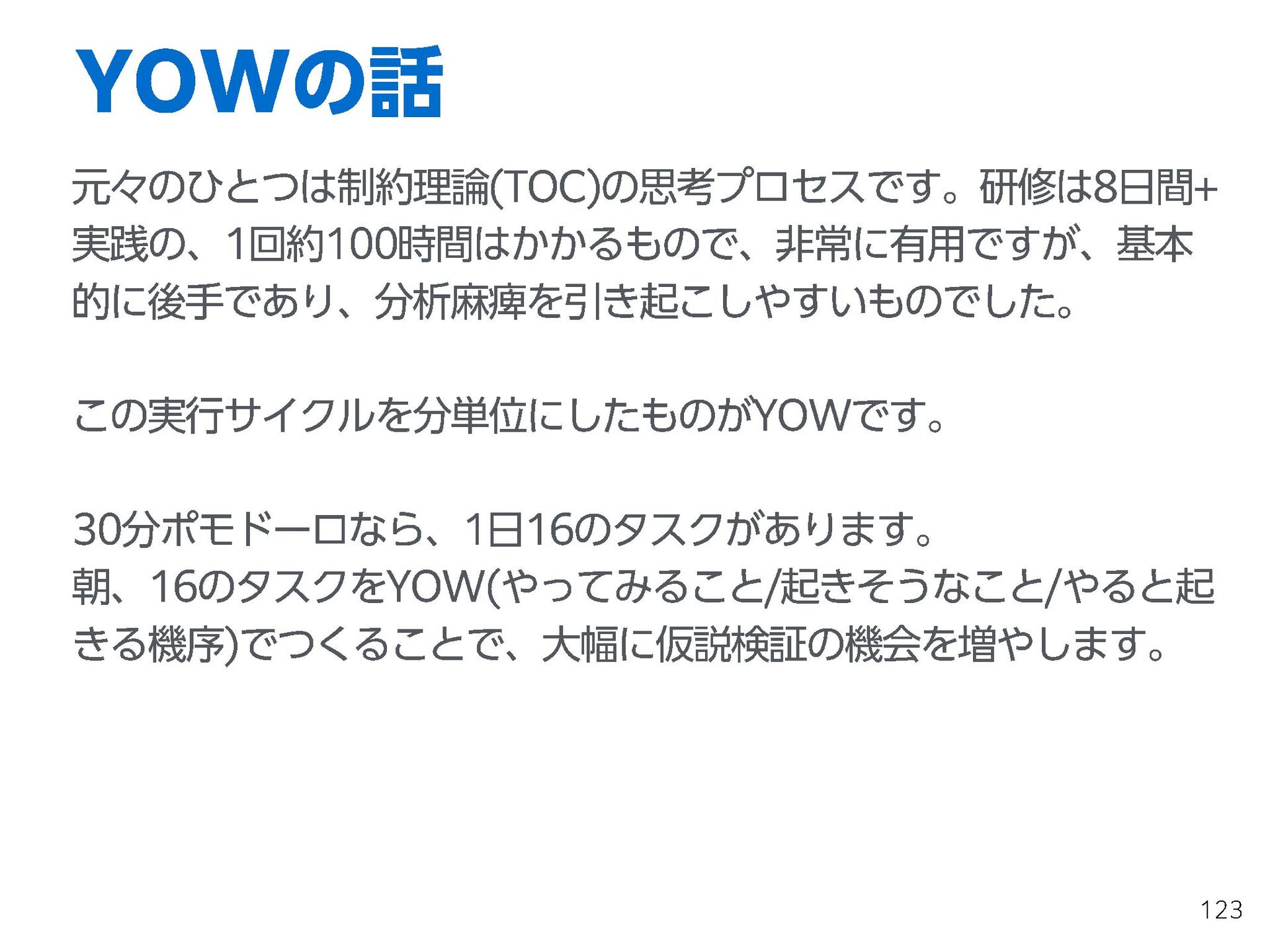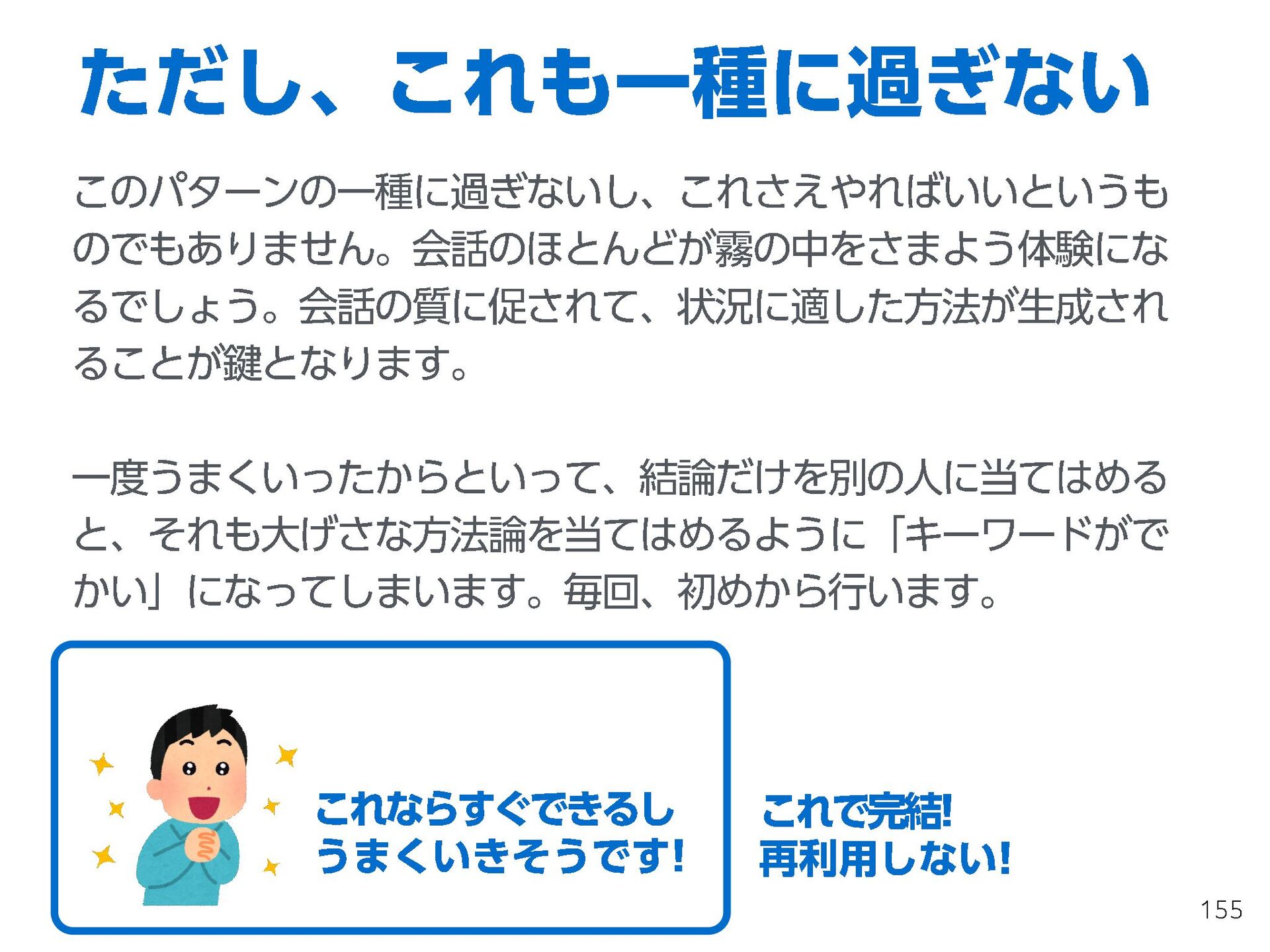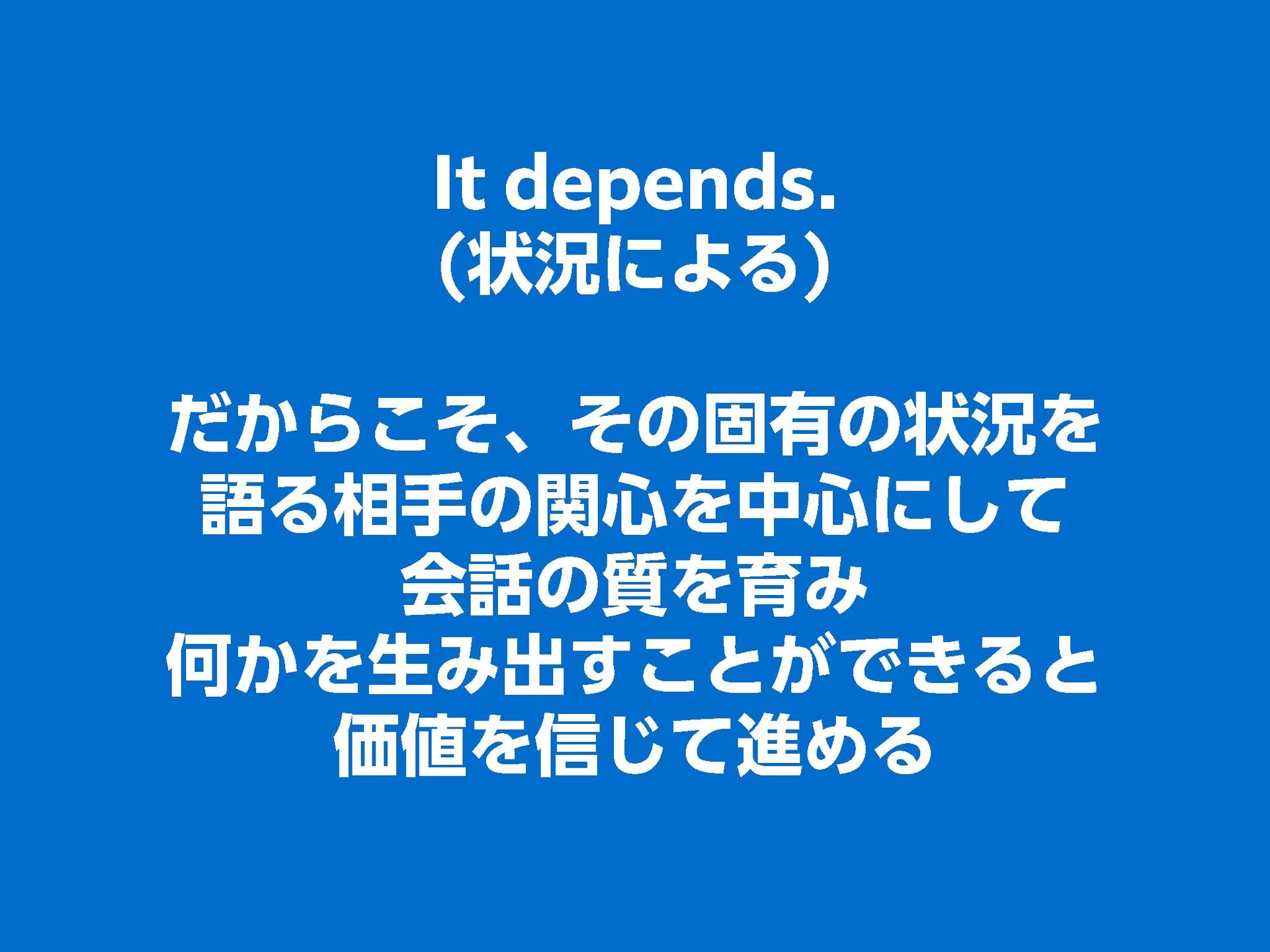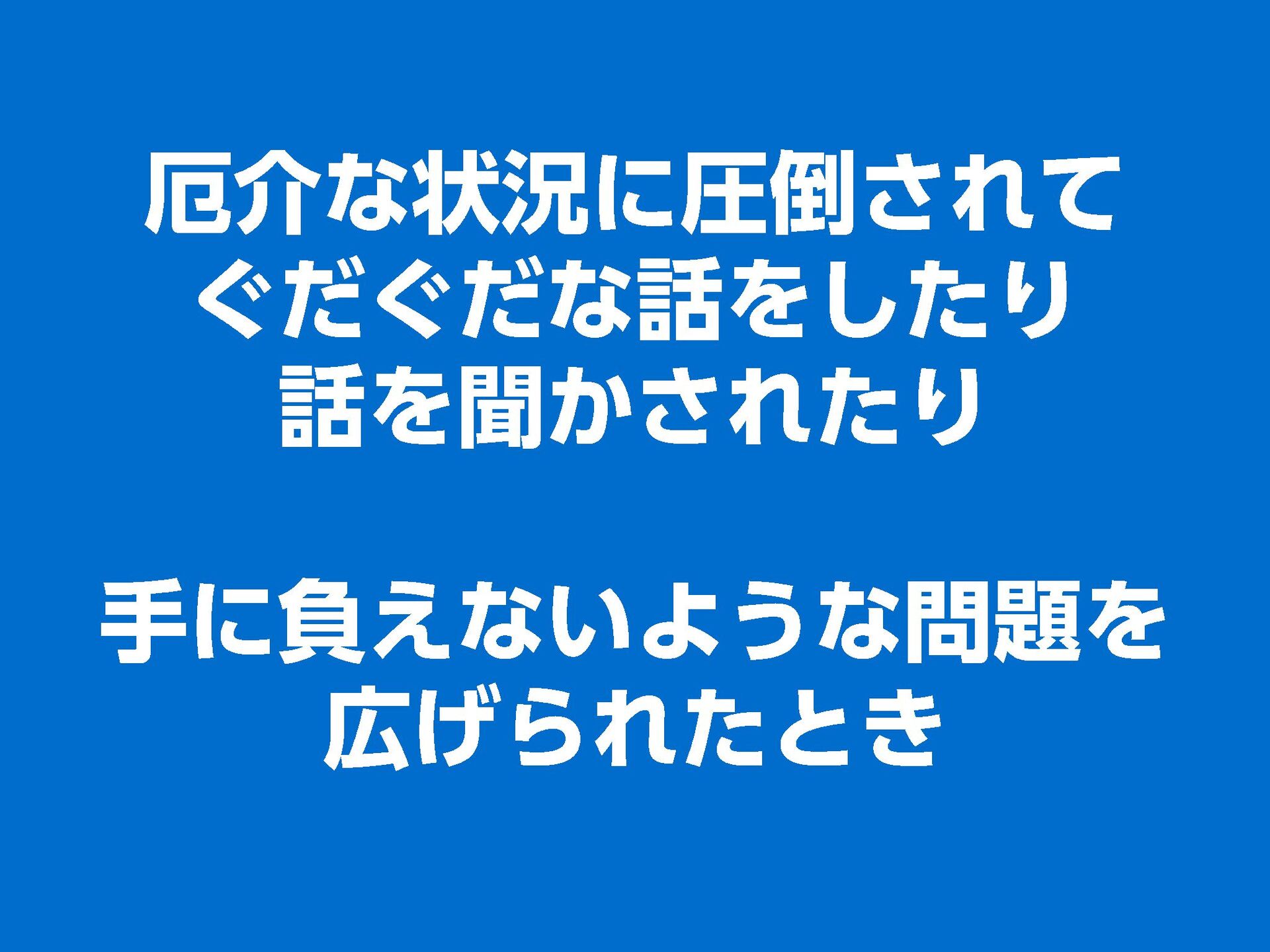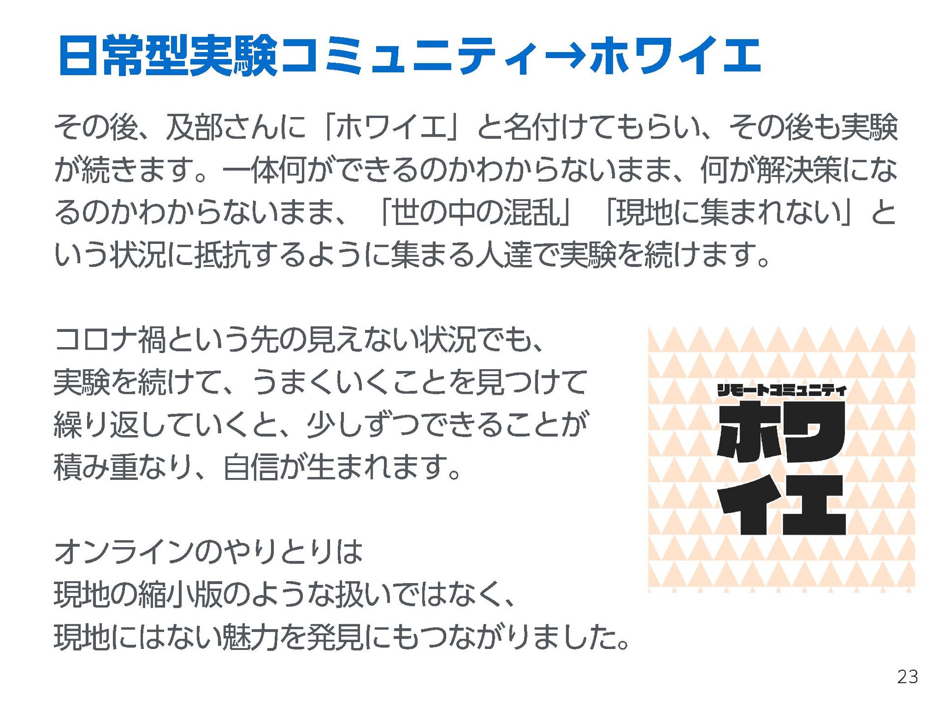 これらの活動の中で、私自身が劇的と感じる体験が何度もあり、自分の考えやふるまいを見直す結果に繋がりました。この体験は問題解決の書籍を学ぶことよりも、自分にとって大きな衝撃となり、強く興味を持つようになりました。それ以後、自主開催も行い、当事者にとって劇的なアウトカムを再現する試みを行ってきました。